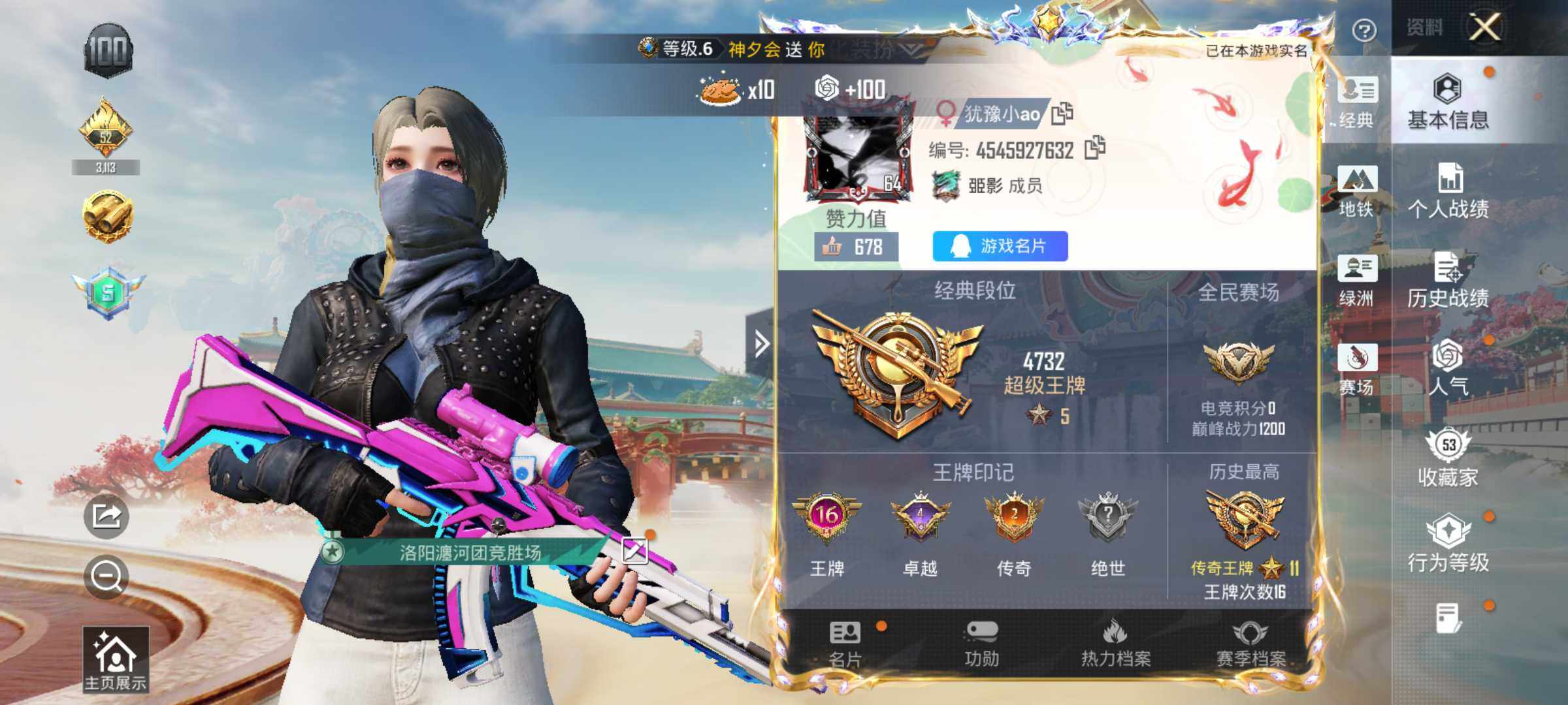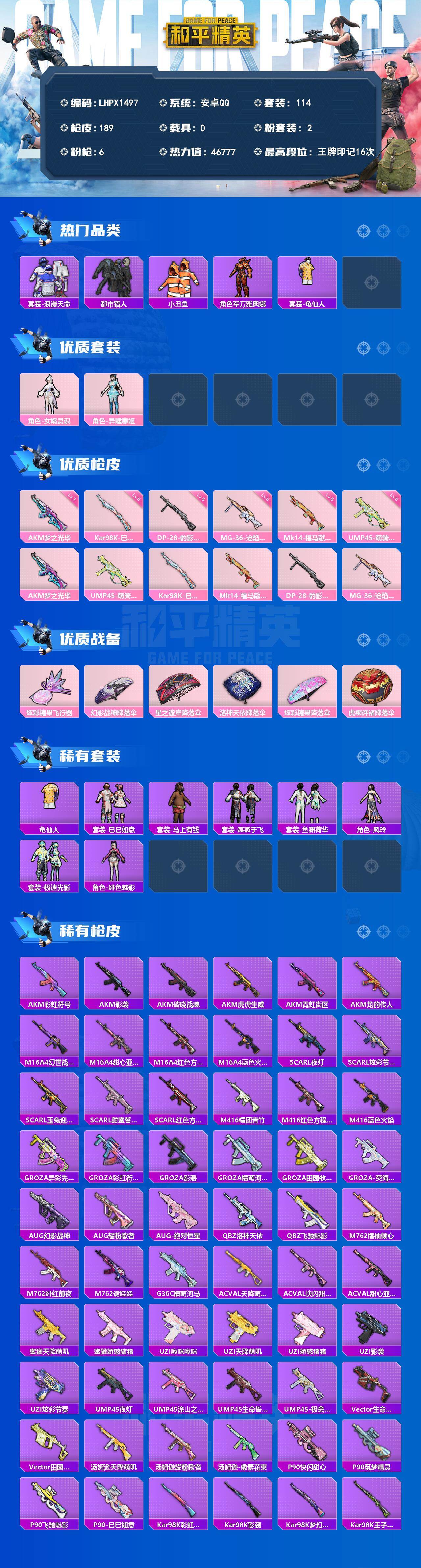 可二次【特价出售/店主推荐】安卓 手Q-2粉装-6特效枪-1粉色飞行器-46777热力值-16王牌印记-114套装-189枪皮【热门品类】:套装-浪漫天命,套装-都市猎人,套装-小丑鱼,角色-军刀雅典娜,套装-龟仙人【粉色套装】:角色-女娲灵识,角色-异瞳寒姬【粉色枪皮等级】:AKM-梦之光华(七级),UMP45-萌骑冒险(五级),Kar98K-巳巳如意(五级),Mk14-福马献瑞(五级),DP-28-豹影疾电(五级),MG-36-沧焰双生(五级)【粉色枪皮】:AKM-梦之光华,UMP45-萌骑