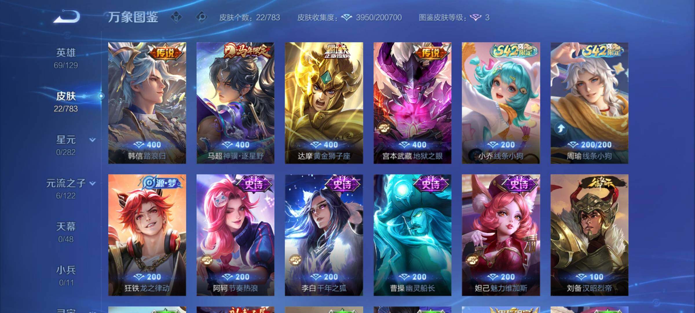 【限定皮肤】:项羽海滩派对【战令限定】:周瑜线条小狗,小乔线条小狗【史诗皮肤】:周瑜线条小狗,小乔线条小狗,狂铁龙之律动,阿轲节奏热浪,李白千年之狐,曹操幽