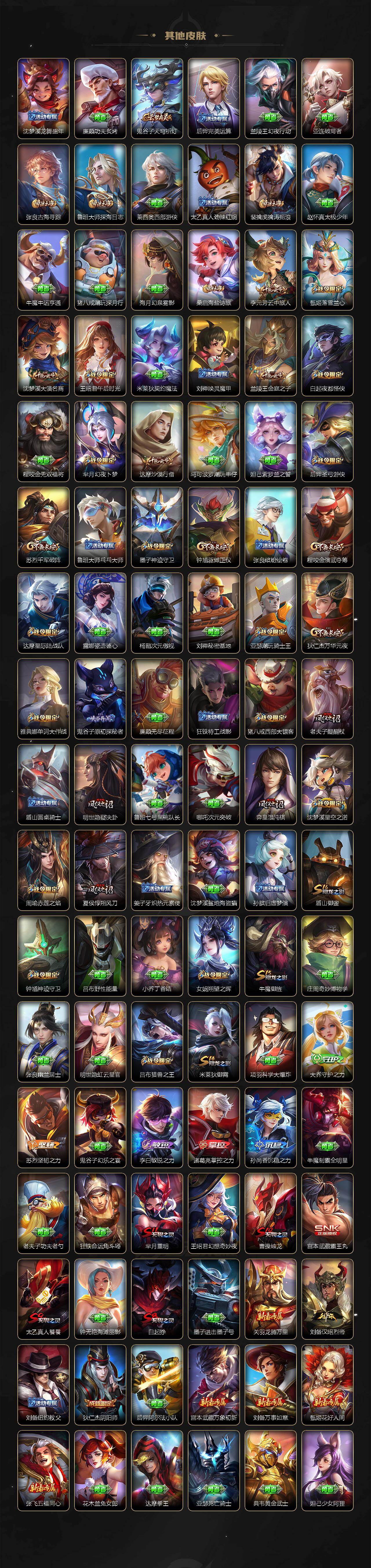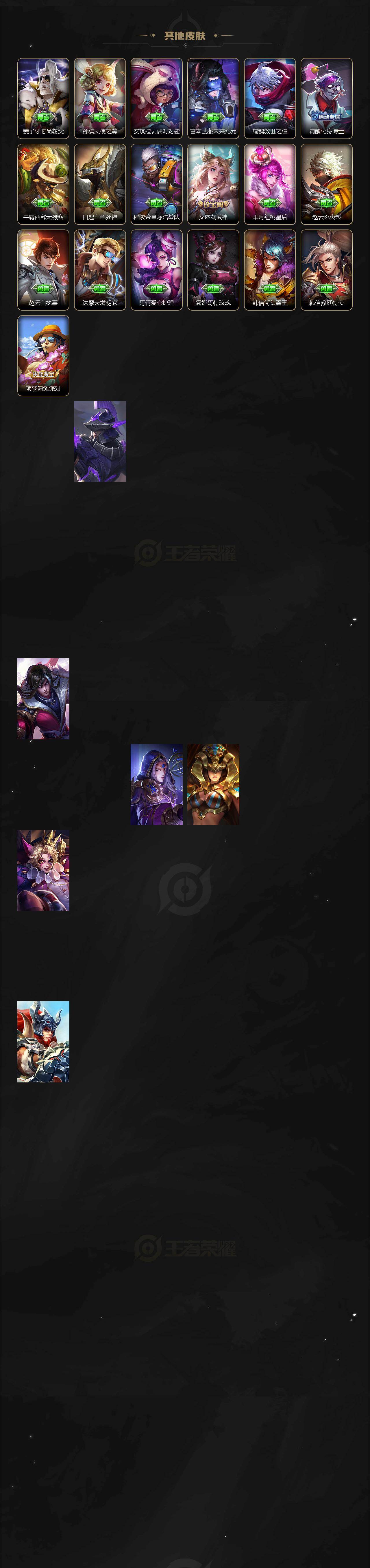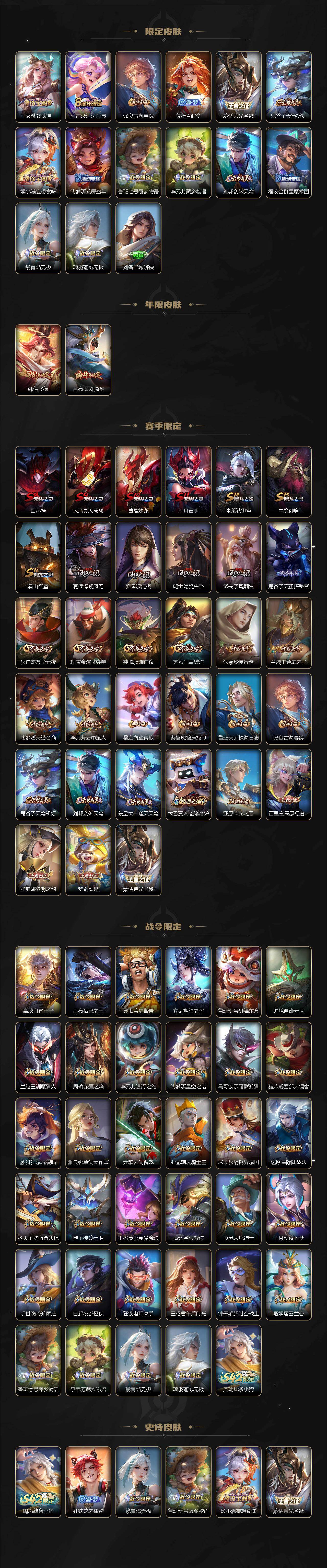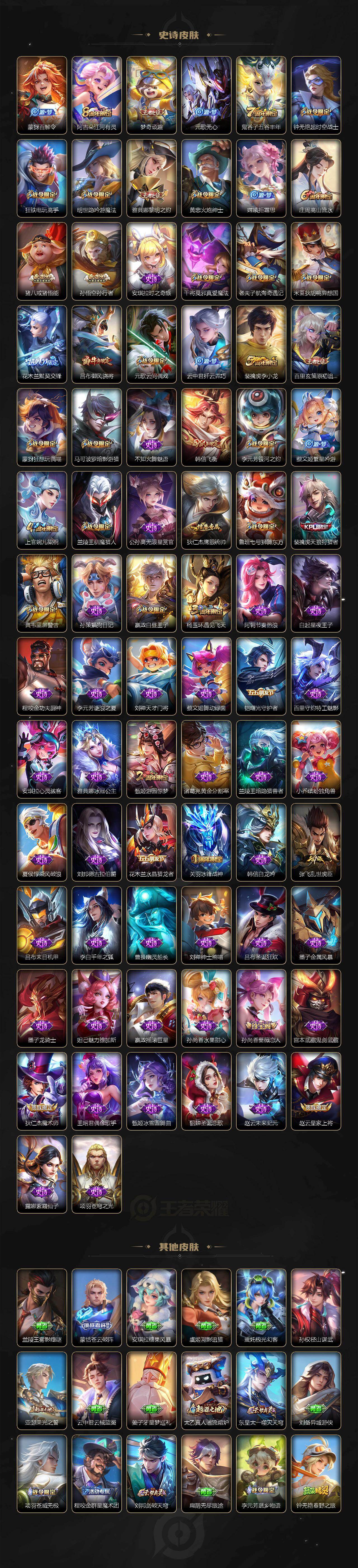 【限定皮肤】:白起狰,狄仁杰阴阳师,赵云皇家上将,墨子神迹守卫,嬴政白昼王子,孙尚香蔷薇恋人,鲁班七号狮舞东方,庄周高山流水,钟无艳超时空战士,白起夜都怪侠,芈月重明,