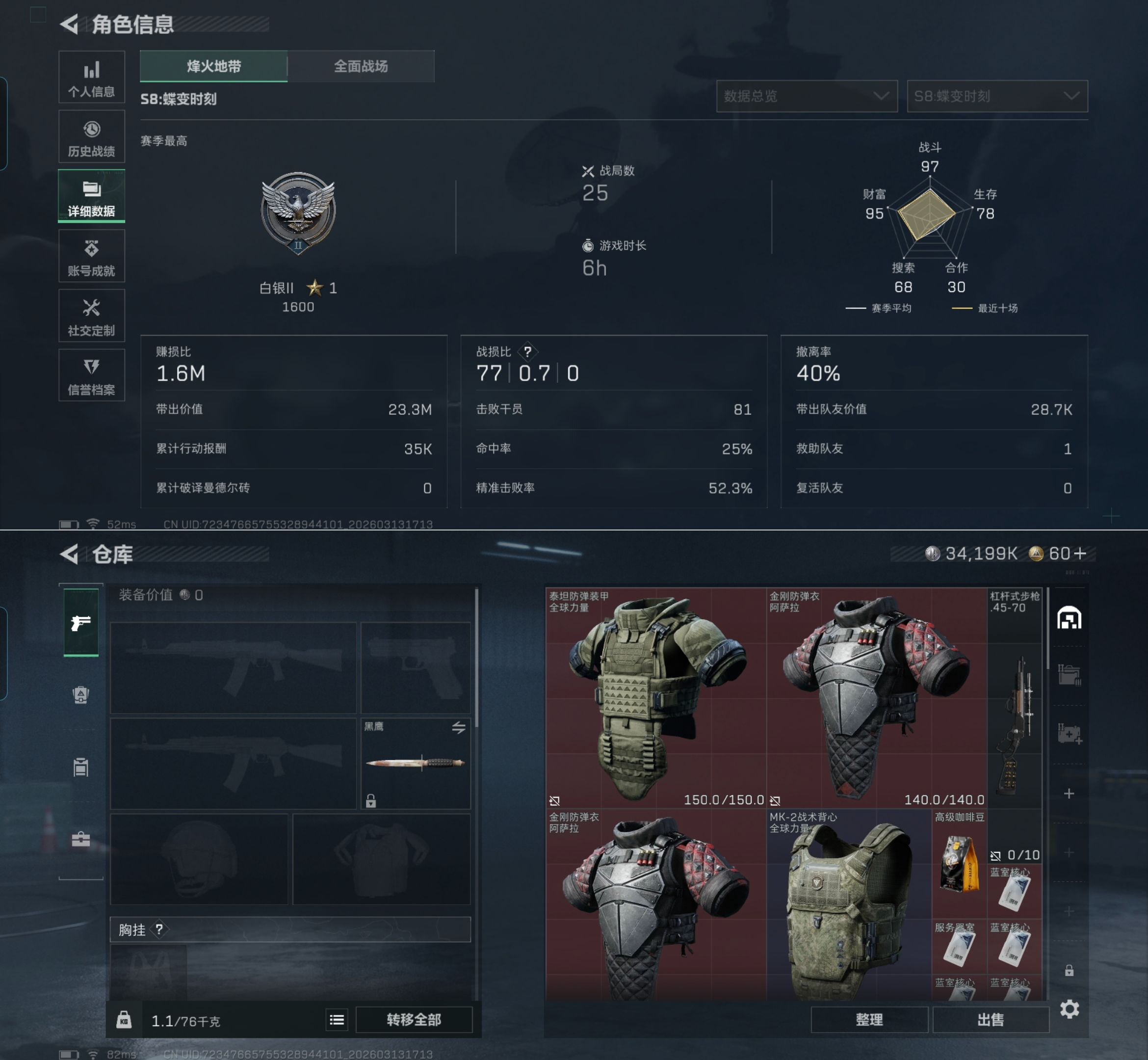【总资产(M)】62.52【哈夫币】34199k【行动等级】36
