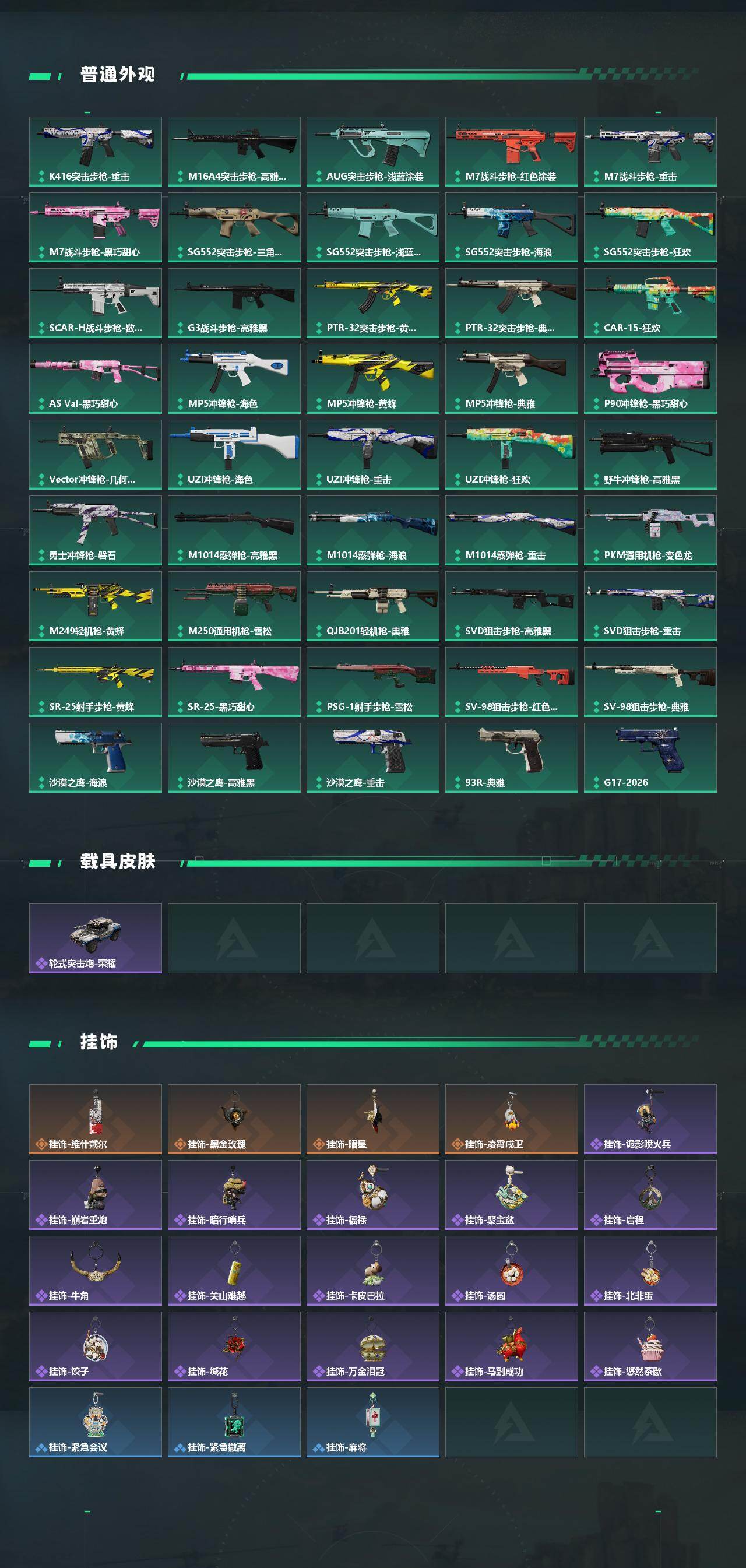 【传说外观】:AUG突击步枪-悠然茶歇,SCAR-H战斗步枪-启航,腾龙突击步枪-马年祥瑞,腾龙突击步枪-万金泪冠,MK47突击步枪-悠然茶歇,MK47突击步枪-暗星,UZI冲锋枪-悠然茶歇,SR-3M紧凑突
