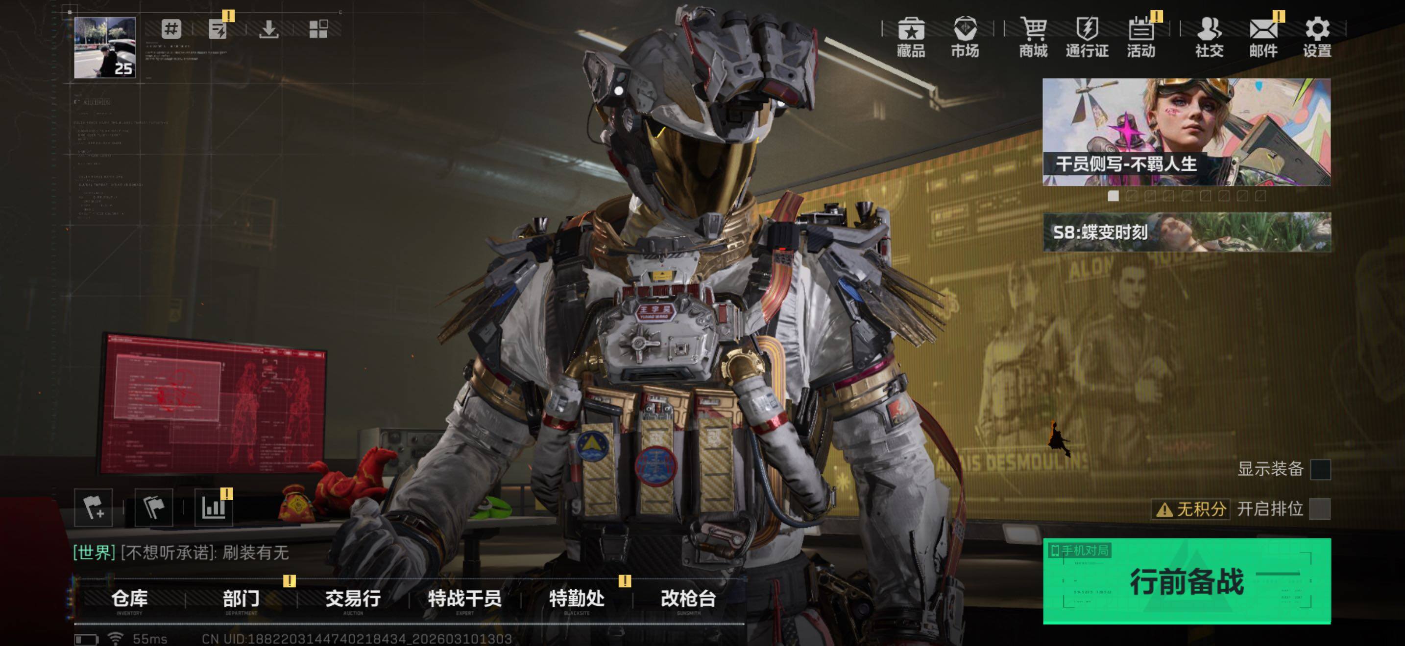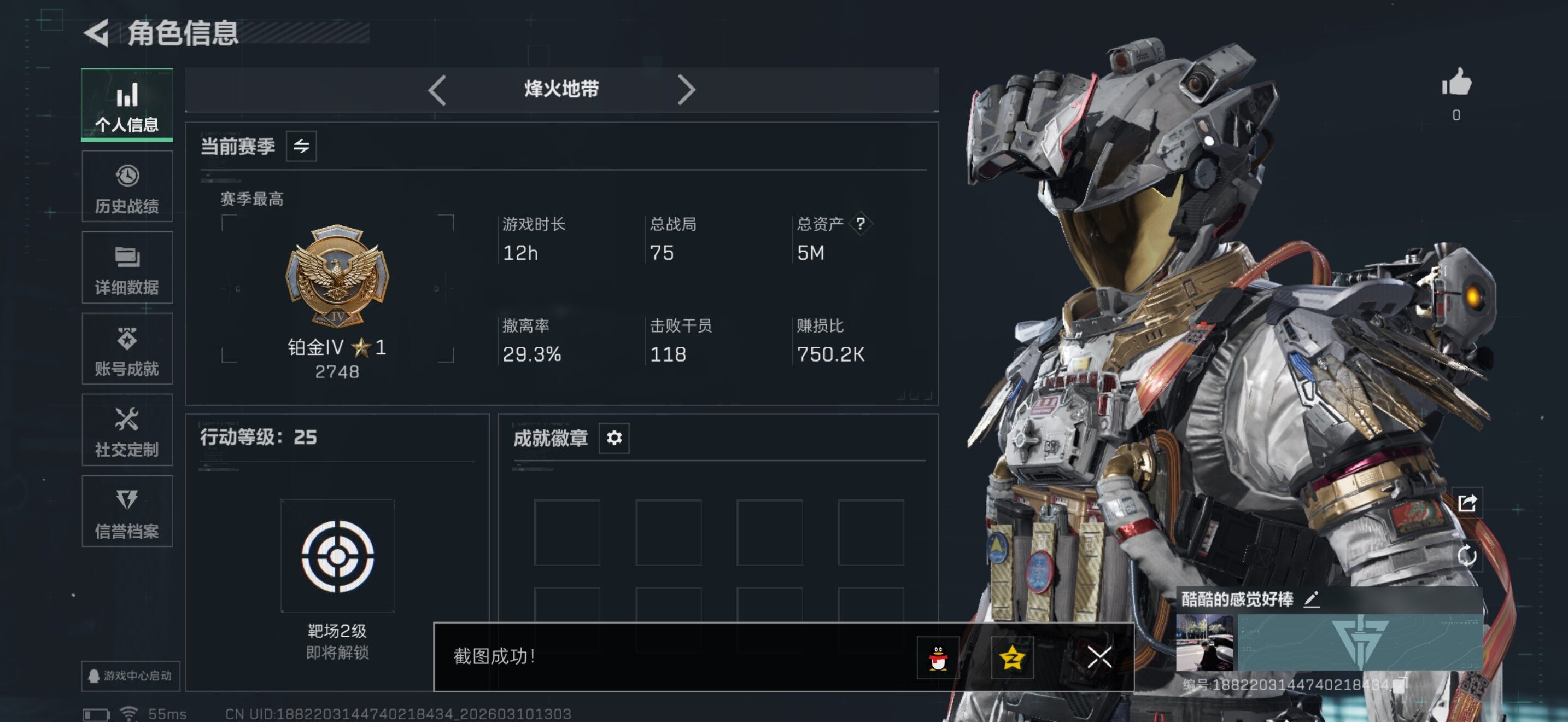 5m总资产-237k哈伏币-25烽火等级-铂金-1战场等级-无军衔【干员外观