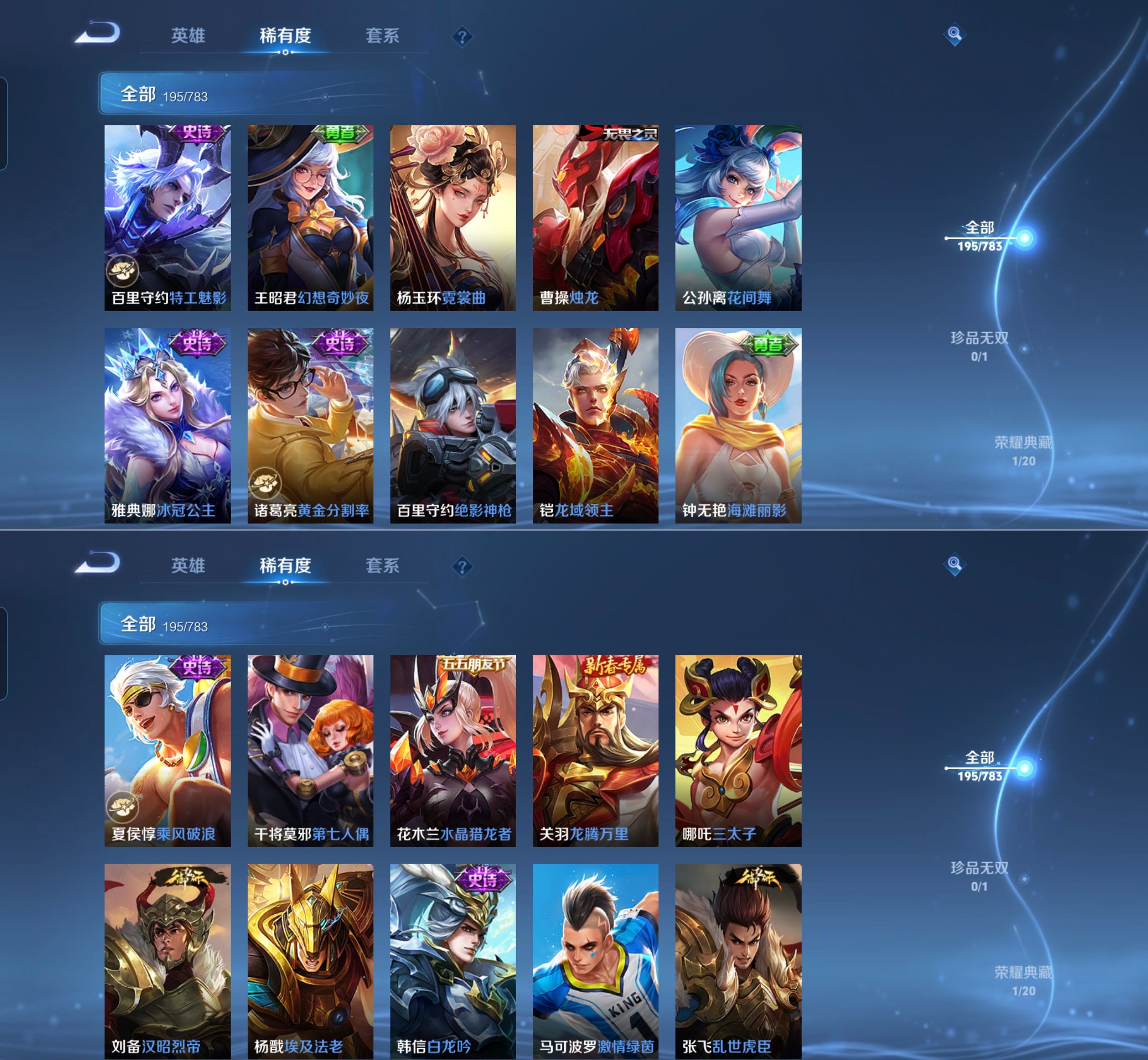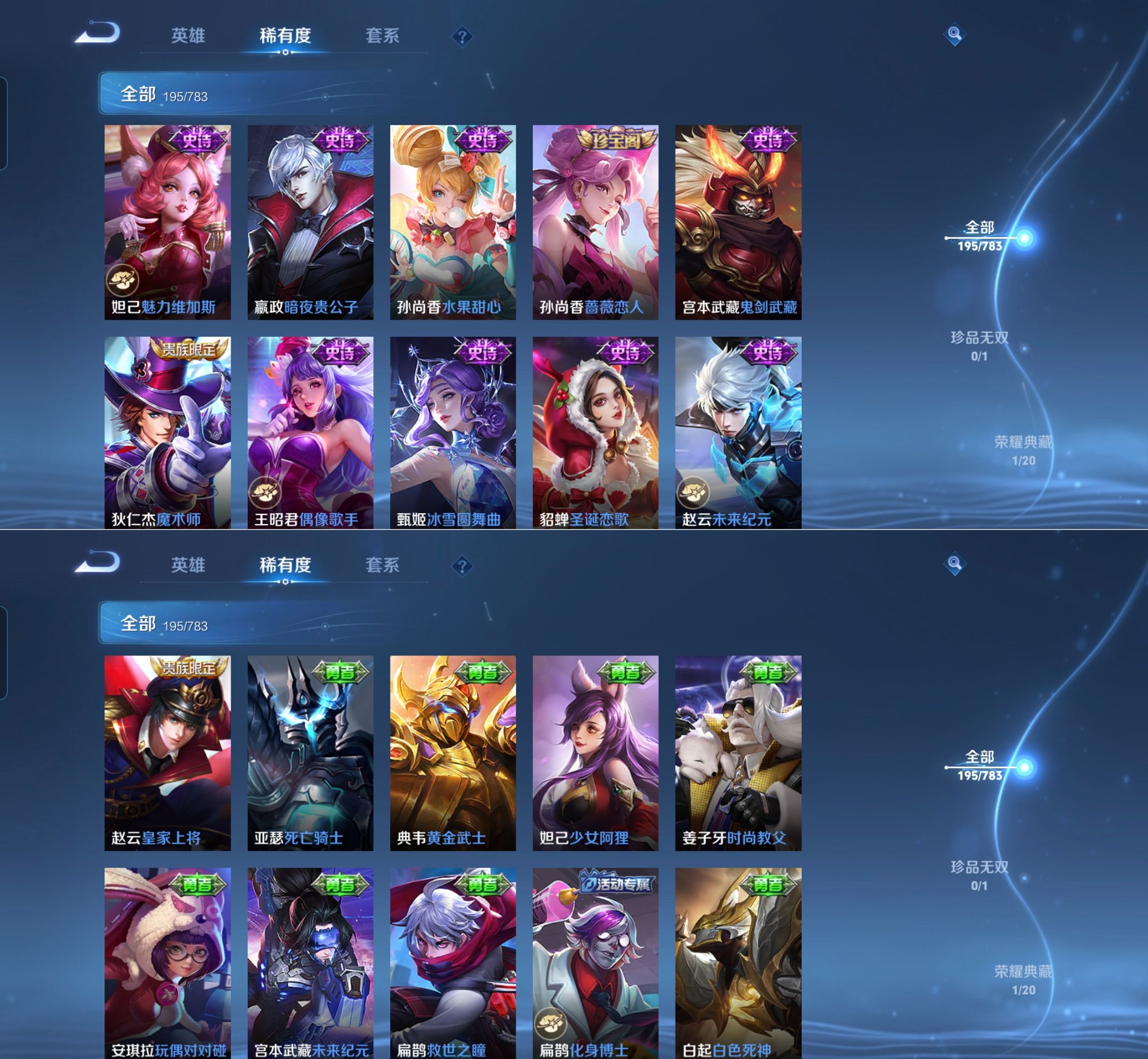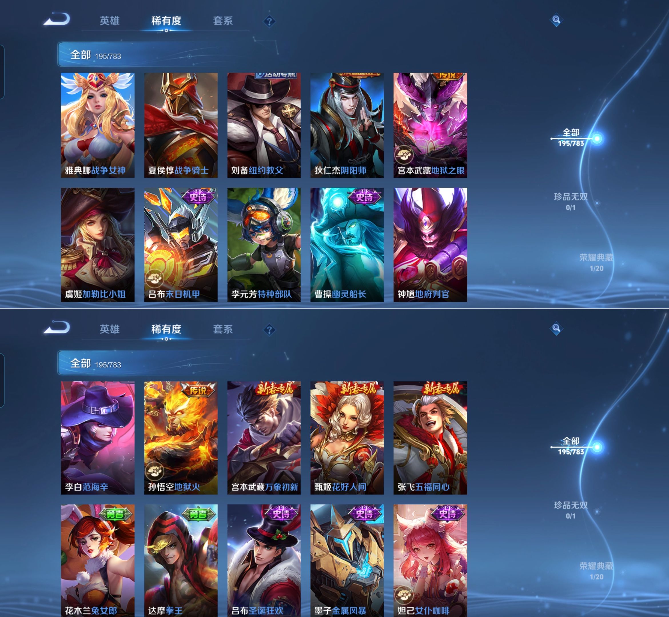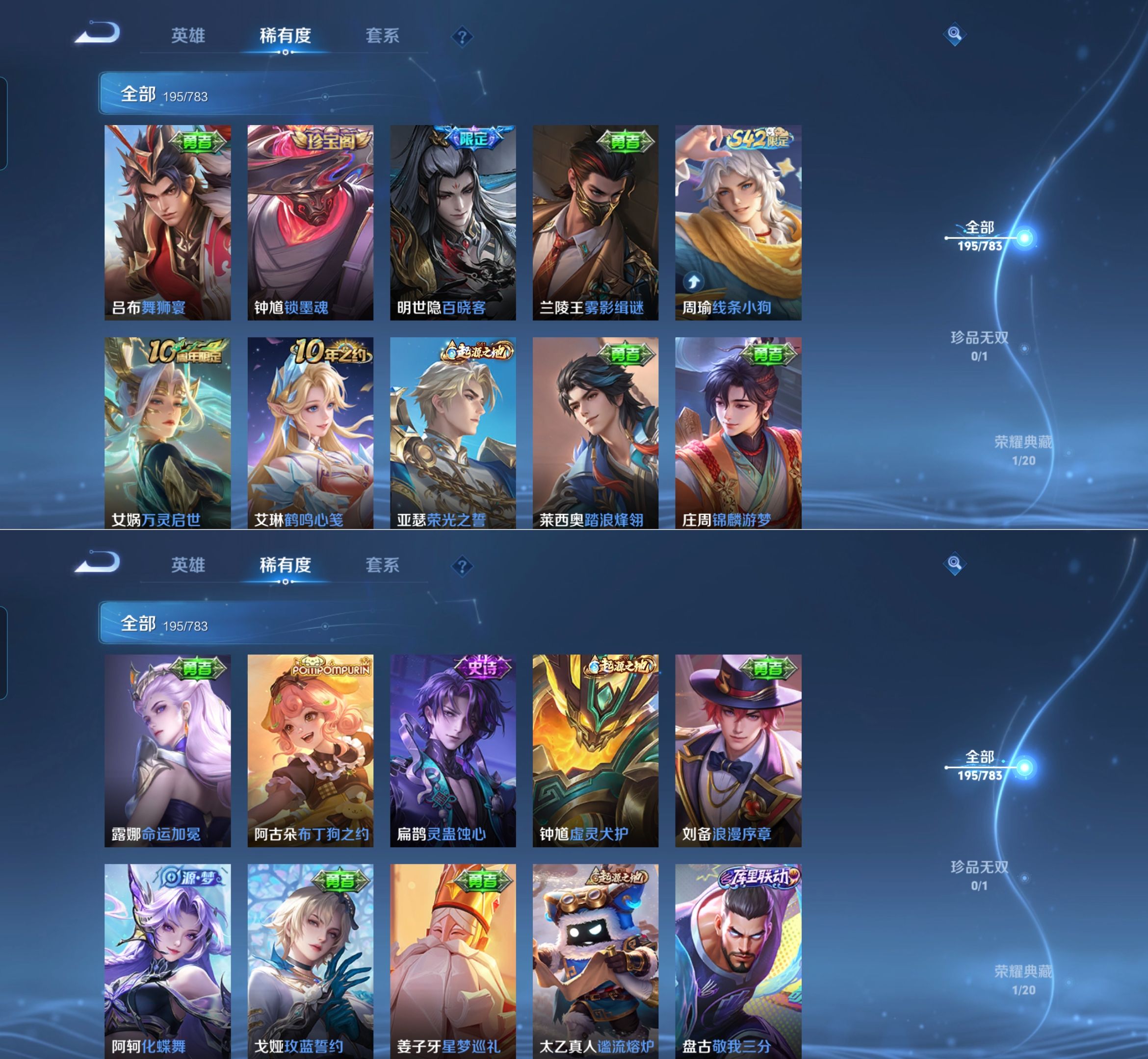 【史诗皮肤】 百晓客 布丁狗之约 谧流熔炉 灵蛊蚀心 孙行者 线条小狗 踏浪烽翎 荣光圣徽 超时空战士 万灵启世 化蝶舞 顽趣 幽灵船长 功夫厨神 女仆咖啡 魅力维加斯 魔术师 鹰眼统帅 圣诞恋歌 鬼剑武藏 白龙吟 水晶猎龙者 修罗 火炮绅士 逐浪之夏 天才