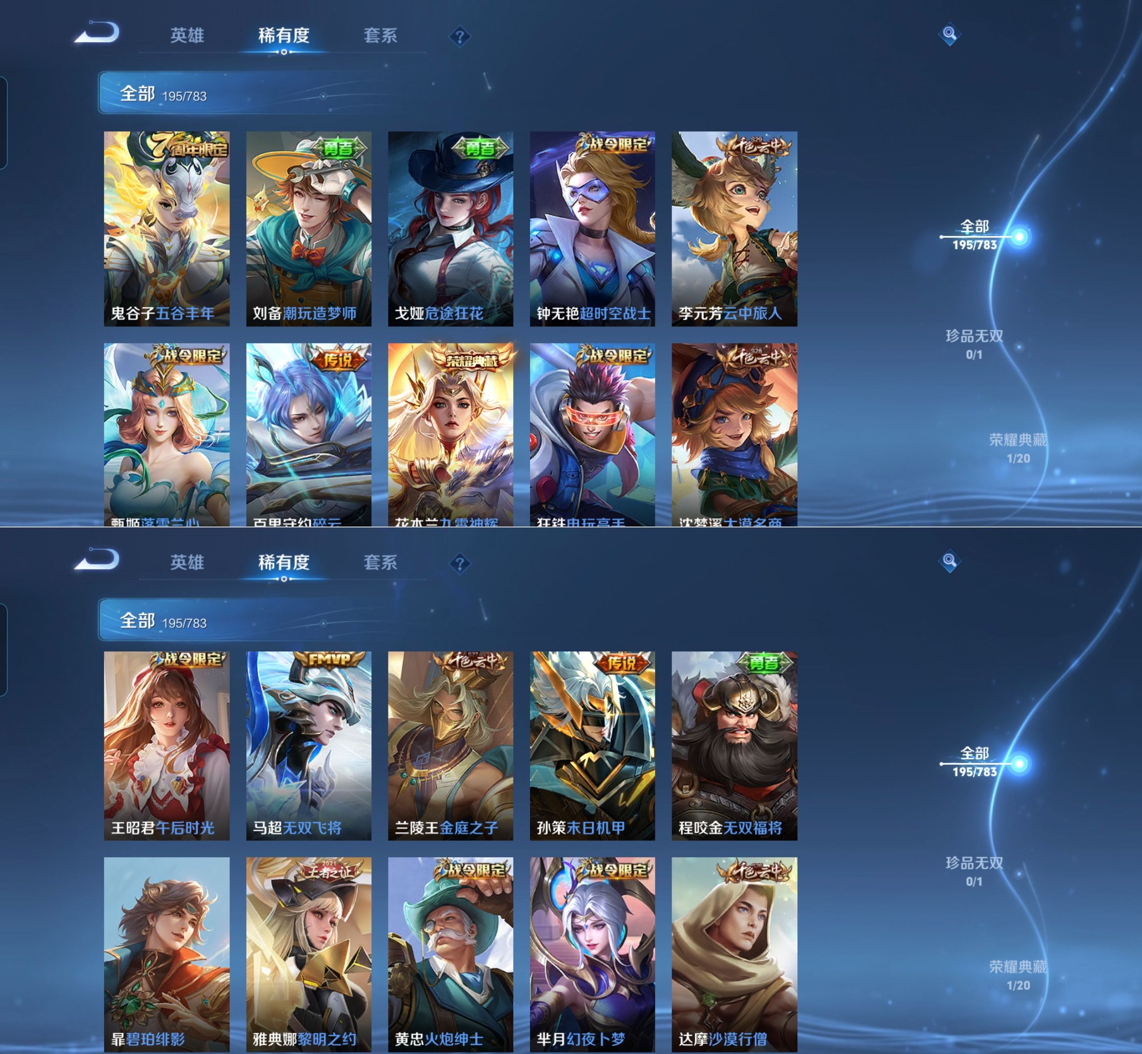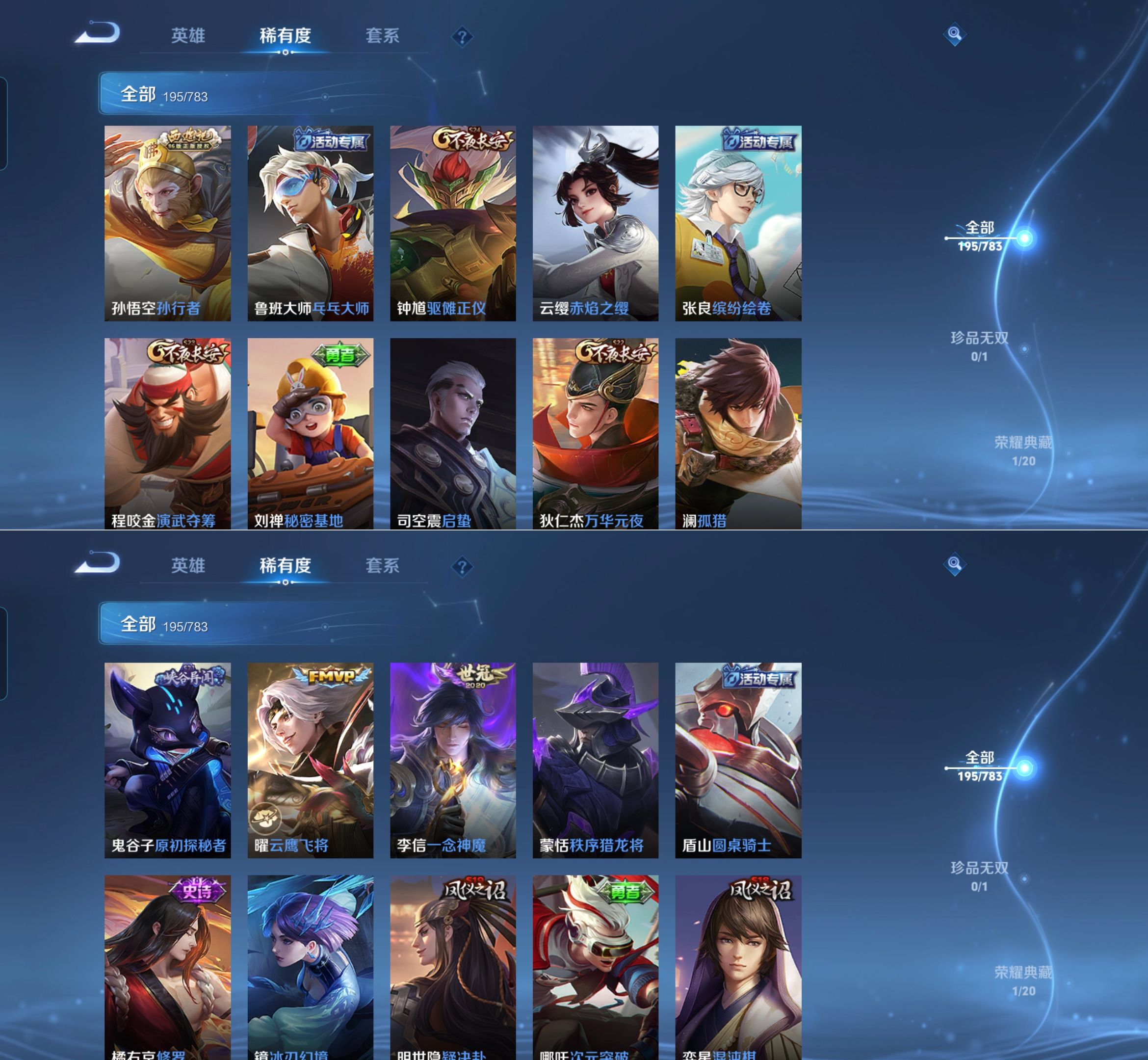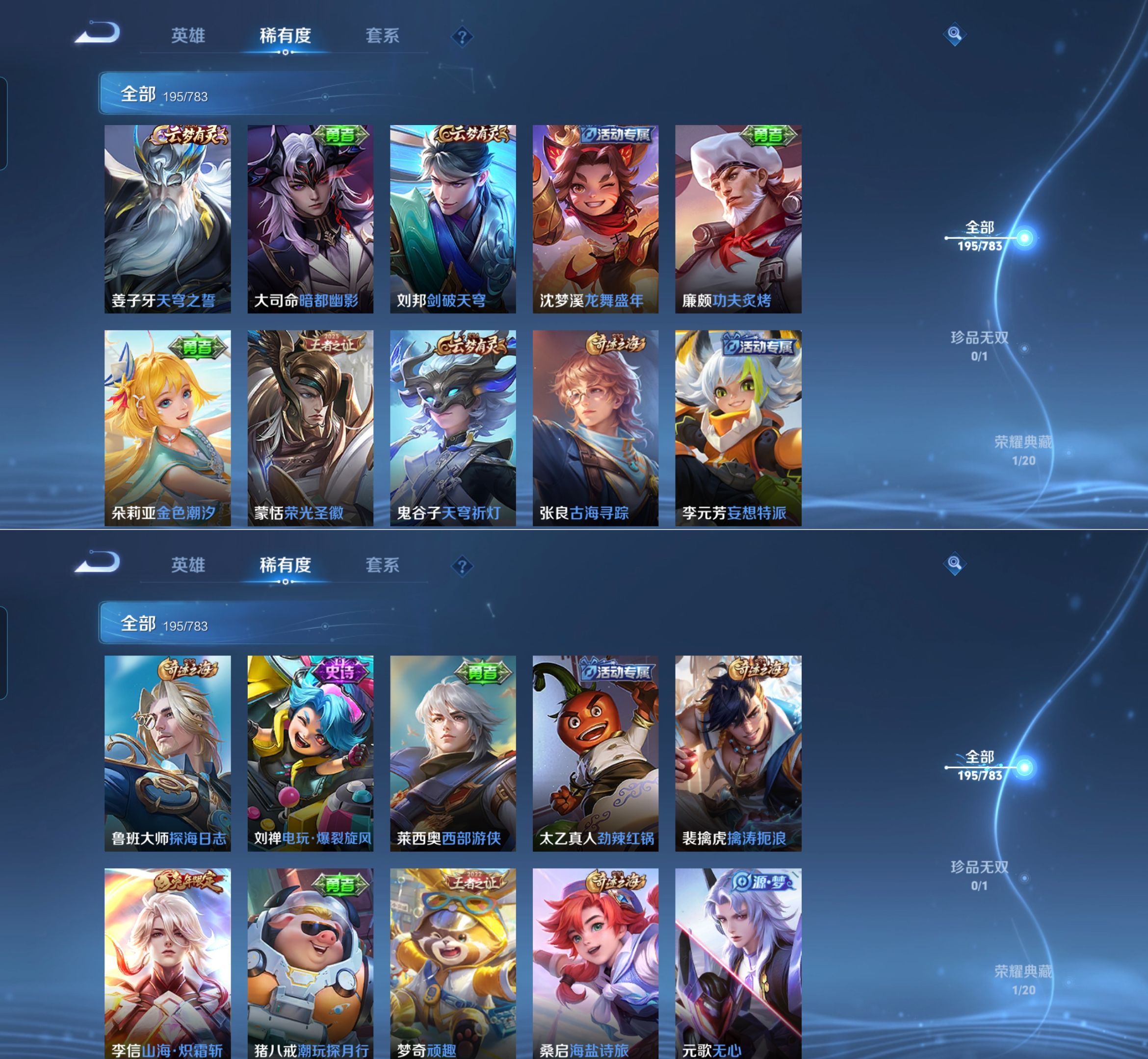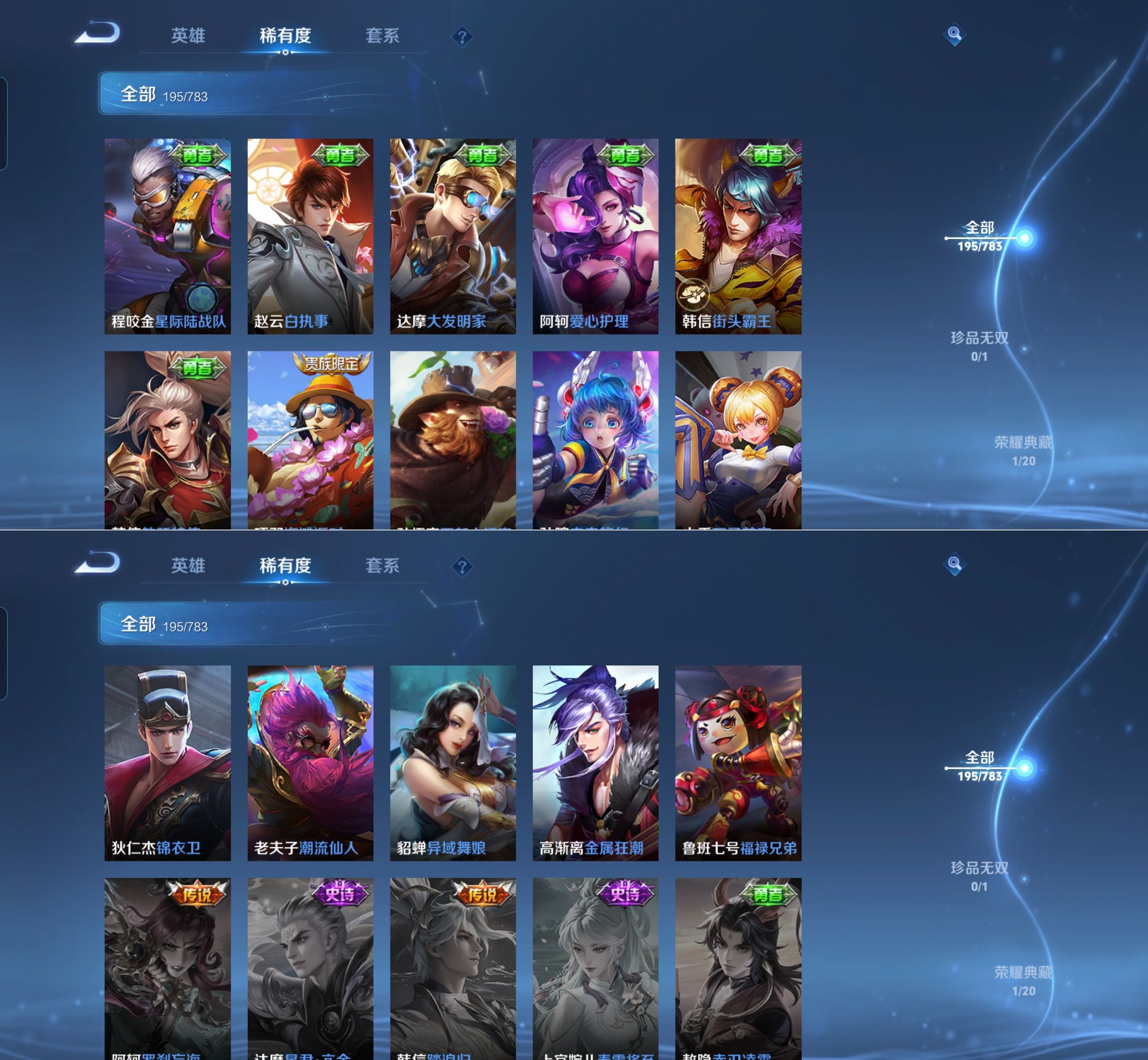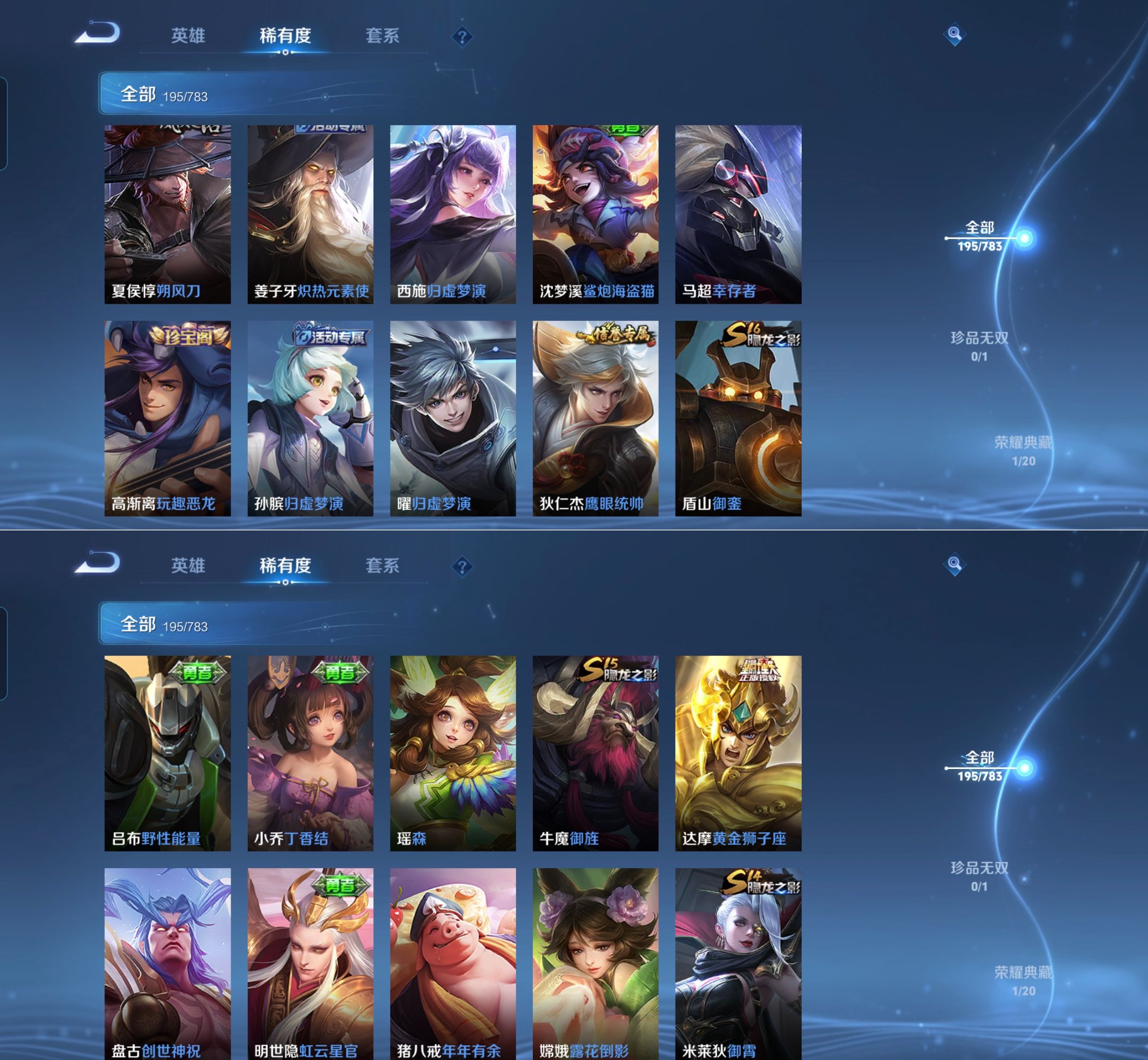 【史诗皮肤】 百晓客 布丁狗之约 谧流熔炉 灵蛊蚀心 孙行者 线条小狗 踏浪烽翎 荣光圣徽 超时空战士 万灵启世 化蝶舞 顽趣 幽灵船长 功夫厨神 女仆咖啡 魅力维加斯 魔术师 鹰眼统帅 圣诞恋歌 鬼剑武藏 白龙吟 水晶猎龙者 修罗 火炮绅士 逐浪之夏 天才