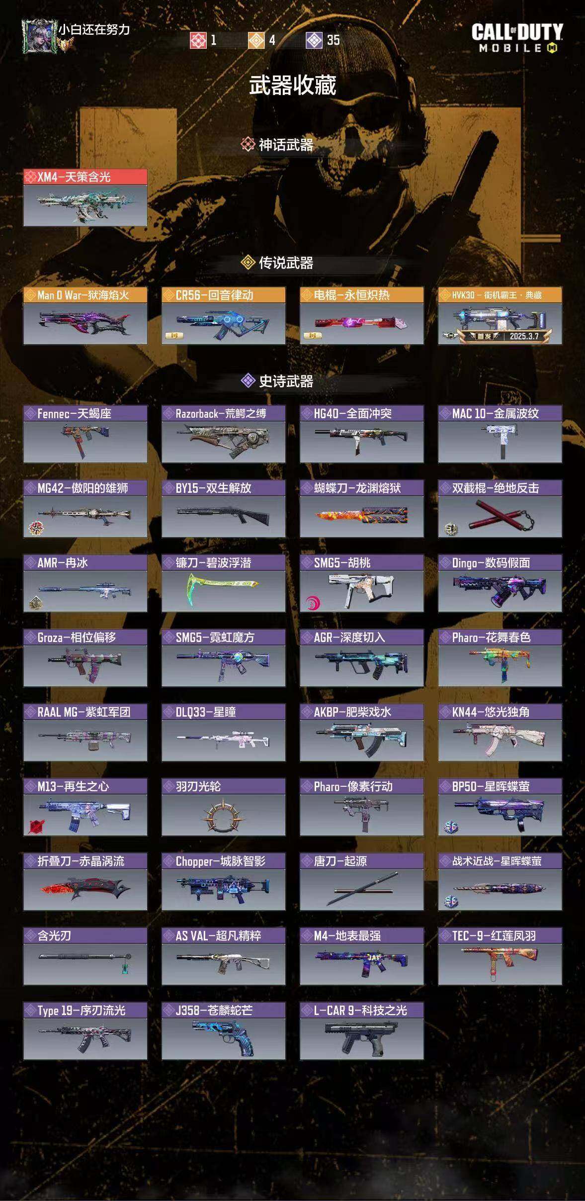 有二次 1武器神话 4传说 1角色神话,XM4-天策含光,Man O War-狱海焰火,HVK30-街机霸王·典藏,电棍-永恒炽热,CR56-回音律动,索菲亚-砺锋的希冀