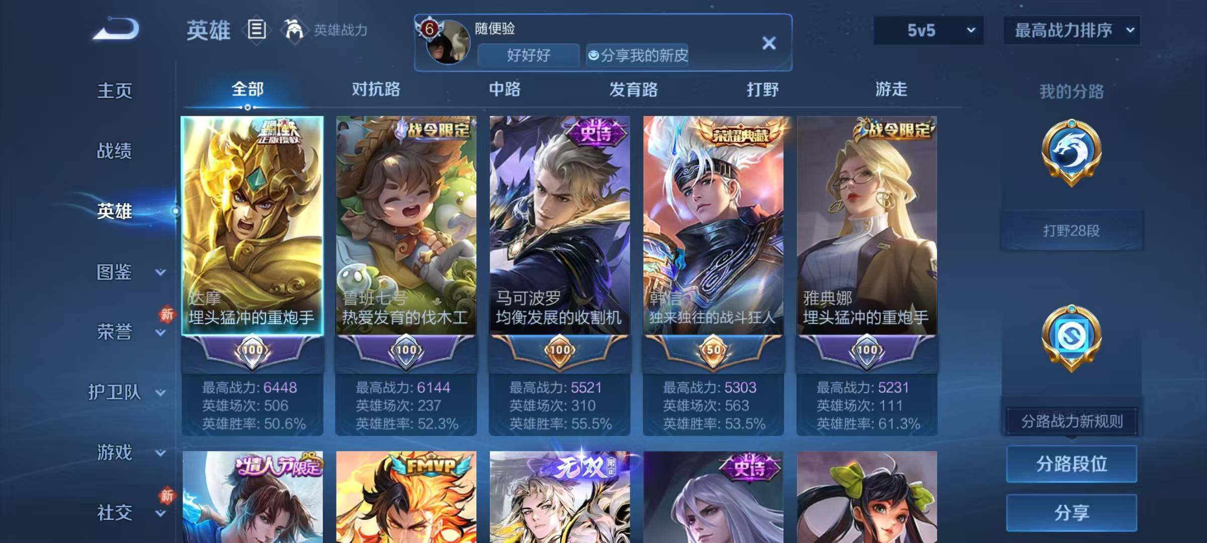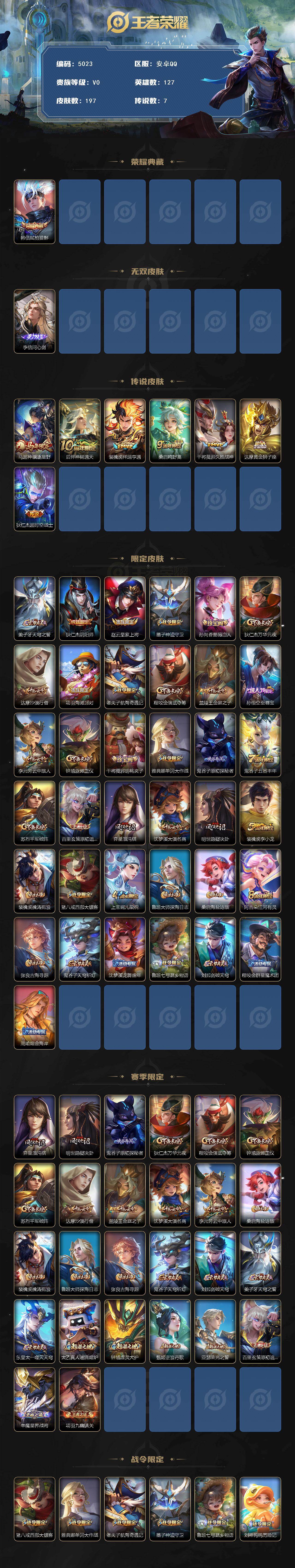 安卓Q-V0-最强王者段位-127英雄-197皮肤-1典藏皮肤-1无双-7传说-50史诗