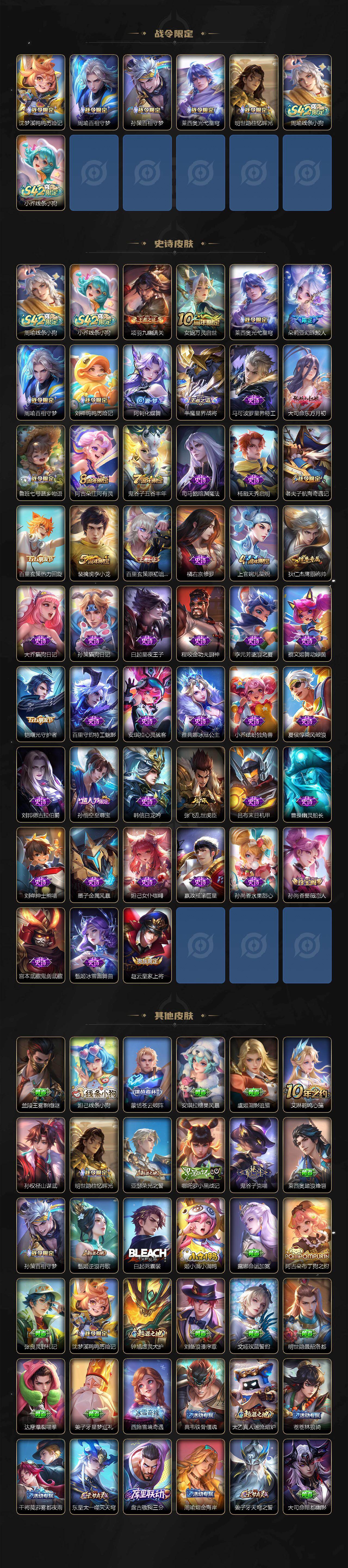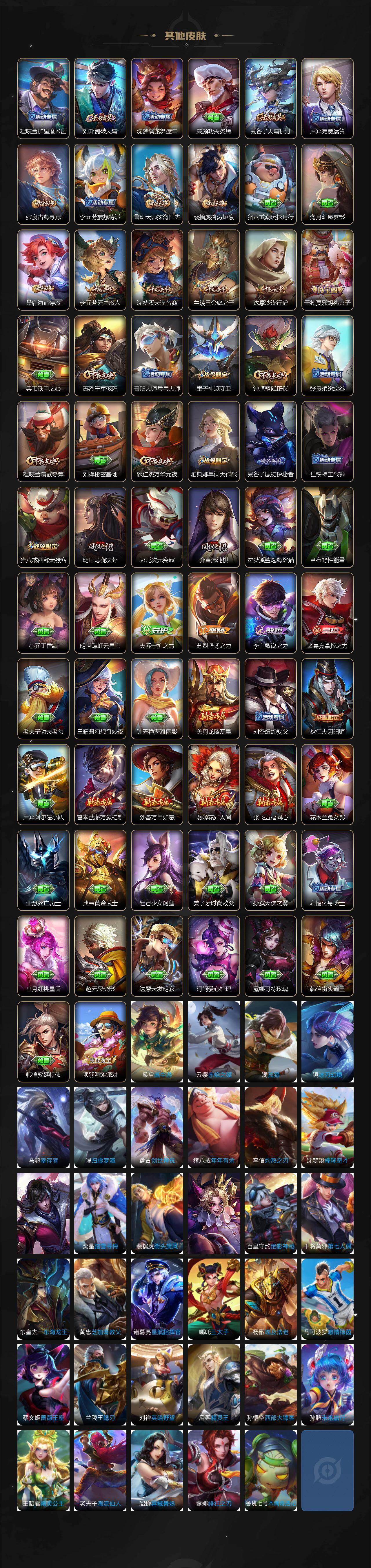 【限定皮肤】:姜子牙天穹之誓,狄仁杰阴阳师,赵云皇家上将,墨子神迹守卫,孙