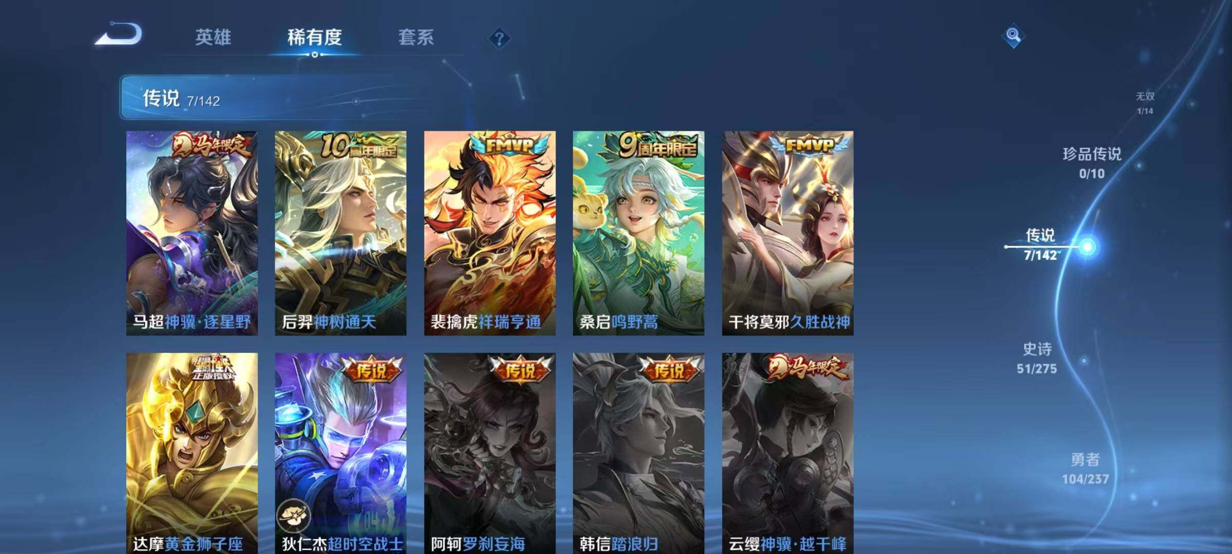 【传说皮肤】:马超神骥逐星野,后羿神树通天,裴擒虎祥瑞亨通,桑启鸣野蒿,干将莫邪久胜战神,达摩黄金狮子座,狄仁杰超时空战士