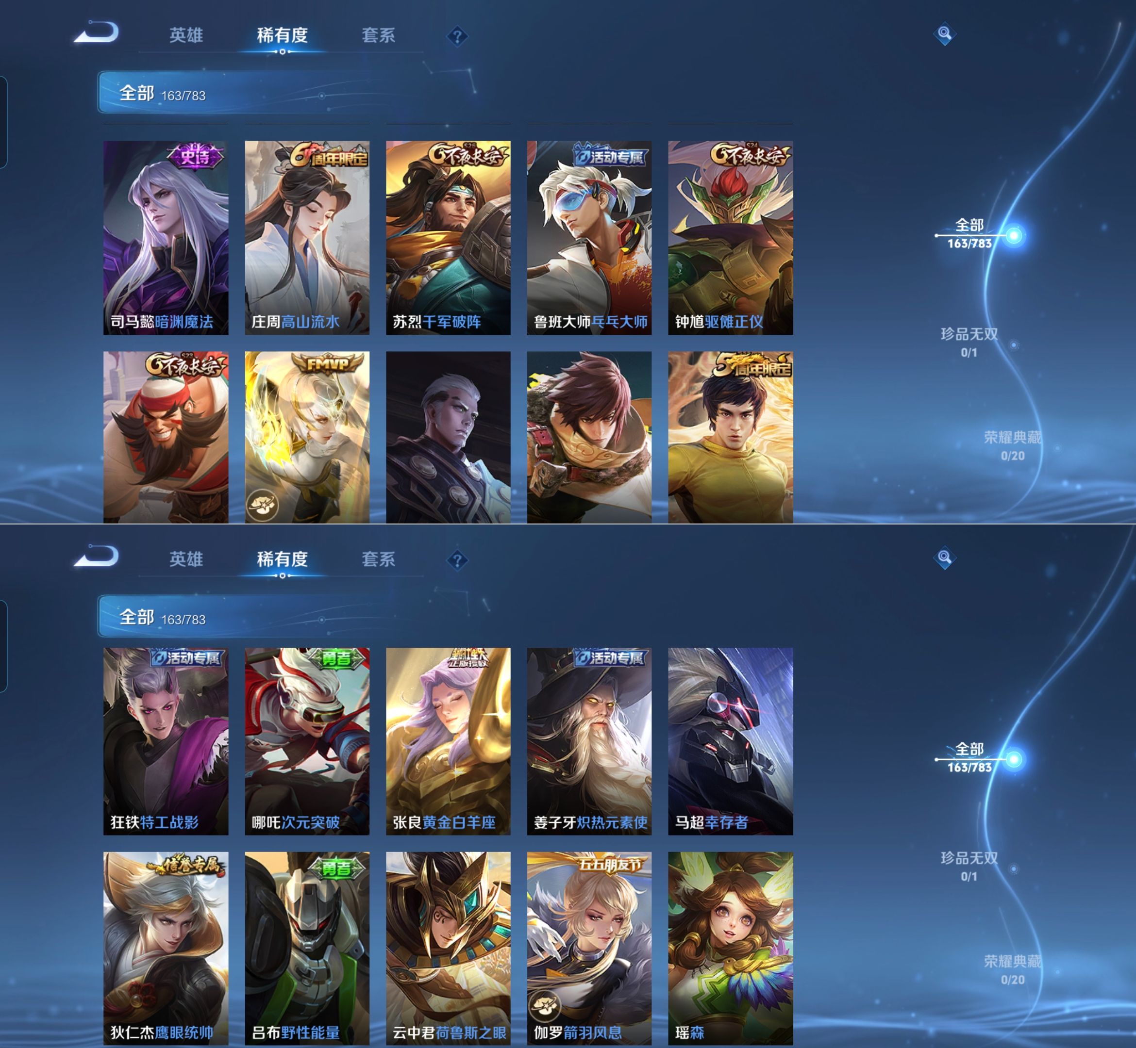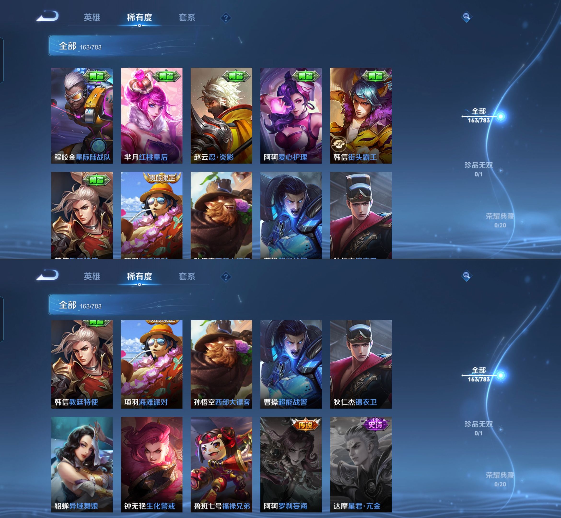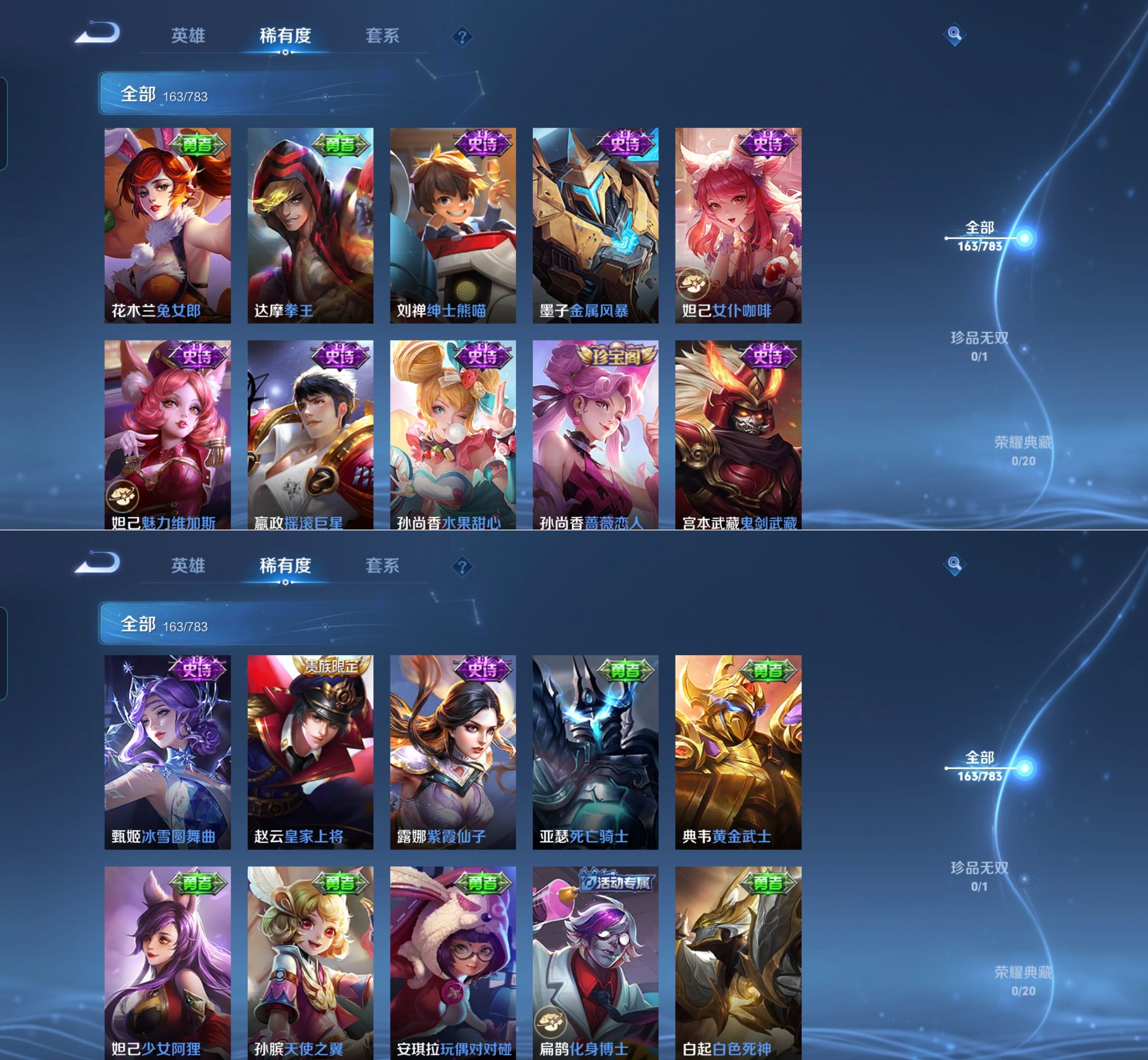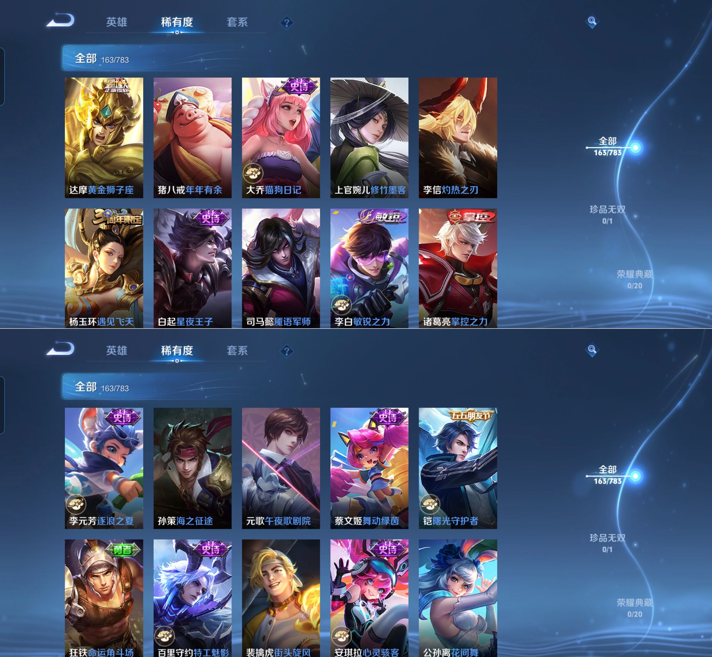 【史诗皮肤】 破空之剑 布丁狗之约 谧流熔炉 涂山容容 龙之律动 线条小狗 九幽镇关 踏浪烽翎 聚星闪耀 江河有灵 百相守梦 漠中幻影 巫礼祀神 万灵启世 化蝶舞 舞动绿茵 幽灵船长 女仆咖啡 魅力维加斯 猫狗日记 鹰眼统帅 箭羽风息 鬼剑武藏 曙光守护者 暗隐猎兽者 逐浪之夏