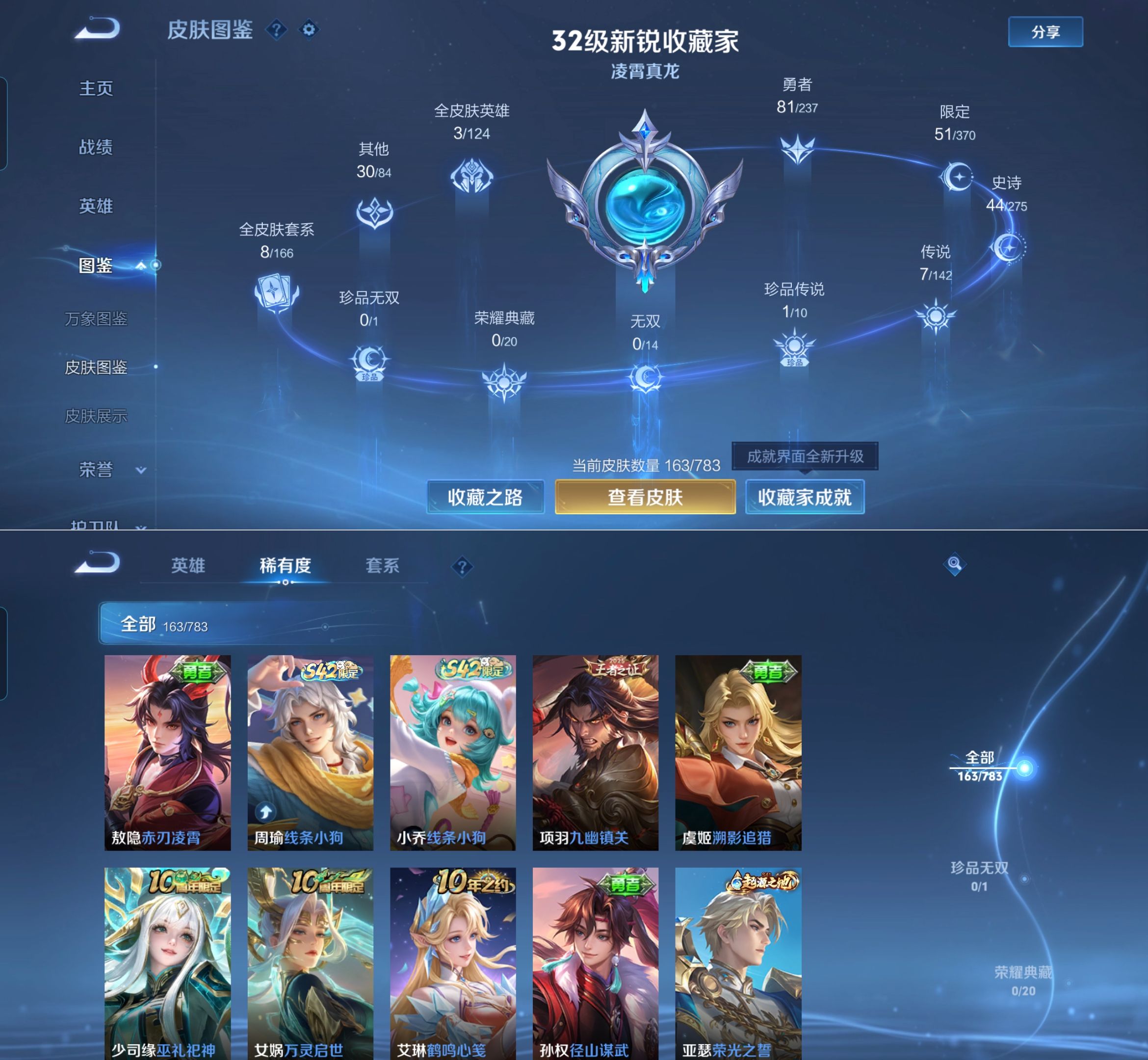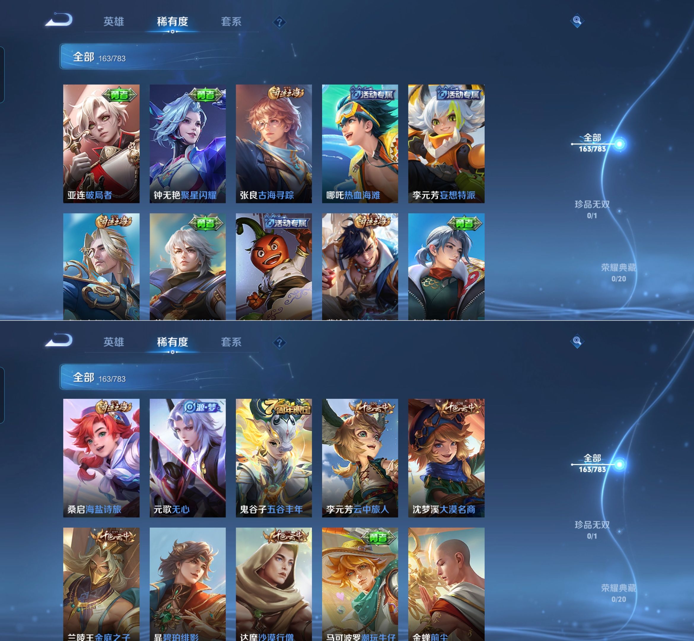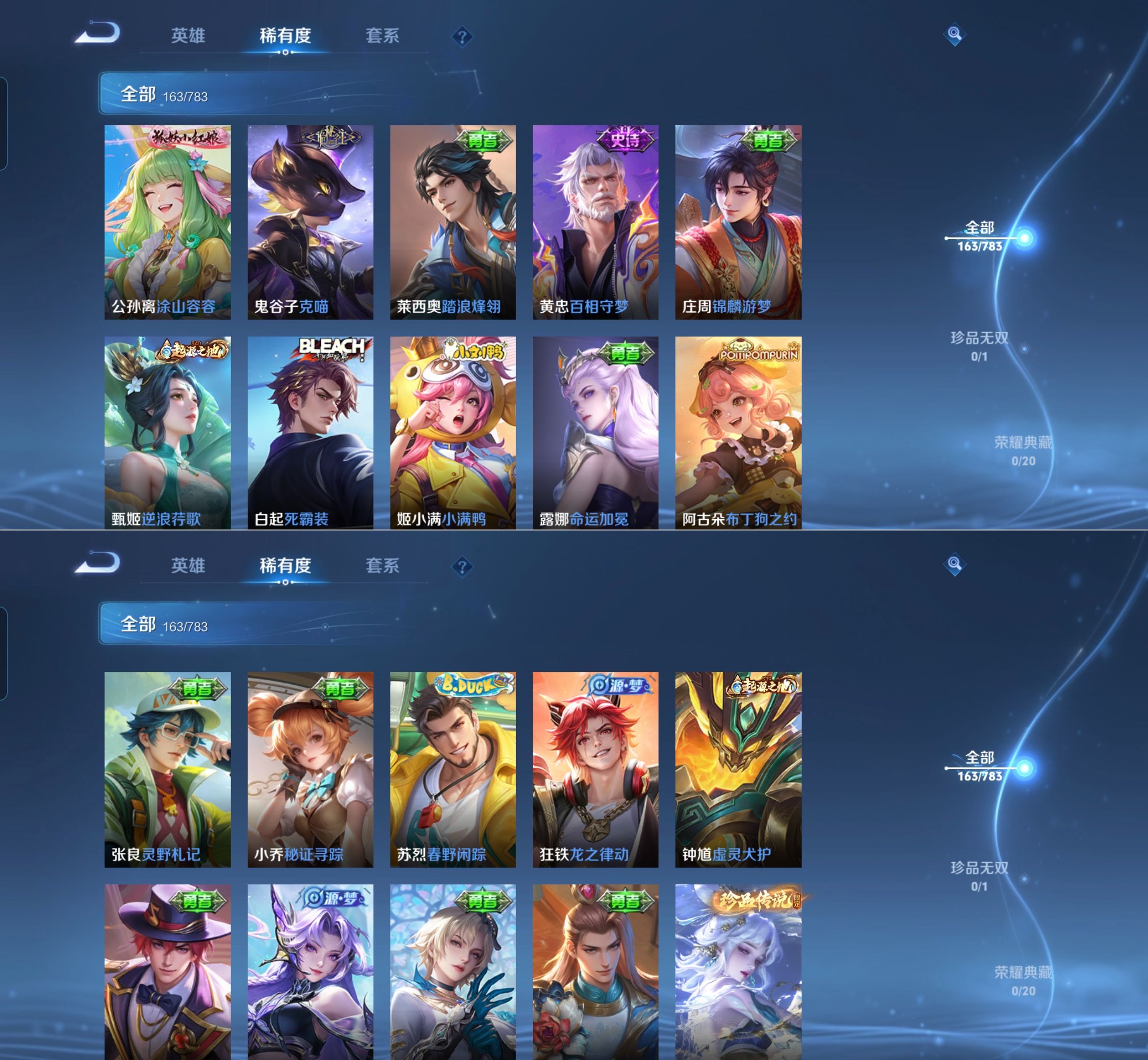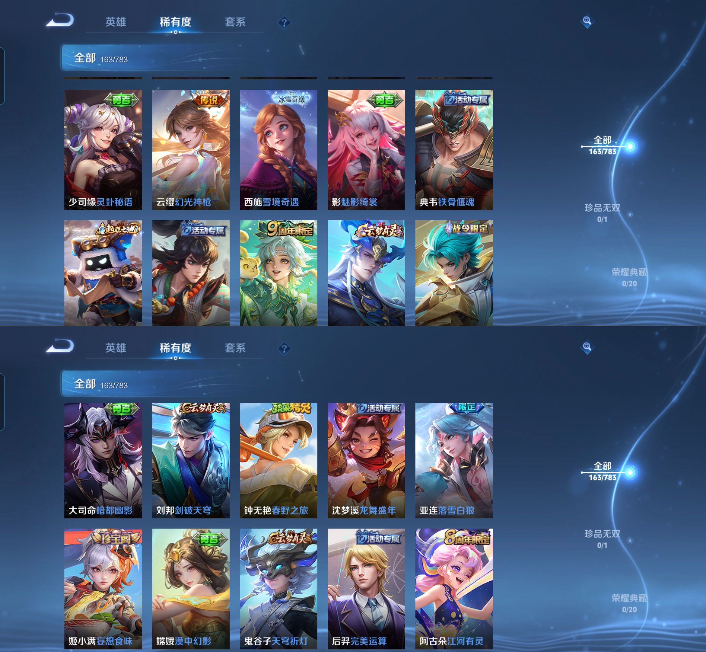 【史诗皮肤】 破空之剑 布丁狗之约 谧流熔炉 涂山容容 龙之律动 线条小狗 九幽镇关 踏浪烽翎 聚星闪耀 江河有灵 百相守梦 漠中幻影 巫礼祀神 万灵启世 化蝶舞 舞动绿茵 幽灵船长 女仆咖啡 魅力维加斯 猫狗日记 鹰眼统帅 箭羽风息 鬼剑武藏 曙光守护者 暗隐猎兽者 逐浪之夏