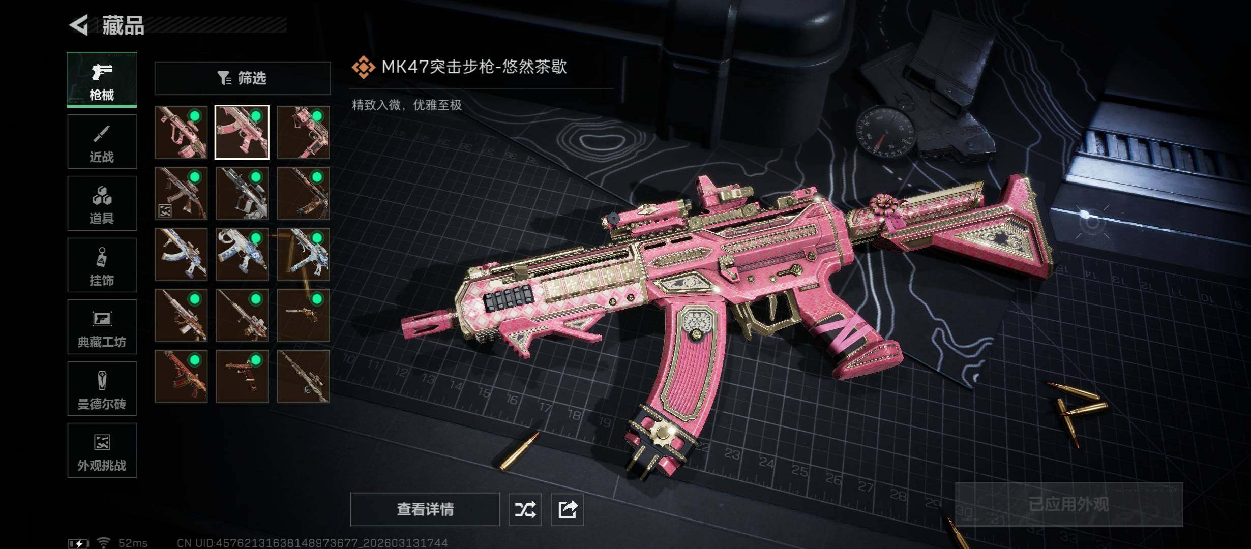 【传说外观】:AKM突击步枪-锦绣,QBZ95-1突击步枪-凌霄戍卫,K416突击步枪-行动记录,AUG突击步枪-悠然茶歇,腾龙突击步枪-马年祥瑞,K437突击步枪-锦