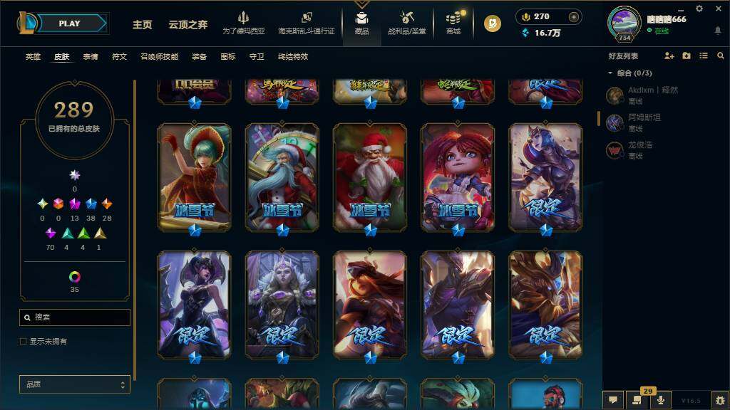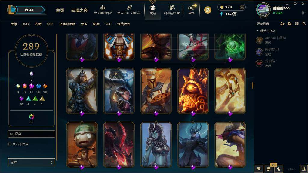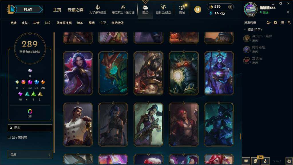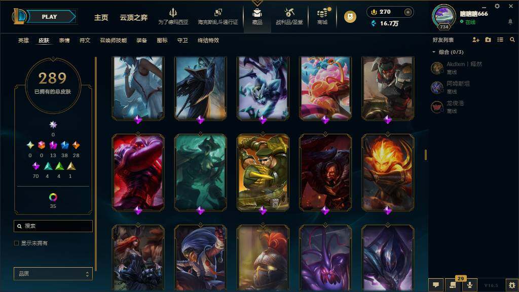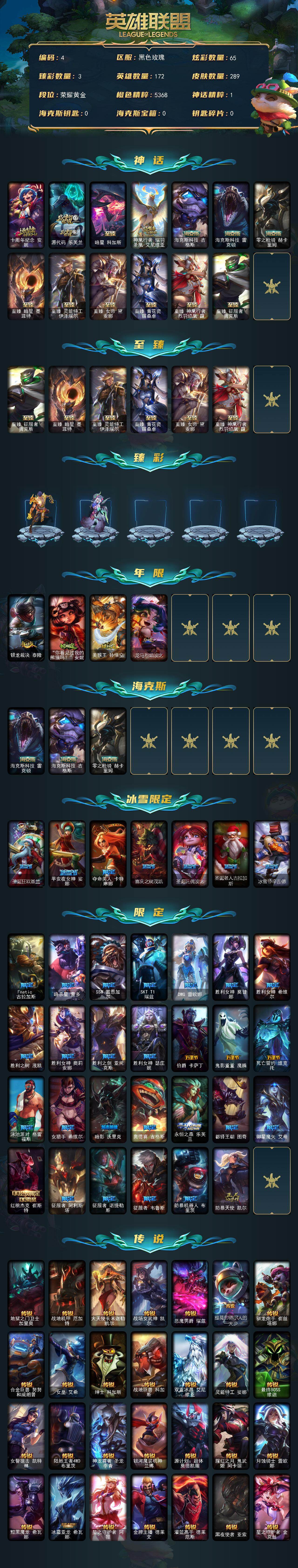 黄金段位-172英雄-289皮肤-65炫彩-0终极-13神话-38限定-28传说-70史诗