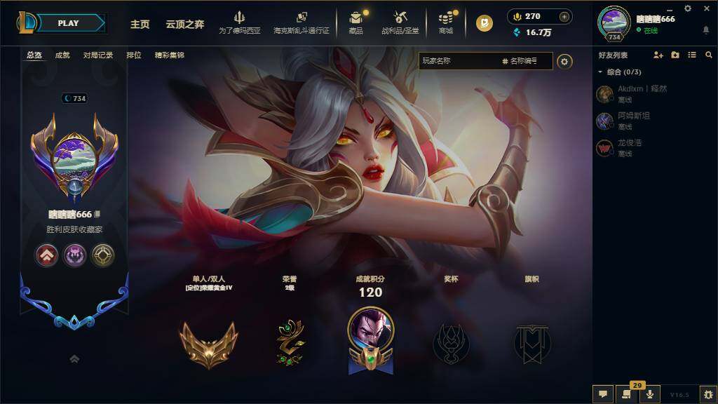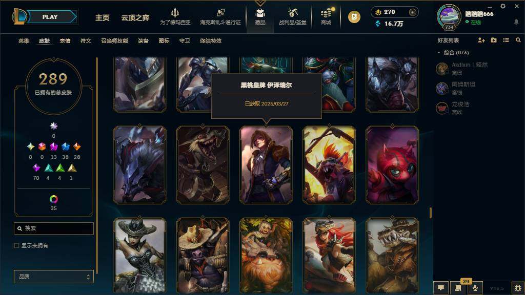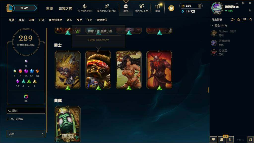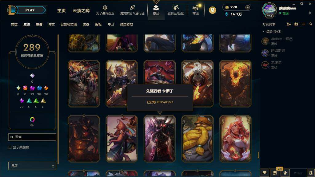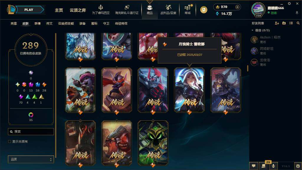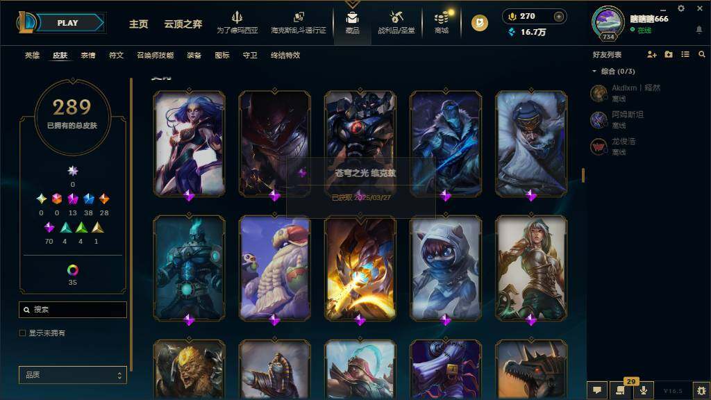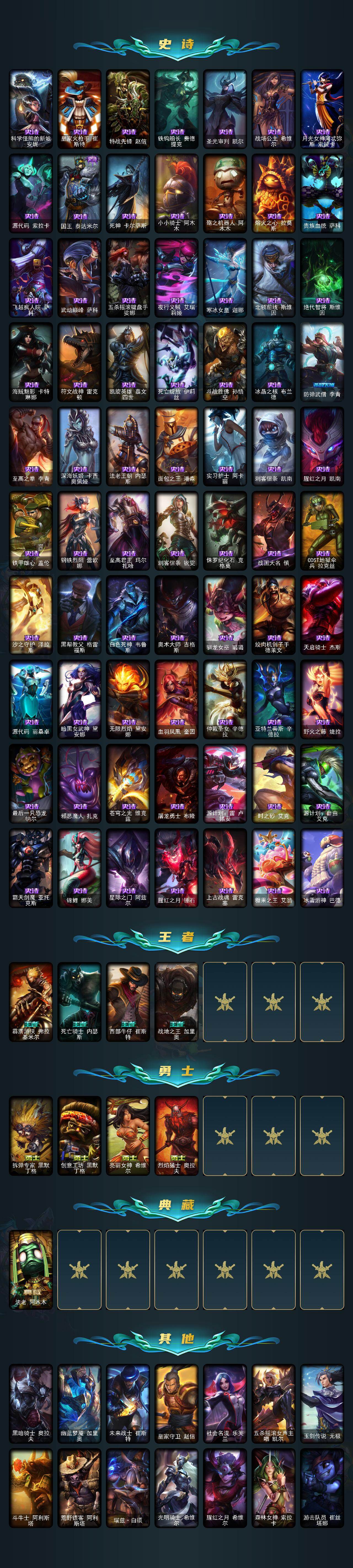 黄金段位-172英雄-289皮肤-65炫彩-0终极-13神话-38限定-28传说-70史诗