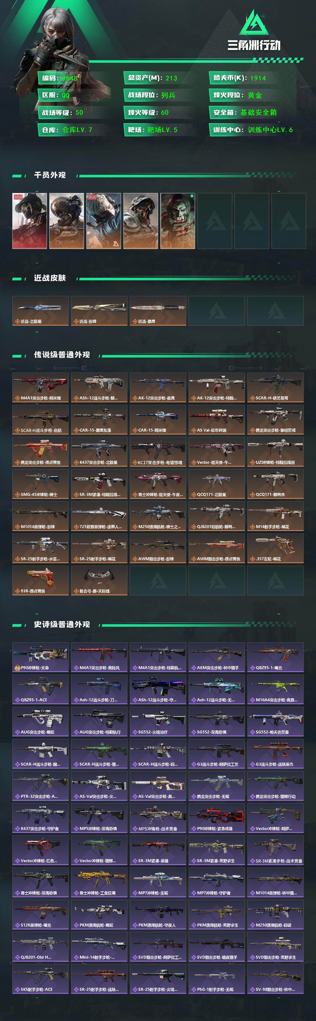 213m总资产-1914k哈伏币-60烽火等级-黄金-50战场等级-列兵【干