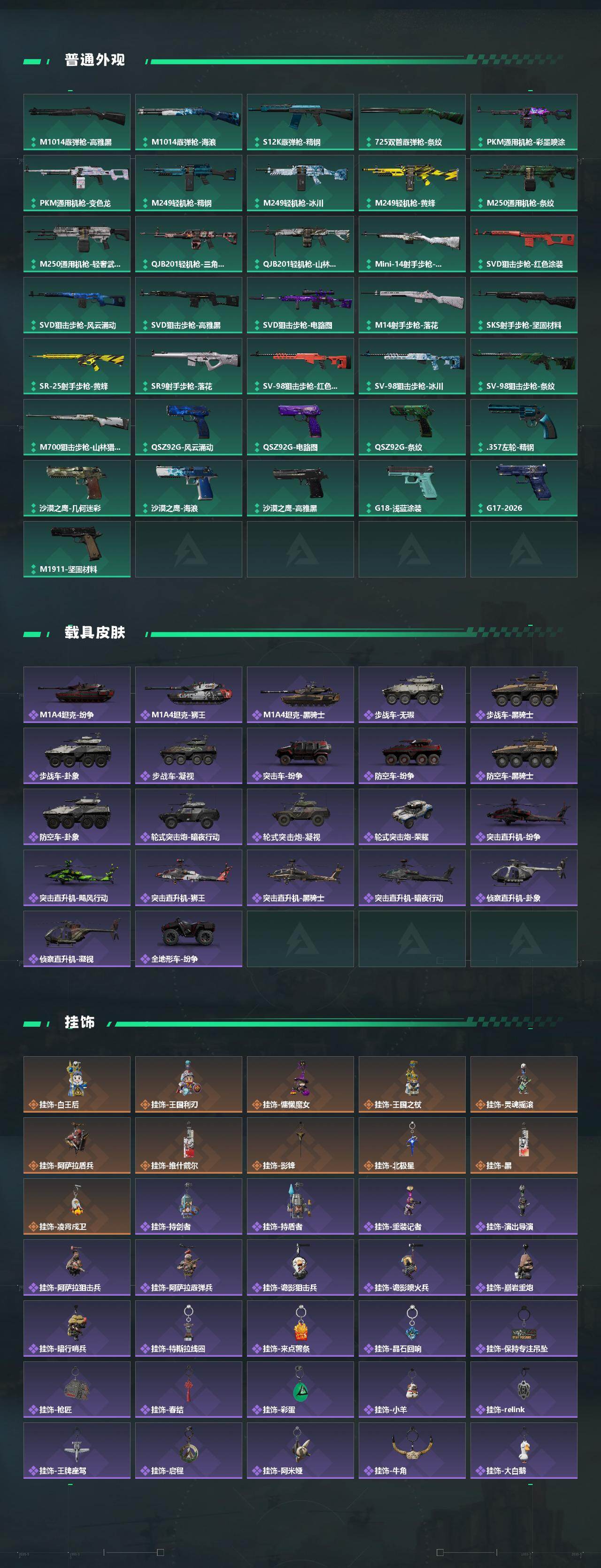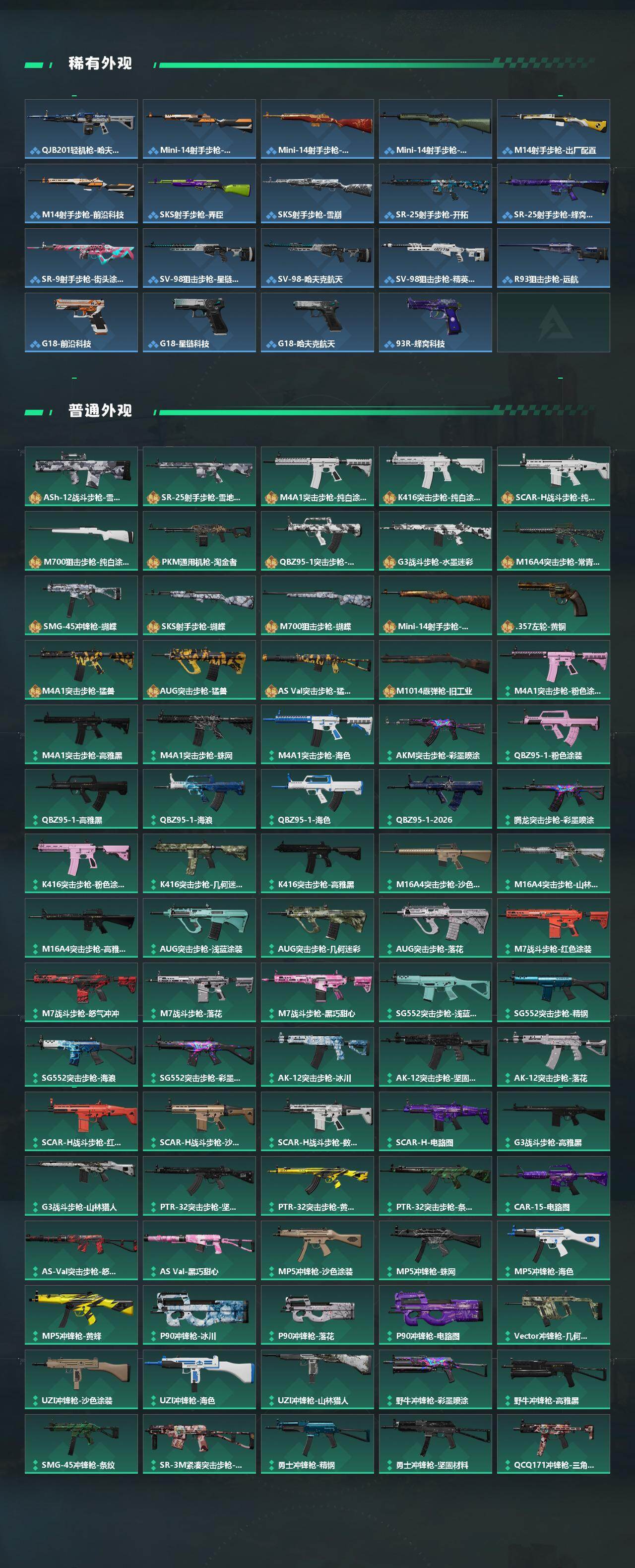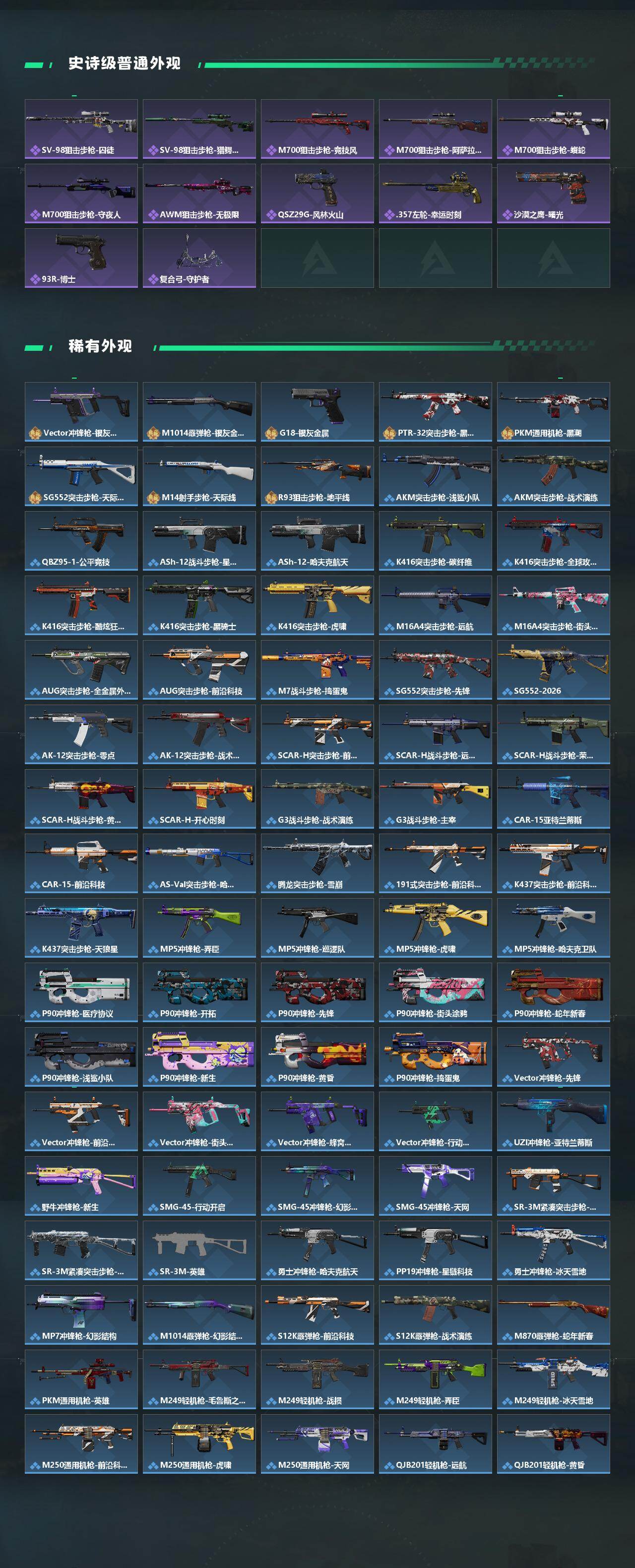 【传说外观】:M4A1突击步枪-阿米娅,ASh-12战斗步枪-鹅鸭杀,AK-12突击步枪-夜鹰,AK-12突击步枪-特斯拉线圈,SCAR-H战斗步枪-铁艺苍穹,SCAR