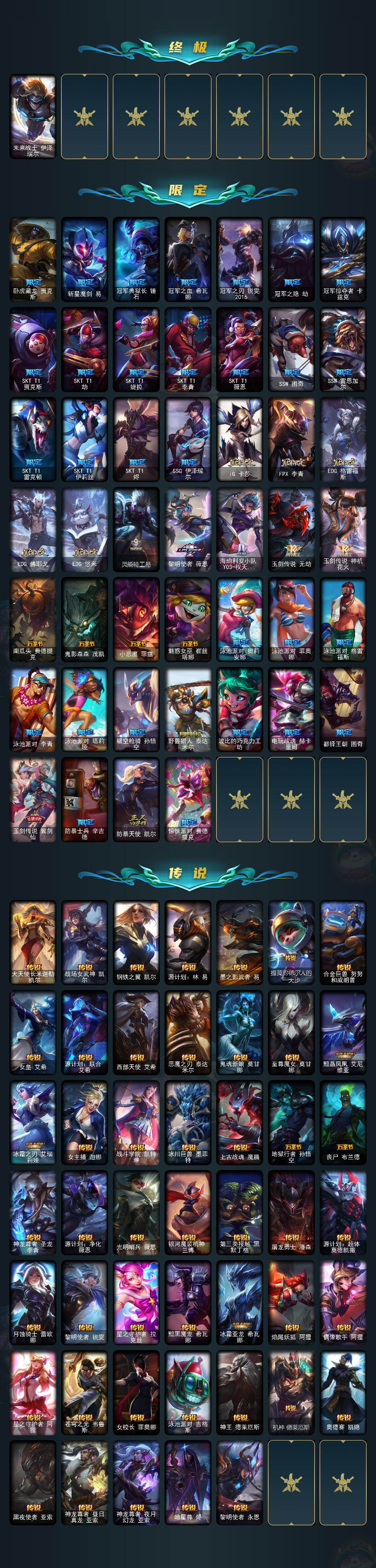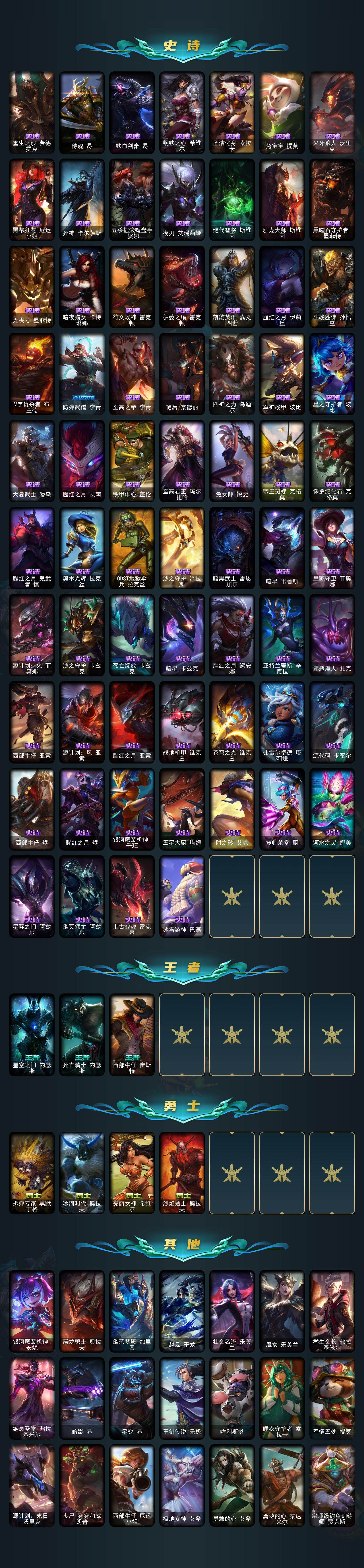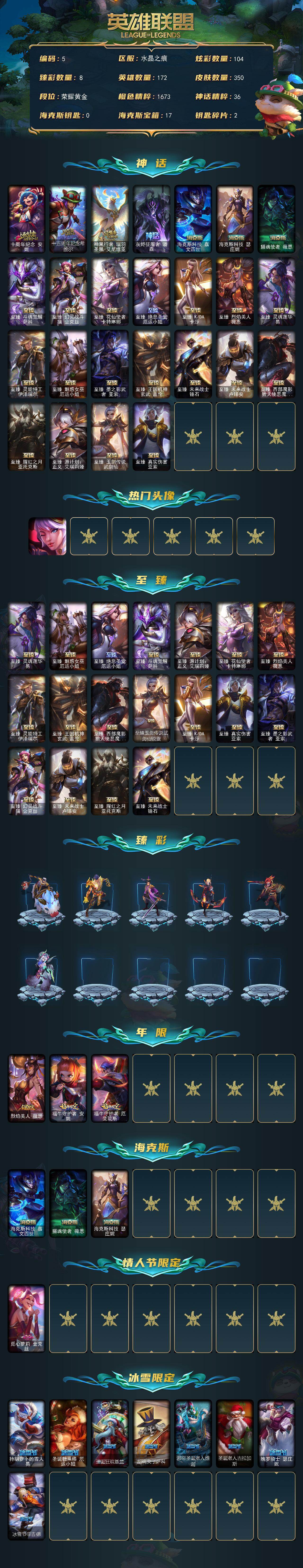 黄金段位-172英雄-350皮肤-104炫彩-1终极-25神话-58限定-47传说-67史诗