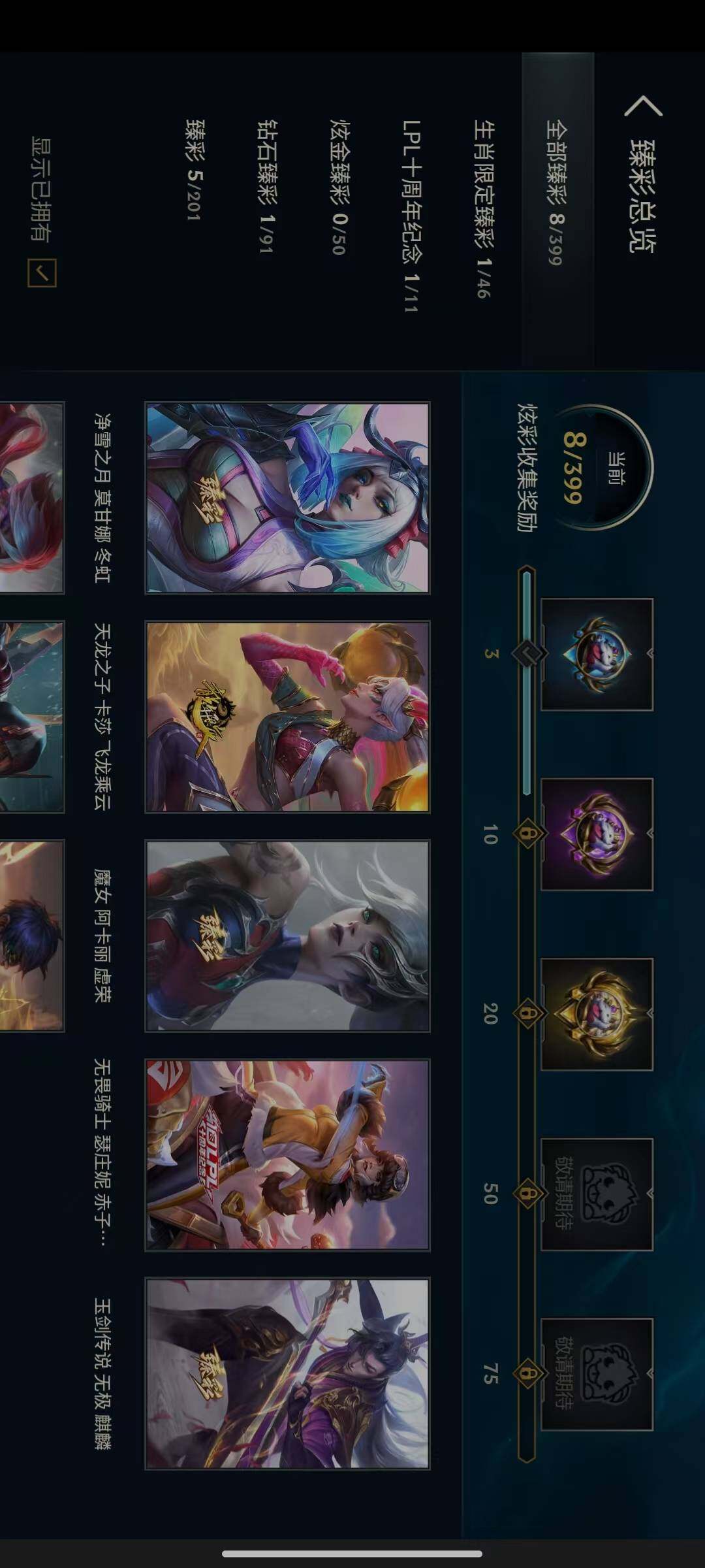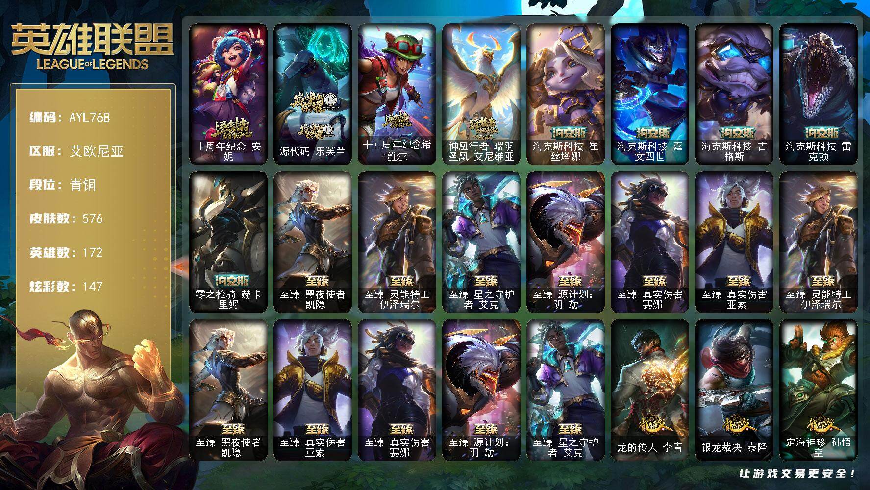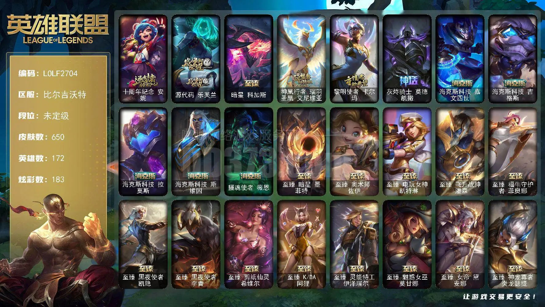 黄金段位-172英雄-350皮肤-104炫彩-1终极-25神话-58限定-47传说-67史诗
