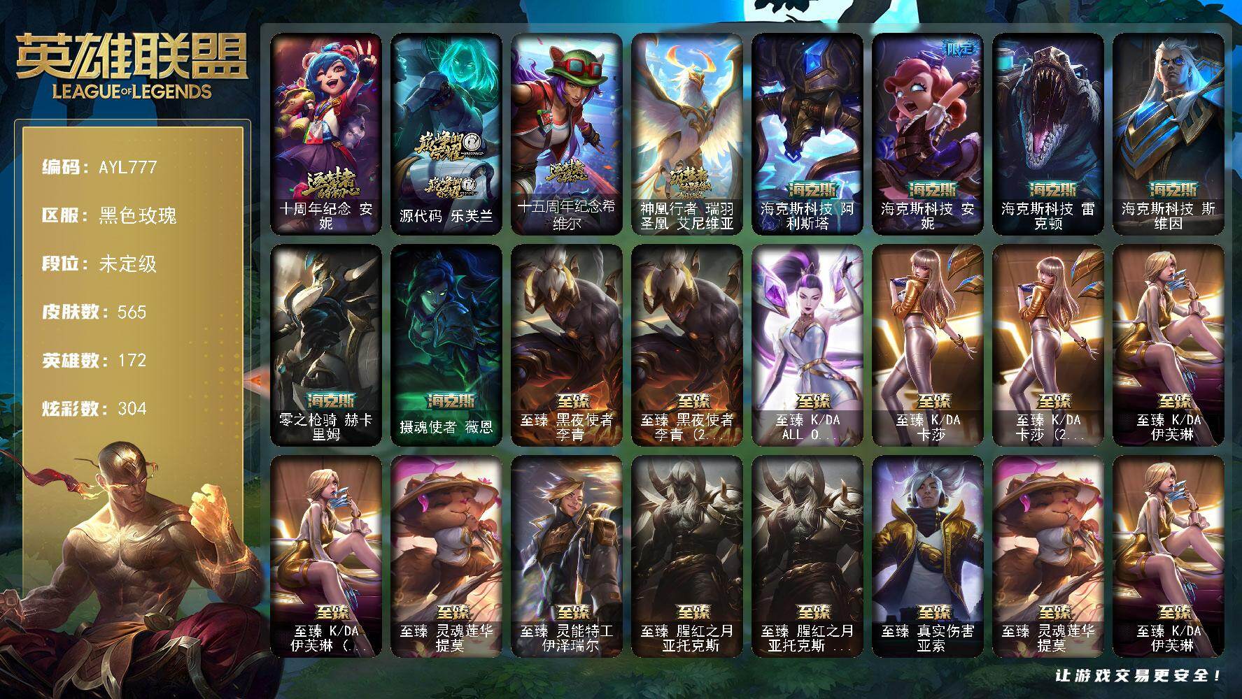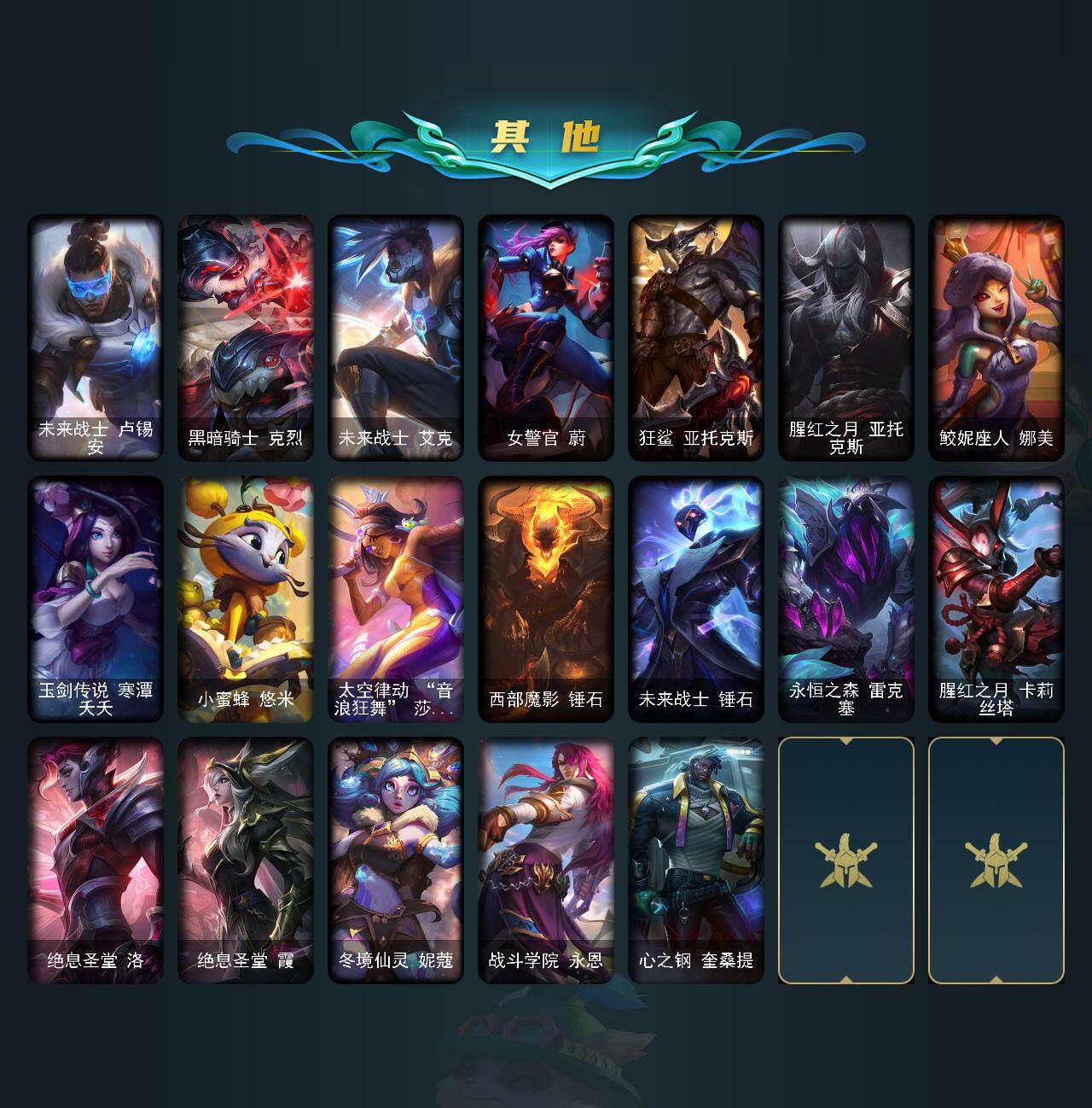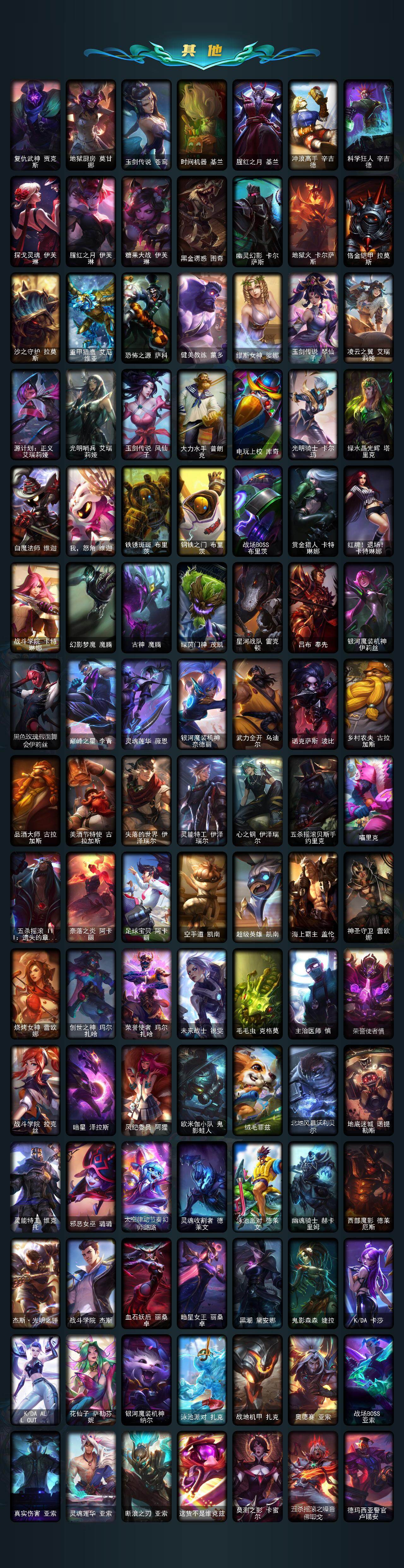 【神话皮肤】:十周年纪念安妮,十五周年纪念希维尔,神凰行者瑞羽圣凰艾尼维亚,灰烬征服者潘森,海克斯科技嘉文四世,海克斯科技瑟庄妮,摄魂使者薇恩,至臻真实伤害亚索,至臻斗魂觉醒萨科,至臻幻灵战斗猫金克丝,至臻花仙使者卡特琳娜,至臻绝息圣堂厄运小姐,至臻KDA卡莎,至臻烈焰美人薇恩,至臻灵魂莲华易,至臻灵能