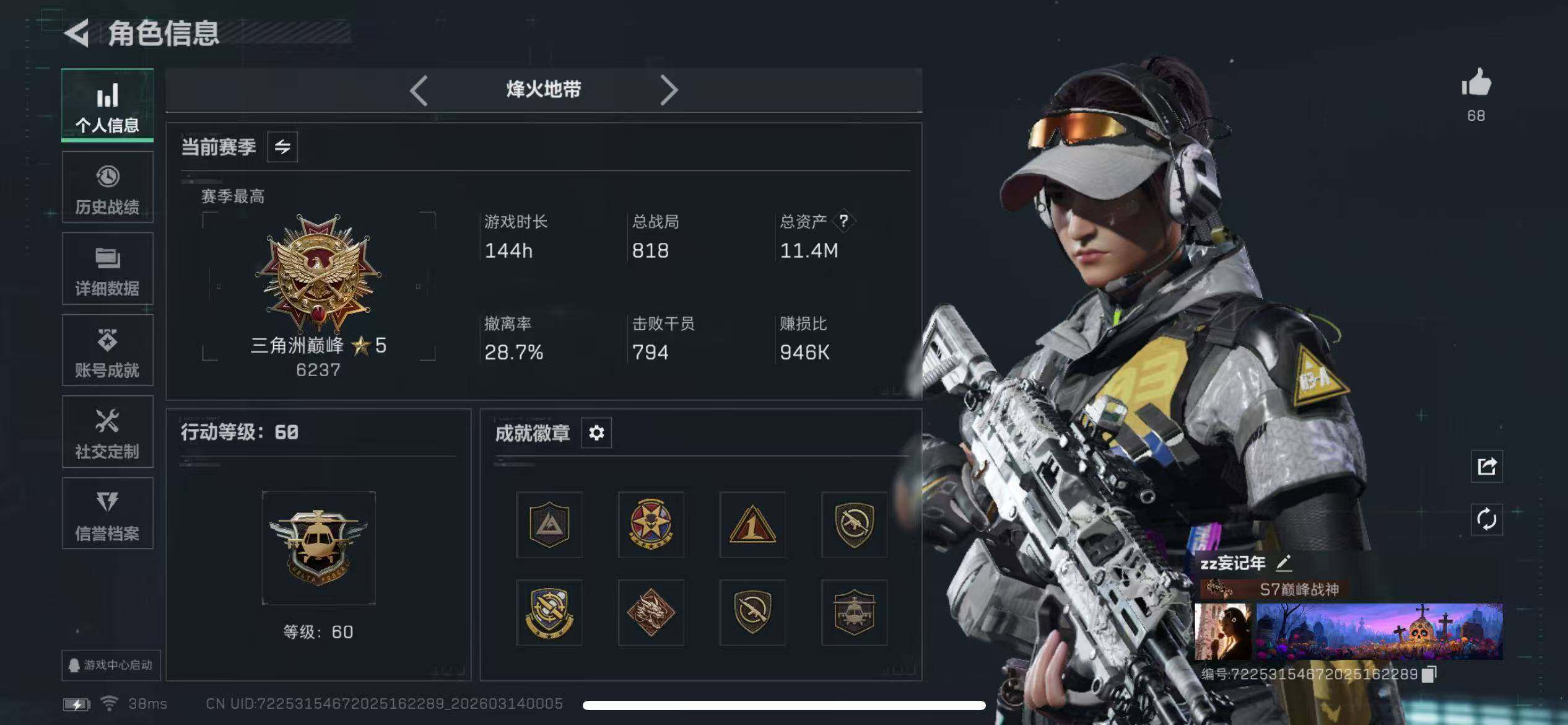 【特价出售/店主推荐】11m总资产-3k哈伏币-60烽火等级-黑鹰-18战场等