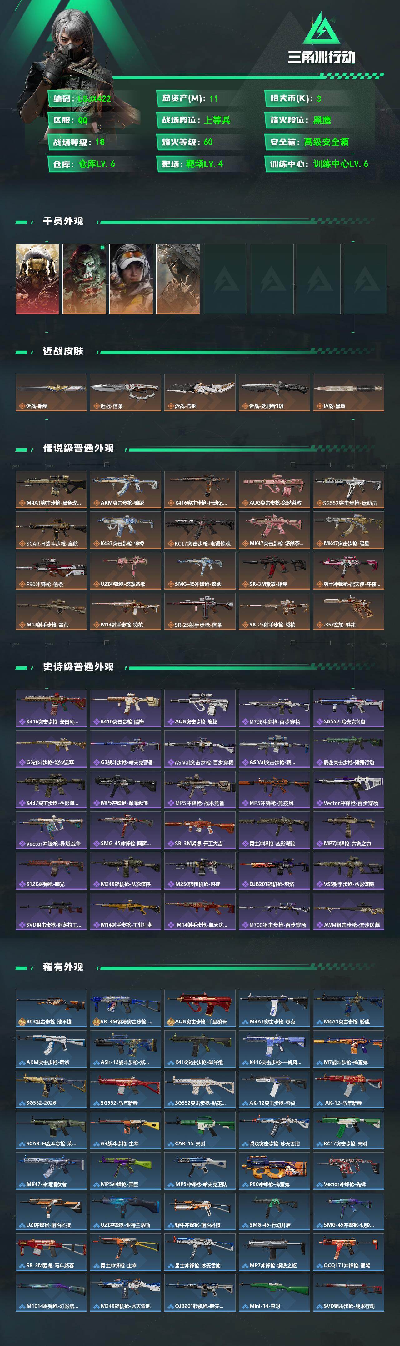 【特价出售/店主推荐】11m总资产-3k哈伏币-60烽火等级-黑鹰-18战场等级-上等兵