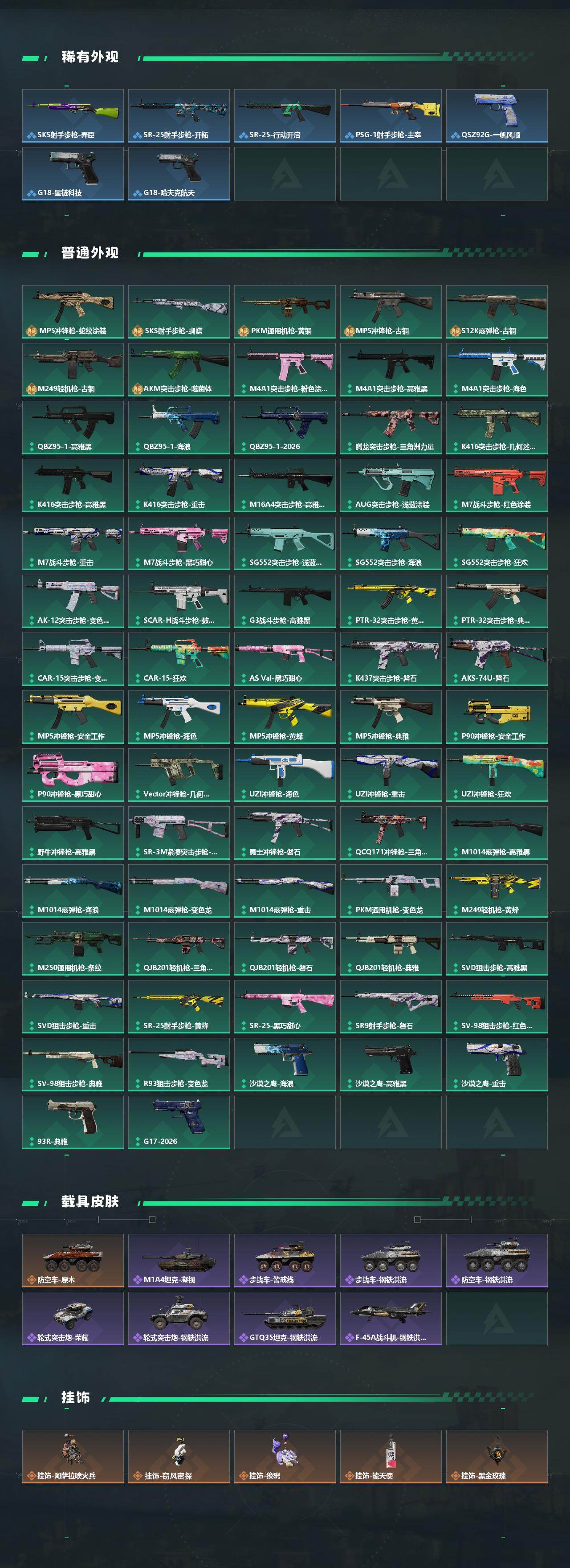 【传说外观】:M4A1突击步枪-蚀金玫瑰,AKM突击步枪-锦绣,K416突击步枪-行动记录,AUG突击步枪-悠然茶歇,SG552突击步枪-运动员,S