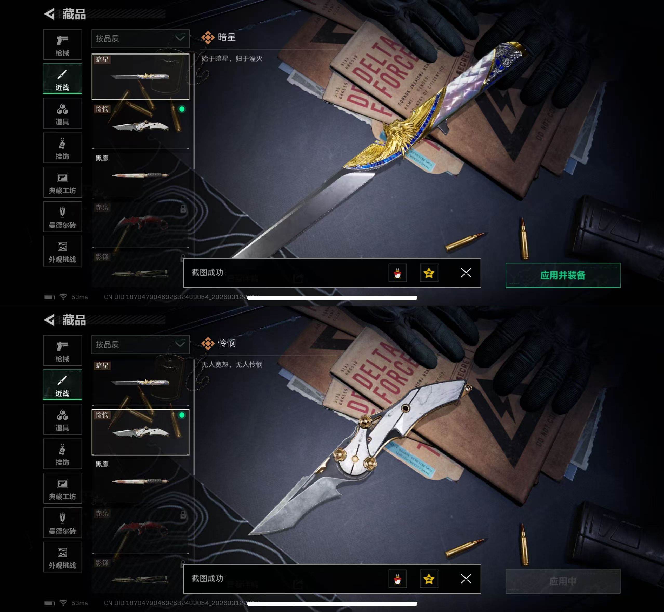 MSJ3734【热门双刀皮暗星/怜悯 4干员】三端互通-总价值49.66M-哈夫币2,299.94-烽火地带等级60-烽火地带段位黑鹰【干员皮肤】露娜-金牌射手 红狼-电锯惊魂 乌鲁鲁-荒原猎手 深蓝-不破誓约【近战武器】黑鹰 怜悯 暗星【枪皮】PTR-32徒步几千-噬菌体 PTR-32徒步几千-噬菌体 SG552突击步枪-彩墨涂鸦 AUG突击步枪-旧梦 M4A1突击步枪-粉色涂装 M4A1突击步枪-高雅黑 M4A1突击步枪-海色 M4A1突击步枪-繁盛 M4A1突击步枪-阿米娅 AKM突击步枪
