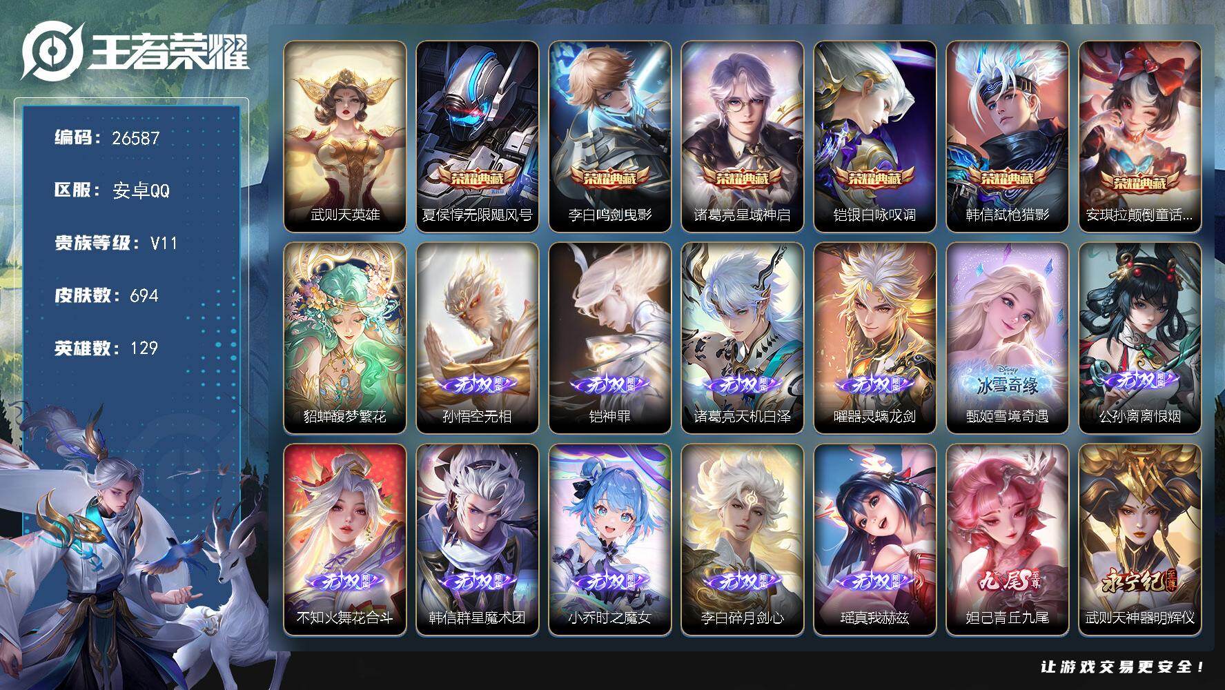 【高质量推荐·17典藏·1珍品无双·8无双·7珍品·6星传说·118传说·全套慕夏·5.4W流光积分·2.3W亲密度灵宝·小兵露营小黄鸭·珍品无双馥梦繁花·时之魔女·雪境奇遇·器灵螭龙剑·韩信群星魔术团·天机白泽·青丘九尾·紫瑶·柔柔宝·满牛年限定·满虎年限定·满龙年限定·满蛇年限定·可二次】YXw19641-苹果Q-129英雄-695皮肤-20王者印记-300铭文