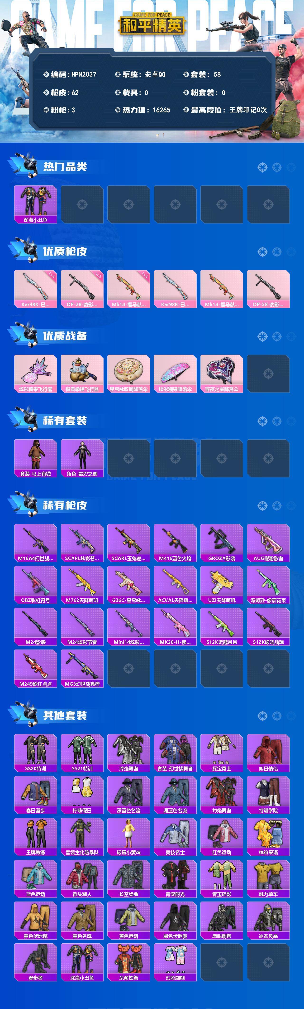 【HPN2037】58套装/枪械3/装备47/战备36/热力值16265/五级Kar98K-巳巳如意/五级Mk14-福马献瑞/五级DP-28-豹影疾电/深海小丑鱼/Kar98K-巳巳如意/Mk14-福马献瑞/DP-28-豹影疾电/炫彩糖果飞行器/极意拳锋飞行器/星穹咏叹调降落伞/炫彩糖果降落伞/罪夜之冕降落伞/套装-雪国风尚/套装-炫彩糖果/套装-马上有钱/角色-霜刃之御/AUG-冰晶雪宝/M16A4-幻世战舞者/SCAR-L-炫彩节奏/SCAR-L-玉兔迎春/M416-蓝色火焰/GROZA-影