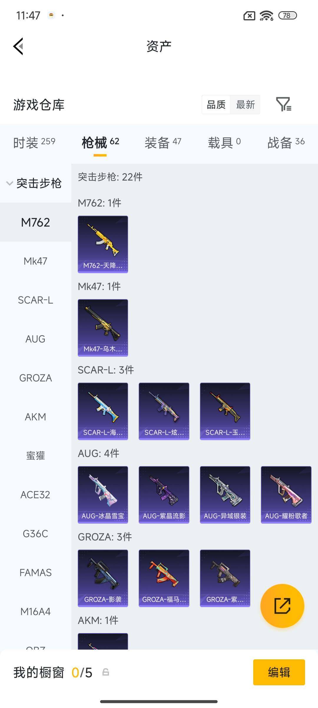 58套装/枪械3/装备47/战备36/热力值16265/五级Kar98K-巳巳如意/五级Mk14-福马献瑞/