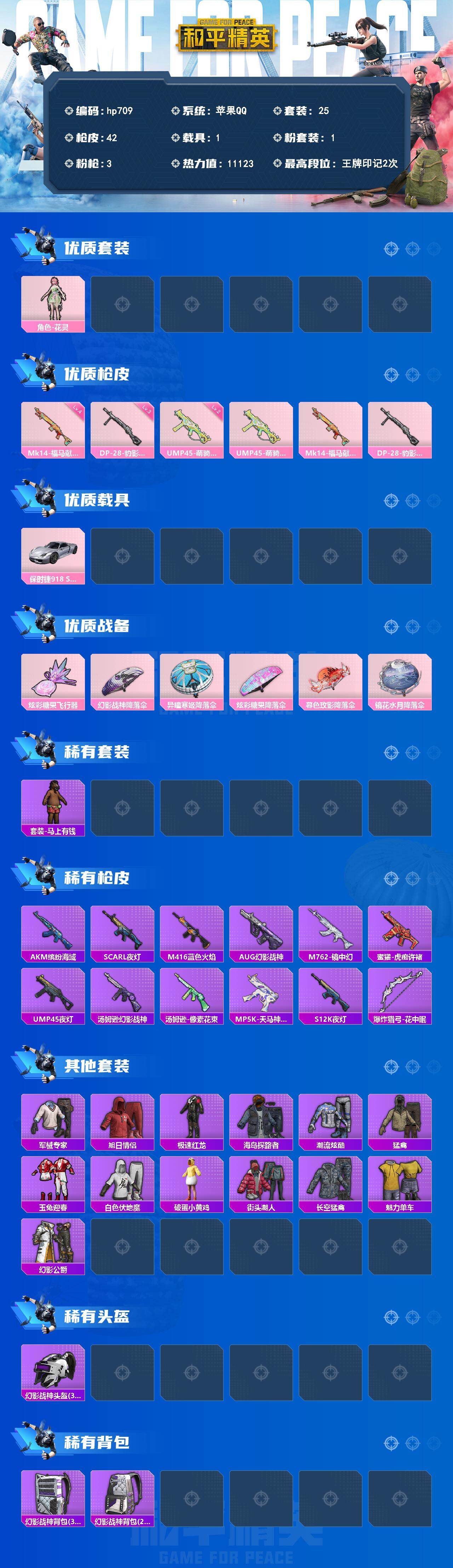 苹果 手Q-1粉装-3特效枪-1载具-1粉色飞行器-11123热力值-2王牌印记-25套装-42枪皮
