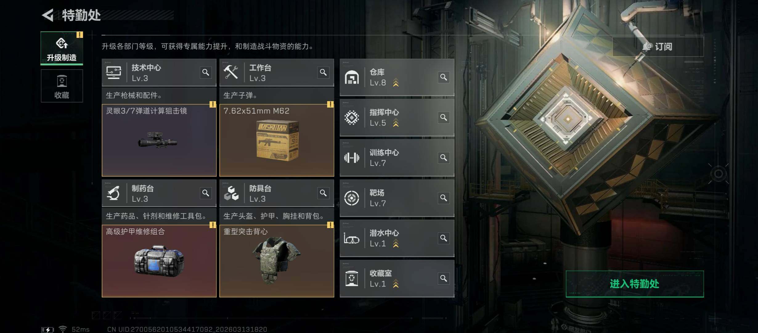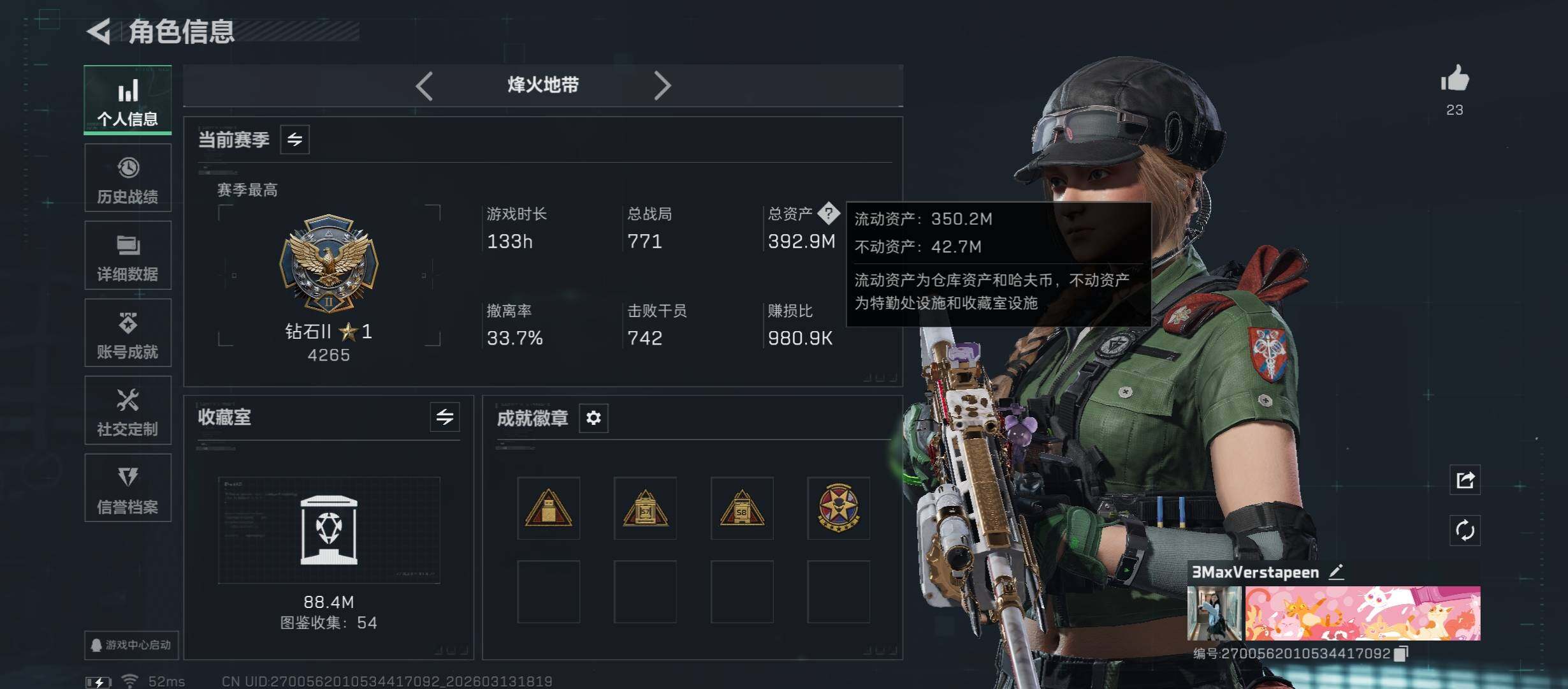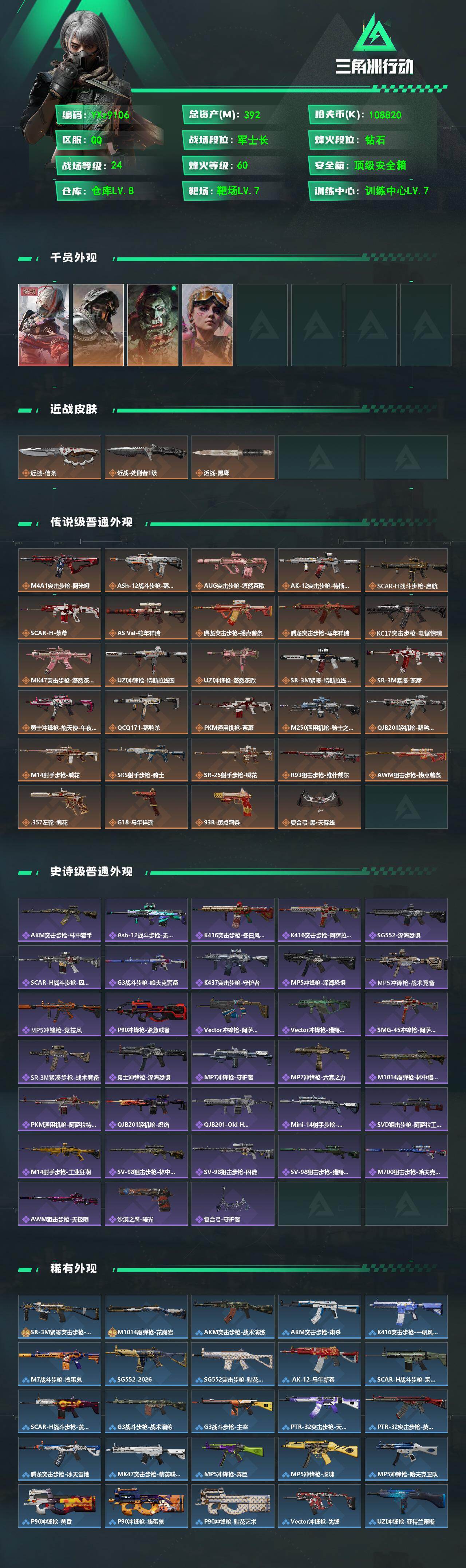 【热门组合搭配,单红+信条-维什戴尔】【Q区三端互通】【无二次】YXz9106-特勤处:仓库8级/靶场7级/训练中心7级-总资产392m-哈夫币108m-烽火等级:60级