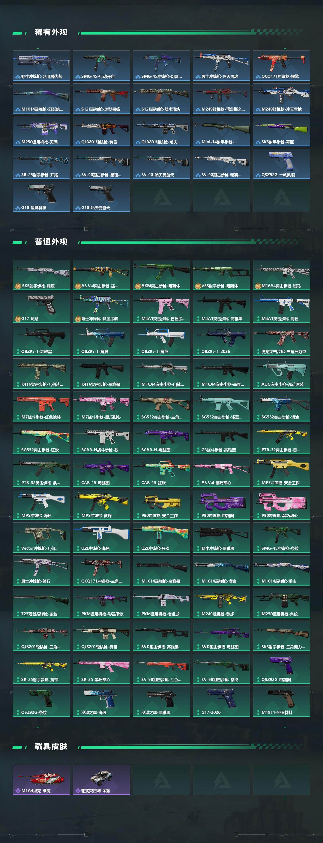【传说外观】:M4A1突击步枪-阿米娅,ASh-12战斗步枪-鹅鸭杀,AUG突击步枪-悠然茶歇,AK-12突击步枪-特斯拉线圈,SCAR-H战斗步枪-启航,SCAR-H战斗步枪-荼蘼,AS Val