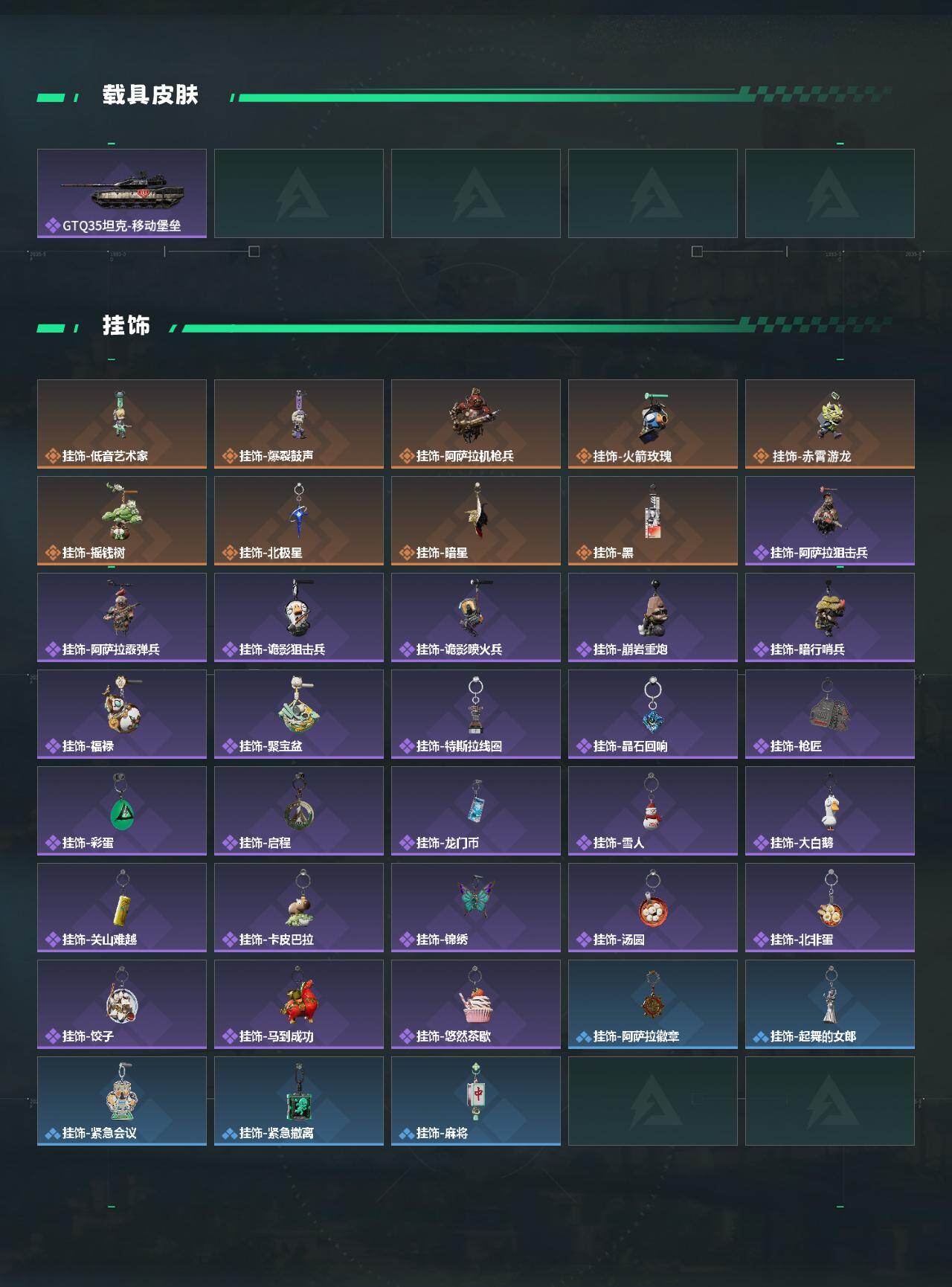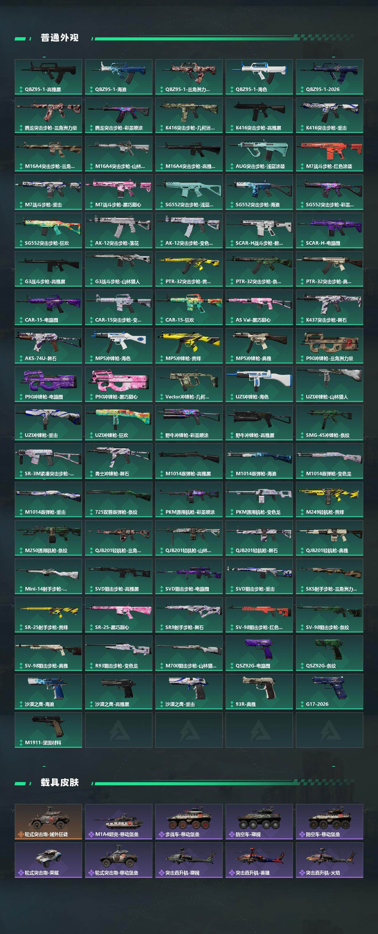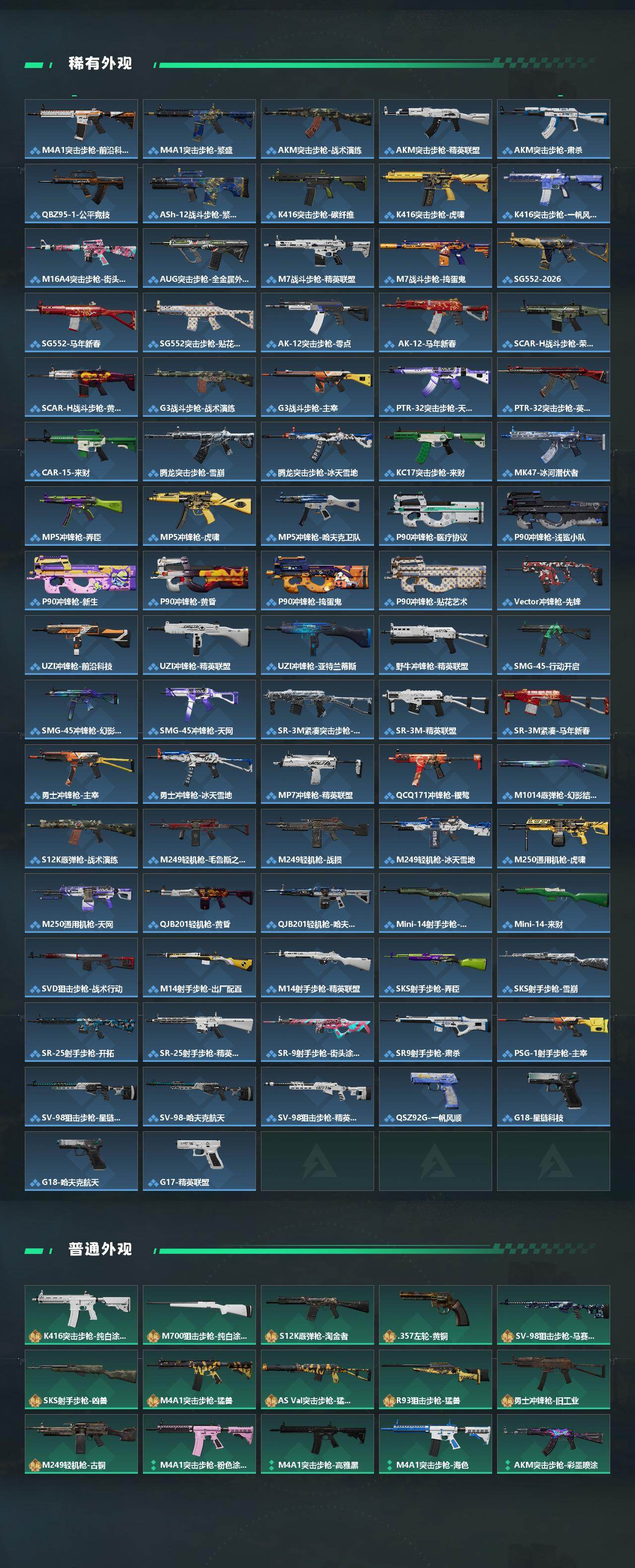 【传说外观】:AKM突击步枪-锦绣,ASh-12战斗步枪-鹅鸭杀,AUG突击步枪-悠然茶歇,M7战斗步枪-零度协议,M7战斗步枪-怜悯,SG552突击步枪-运动员,AK-12突击步枪-特斯拉线圈,SCAR-H战斗步枪-启航,CAR-