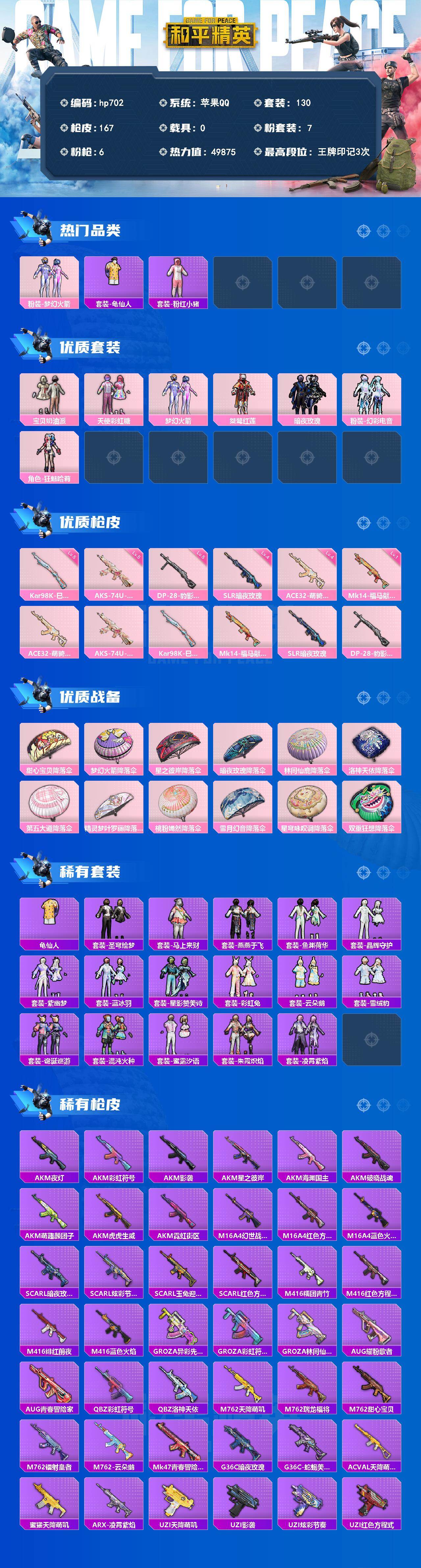 苹果 手Q-7粉装-6特效枪-0载具-0粉色飞行器-49875热力值-3王牌印记-130套装-167枪皮