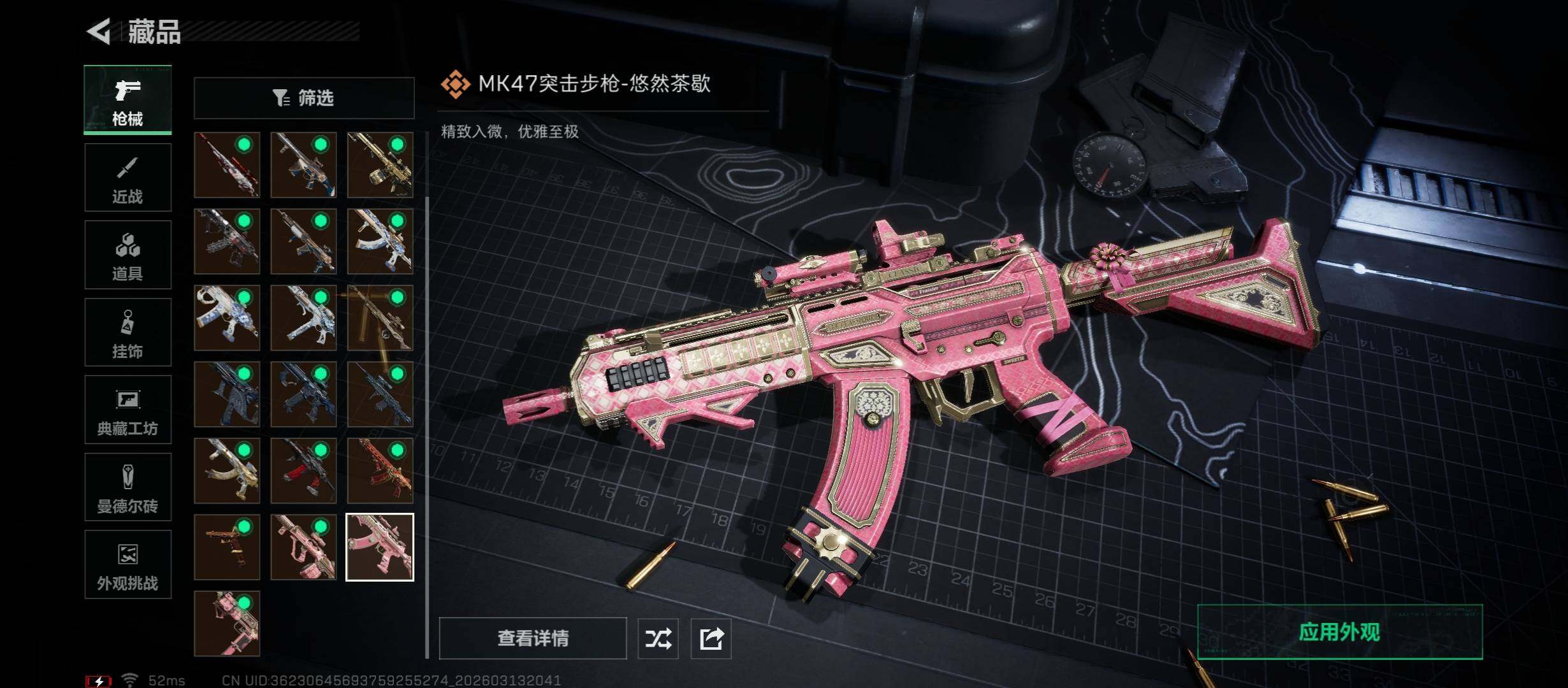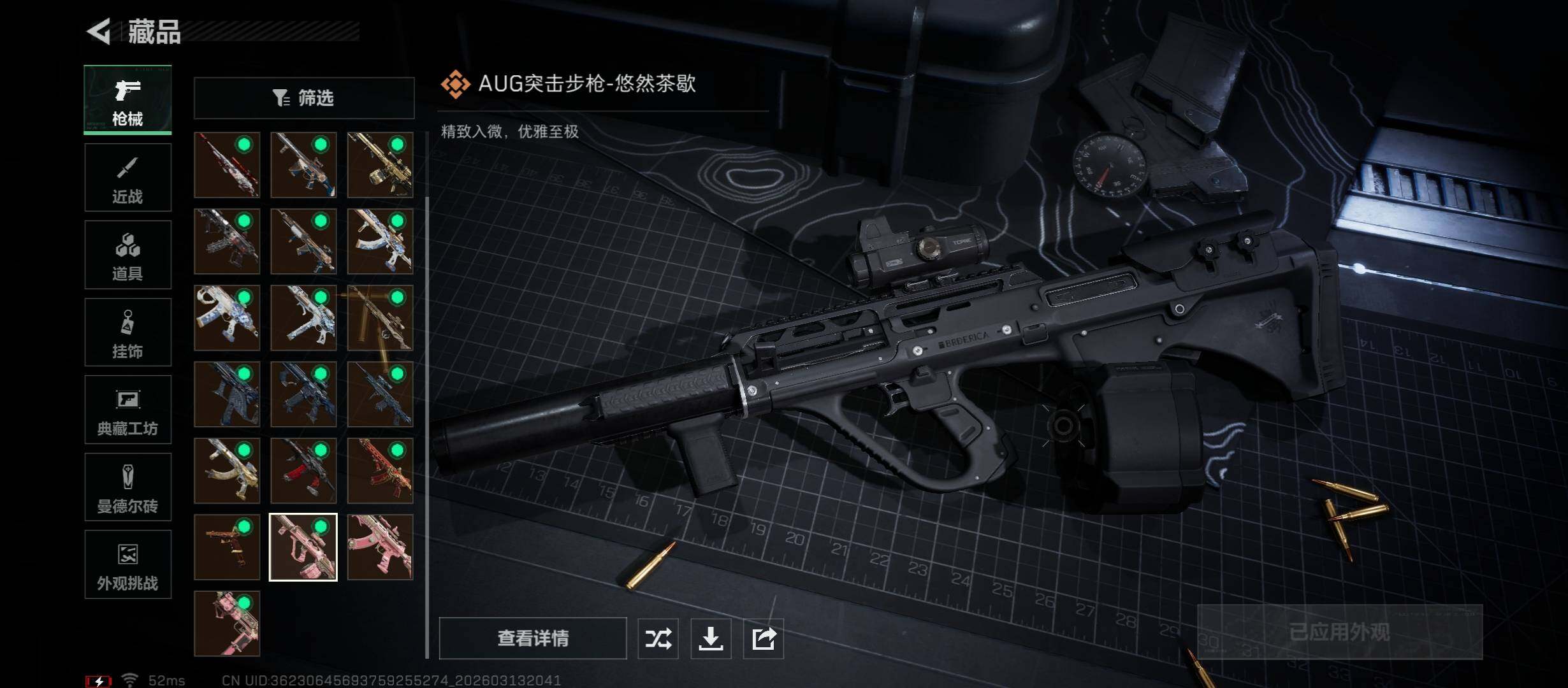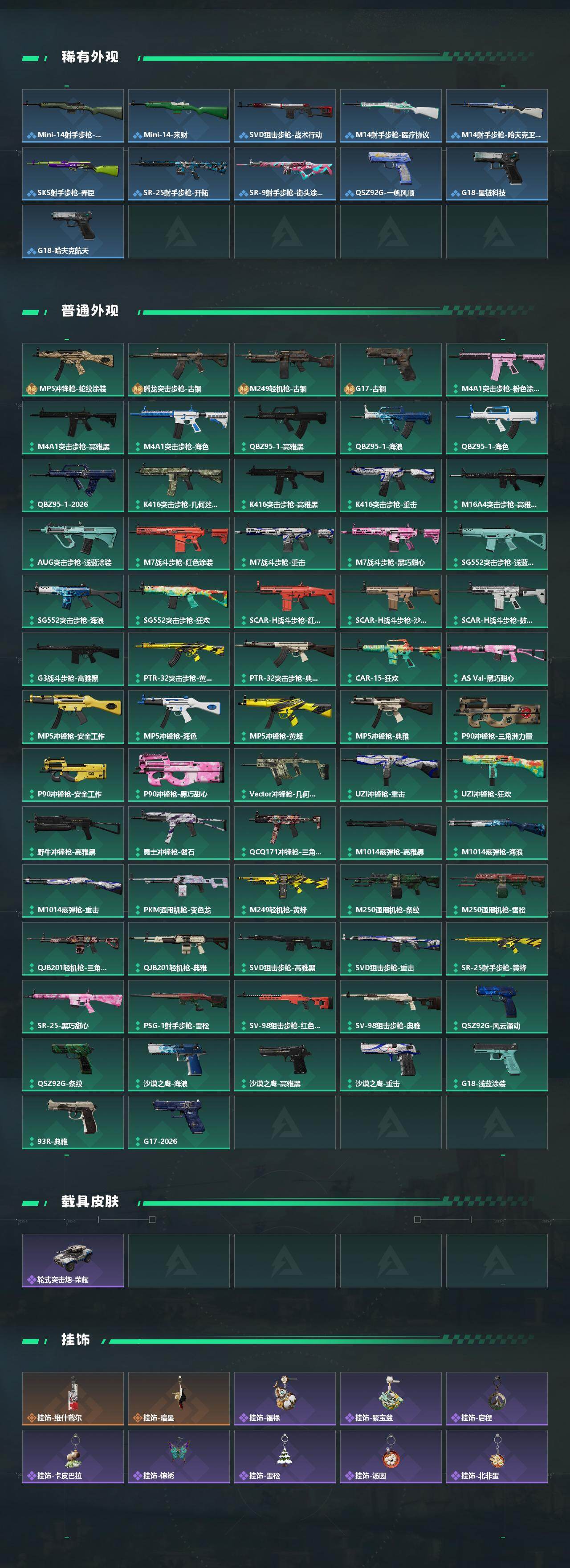 【传说外观】:M4A1突击步枪-蚀金玫瑰,AKM突击步枪-锦绣,AUG突击步枪-悠然茶歇,SCAR-H战斗步枪-启航,G3战斗步枪-骑士,腾龙突击步枪-马年祥瑞,K437突击步枪-锦绣,KC17突击步枪-电锯惊魂,MK47突击步枪-悠