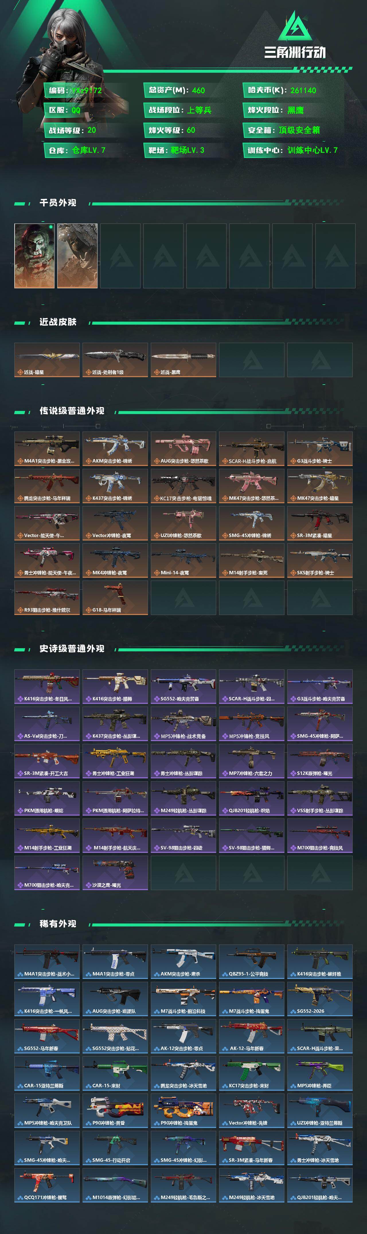 【裸暗星刀皮.460M资产】【Q区三端互通】【无二次】YXz9172-特勤处:仓库7级/靶场3级/训练中心7级-总资产460m-哈夫币261m-烽火等级:60级