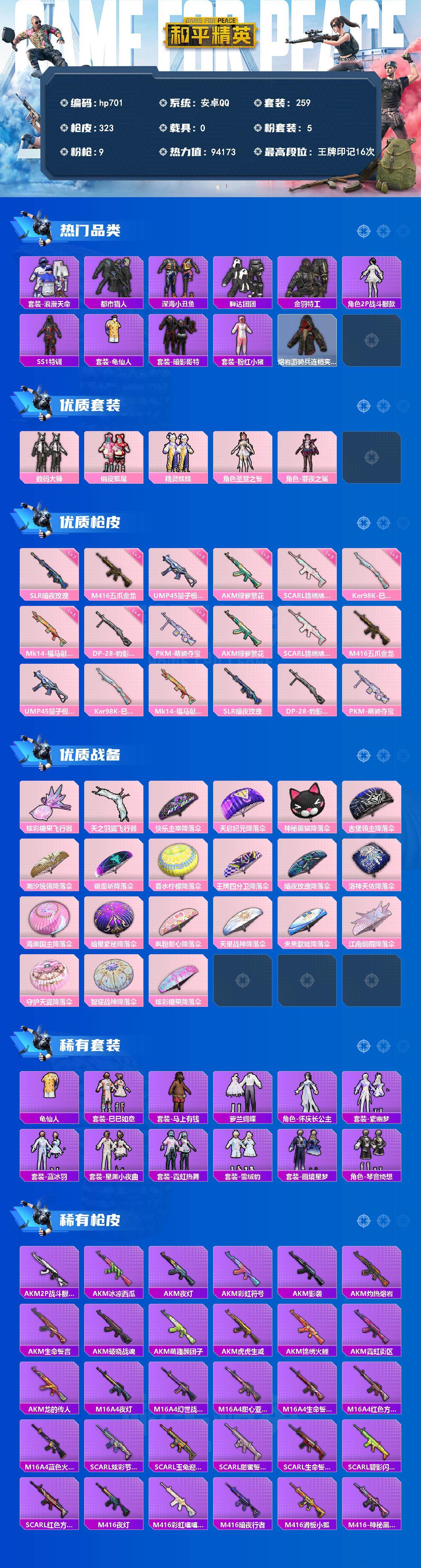 安卓 手Q-5粉装-9特效枪-0载具-2粉色飞行器-94173热力值-16王牌印记-259套装-323枪皮
