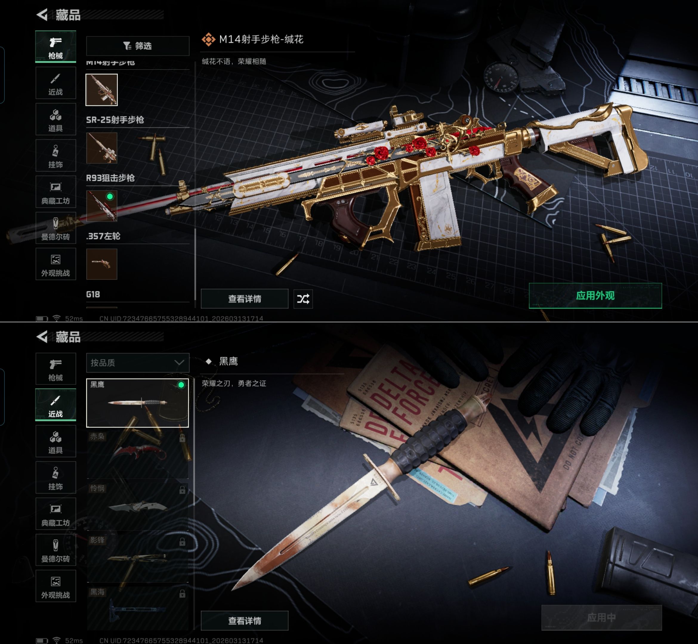 MSJ3745【总资产(M)】62.52【哈夫币】34199k【行动等级】36【烽火地带段位】白银【干员皮肤】 骇爪-水墨云图 骇爪-维什戴尔 【近战武器】 黑鹰 【枪皮】M4A1突击步枪-粉色涂装 M4A1突击步枪-隐秘行动 M4A1突击步枪-海色 AKM突击步枪-锦绣 QBZ95-1突击步枪-高雅黑 QBZ95-1突击步枪-2026 AKS-74U突击步枪-冰天雪地 ASh-12战斗步枪-鹅鸭杀 K416突击步枪-几何迷彩 M16A4突击步枪-三角洲力量 M16A4突击步枪-高雅黑 M7战斗