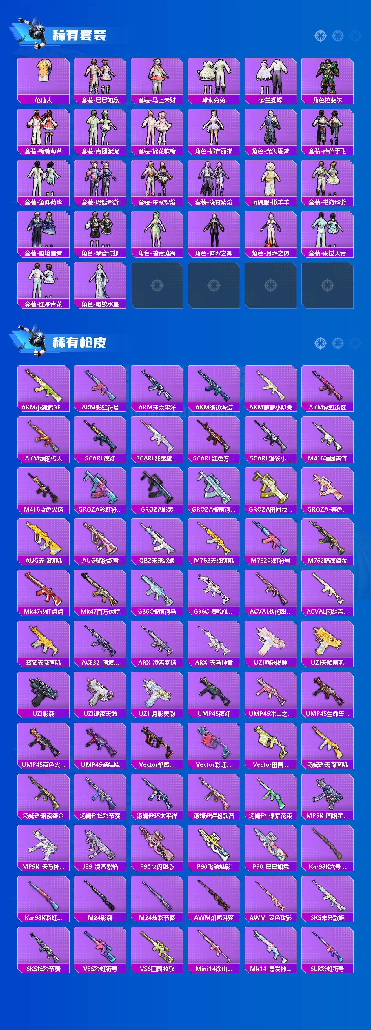 【粉色套装】:粉装-水曜玄武,粉装-冰霜白皇,粉装-彩虹鹿灵,粉装-第五大道,粉装-莲影清波,角色-月影灵韵,角色-狂魅哈莉,角色-罪夜之冕,人物-小舞·恋语,角色-虎痴许褚
