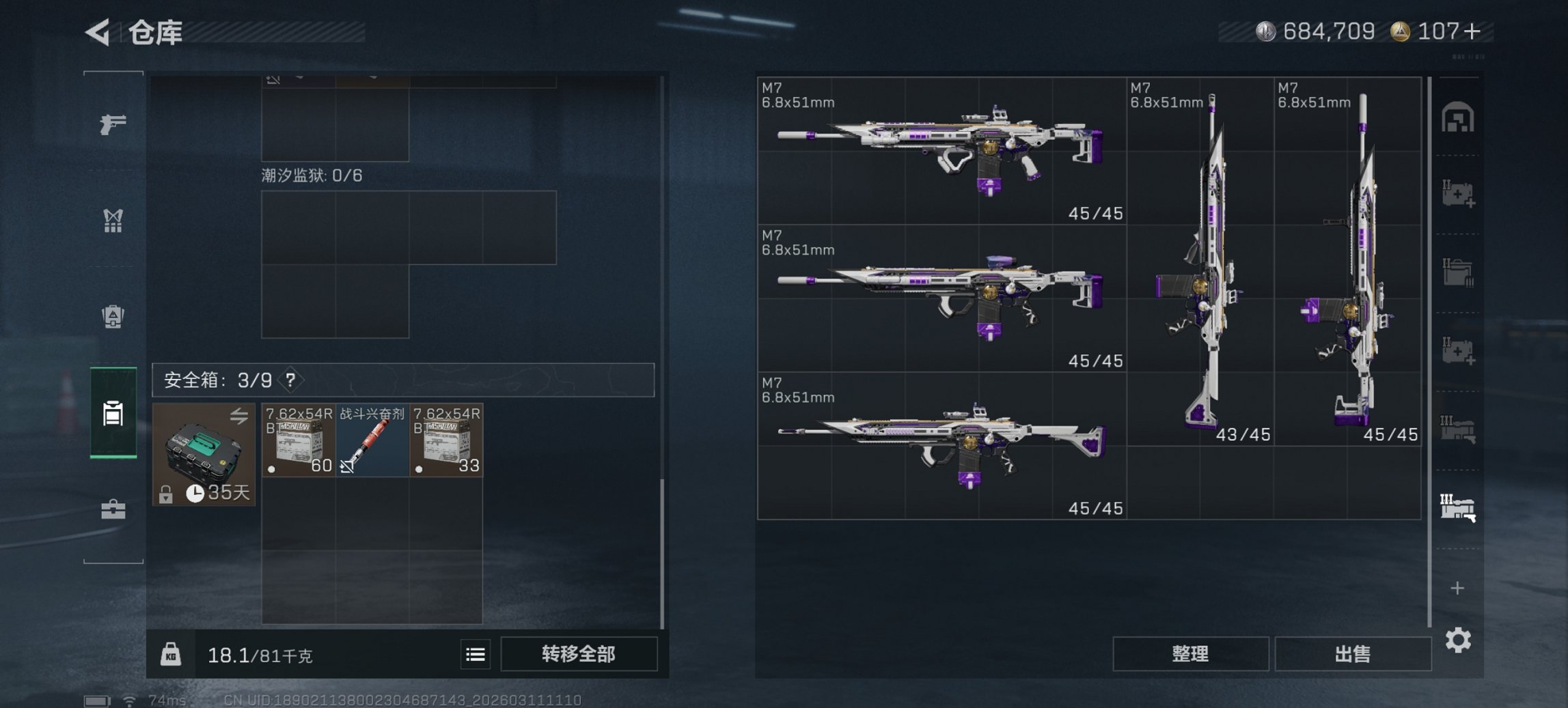 【暗星 S8赛季顶级安全箱 5颗AW子弹 总资产93M,哈夫币684K,行动等级:60,近战数量:1,仓库等级:8级,训练中心等级:7级,靶场等级:5级,干员皮肤:2,枪皮:122 秒换绑不用等】