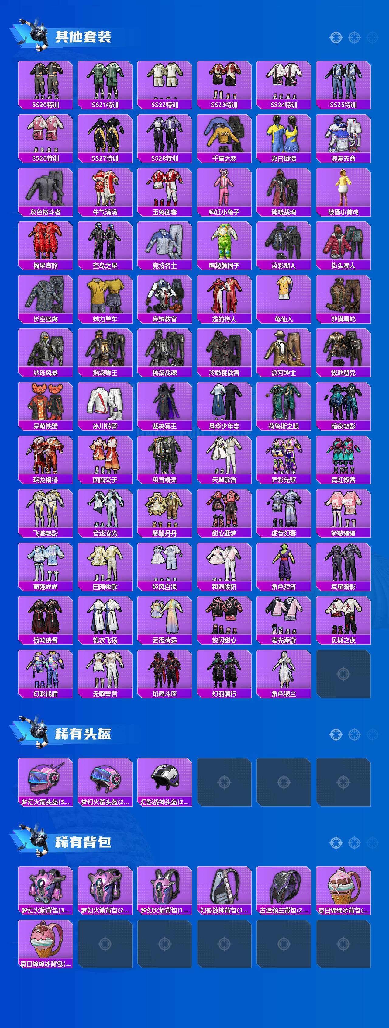 【粉色套装】:粉装-梦幻火箭,粉装-飓风飞鹰,粉装-暗夜玫瑰,角色-星云暗核,角色-烟云彩露