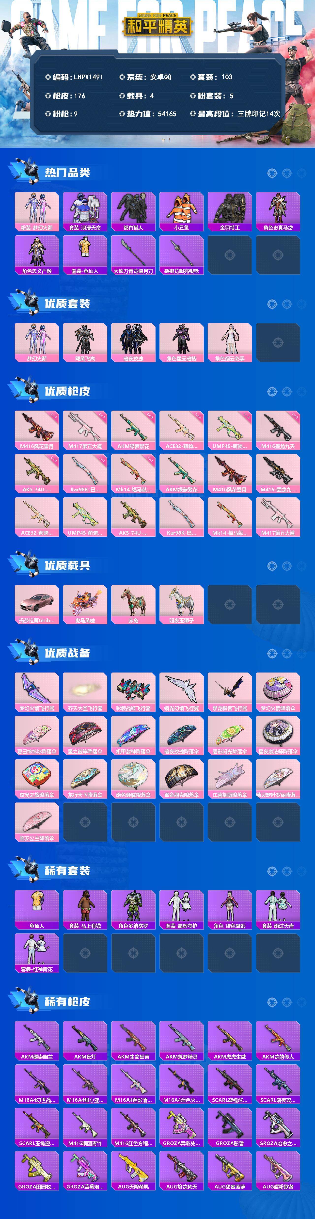 【特价出售/店主推荐】安卓 手Q-5粉装-9特效枪-4载具-5粉色飞行器-54165热力值-14王牌印记-103套装-176枪皮