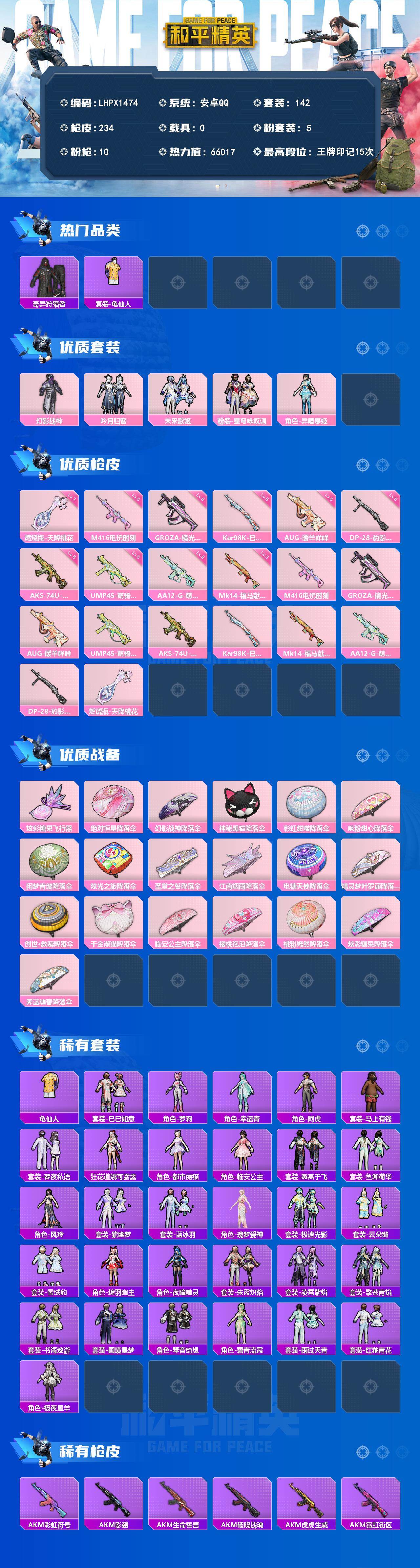 安卓 手Q-5粉装-10特效枪-0载具-1粉色飞行器-66017热力值-15王牌印记-142套装-234枪皮
