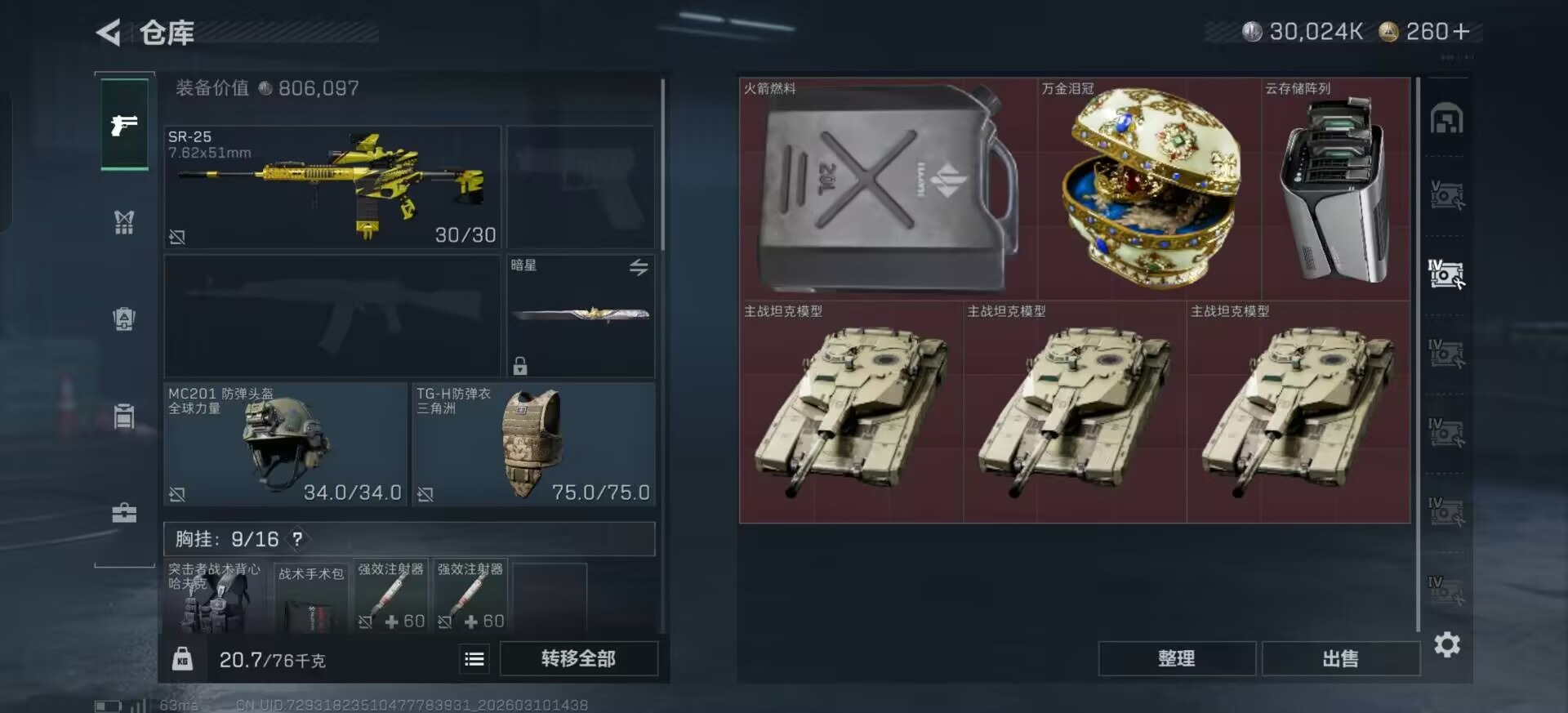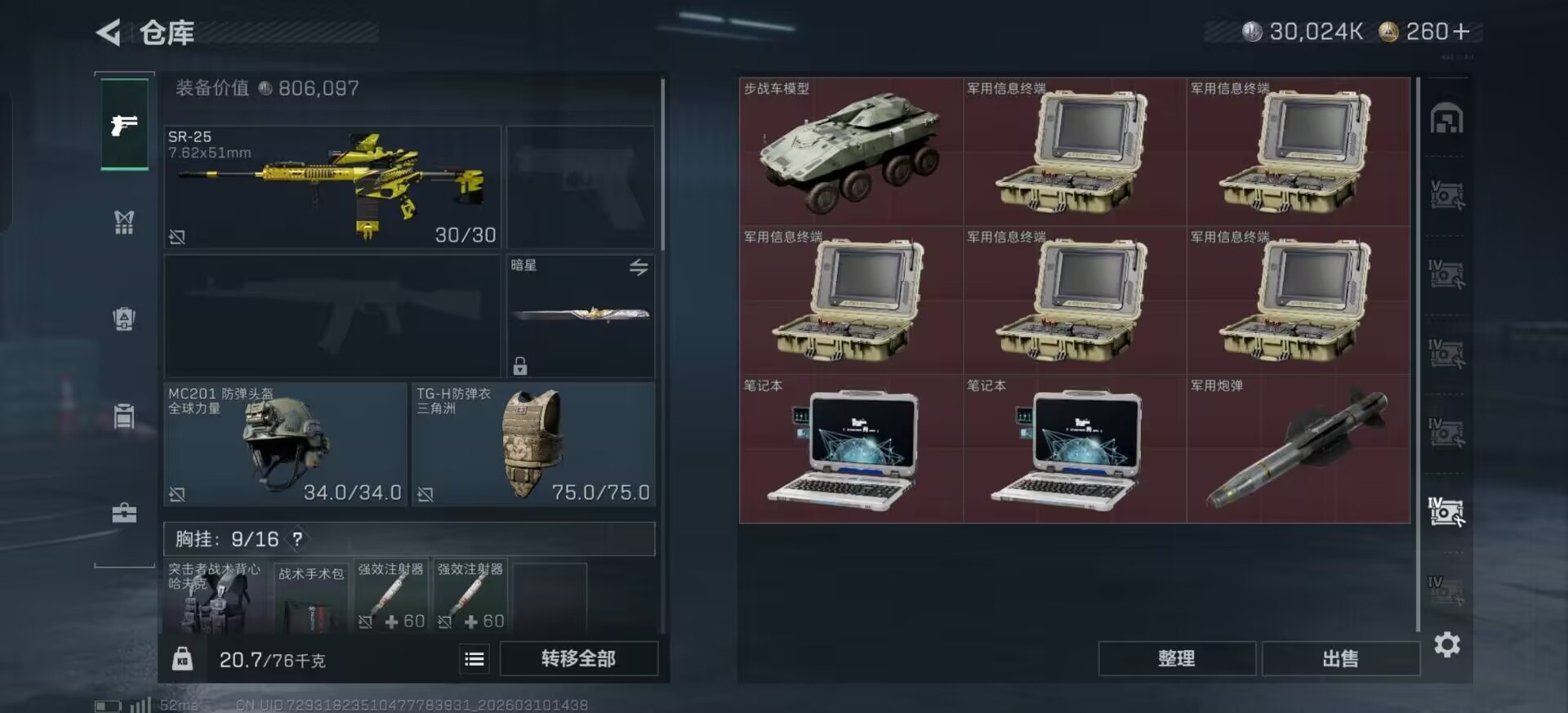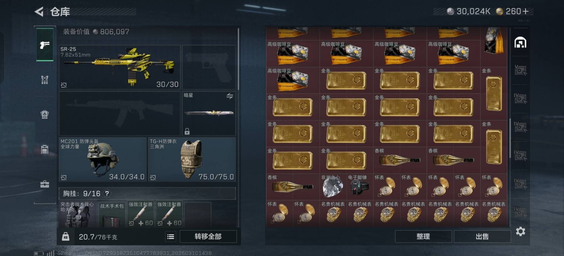 总资产:205.1M 1干员外观 2近战传说 10传说枪械 哈夫币:30.024K