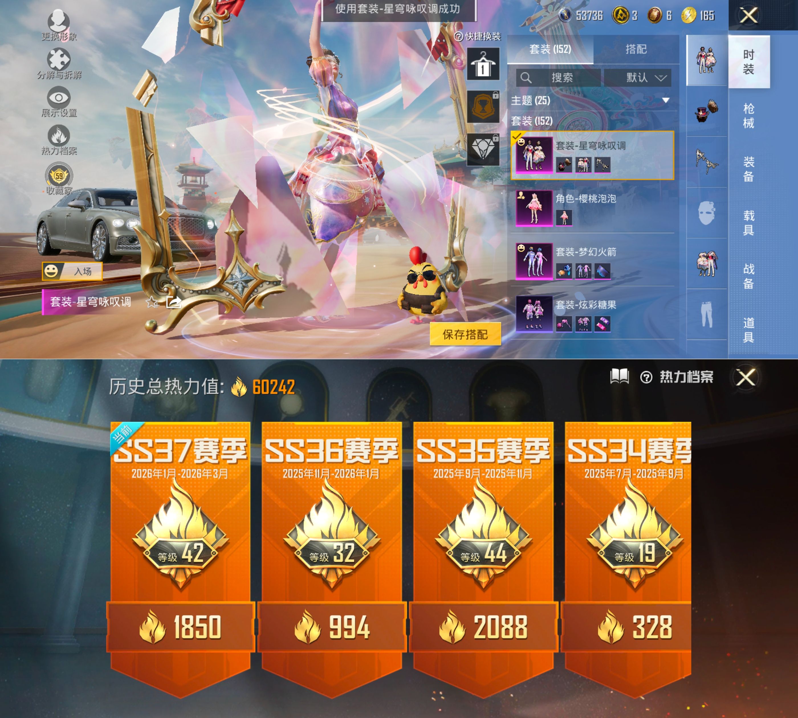 1载具-3粉装-10特效枪-152套装-198枪皮-9王牌印记-荣耀皇冠Ⅴ-60242热力值