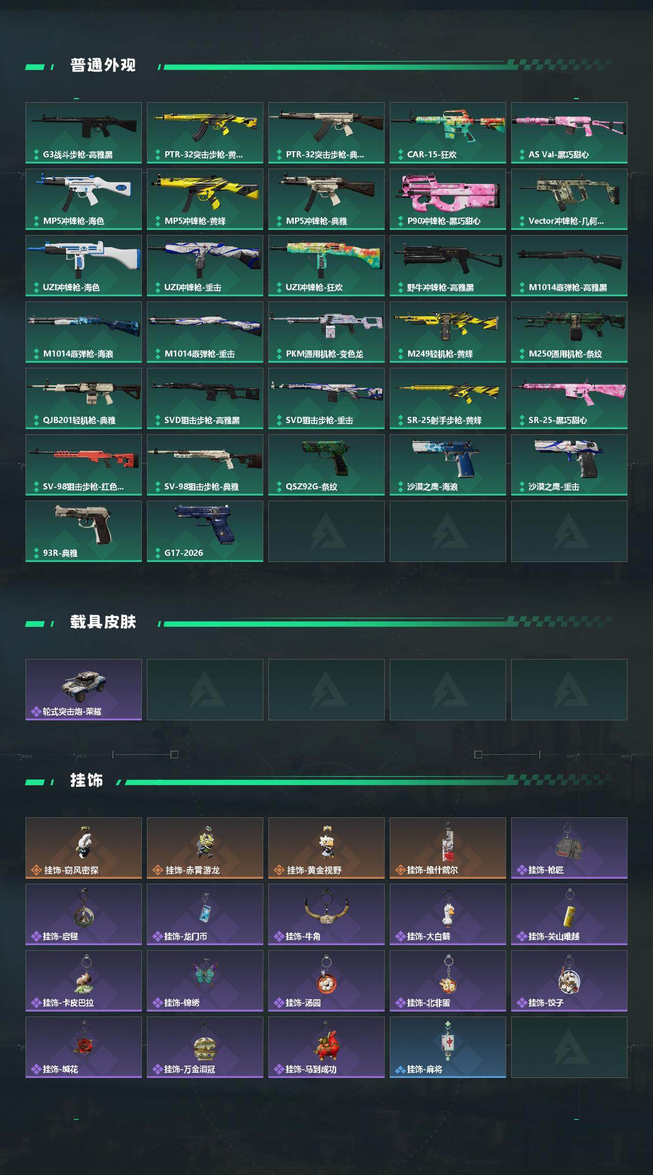 【传说外观】:M4A1突击步枪-阿米娅,AKM突击步枪-锦绣,ASh-12战斗步枪-鹅鸭杀,K416突击步枪-行动记录,SCAR-H战斗步枪-启航,G3战斗步枪-骑士,CAR-15突击步枪-阿米娅,腾龙突击步枪-马年祥瑞,腾龙突击步枪-万金泪冠,K437突击步枪-锦绣,SMG-45冲锋枪-锦绣,勇士冲锋枪-万金泪冠,QCQ171冲锋枪-鹅鸭杀,QJB