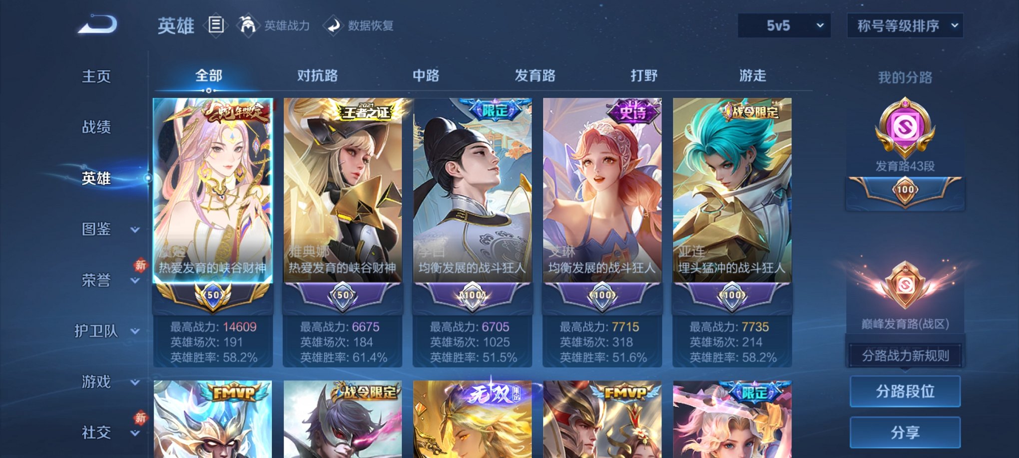 V10 国服虞姬415皮肤3水晶3无双2珍品55传说2星元发育路43段