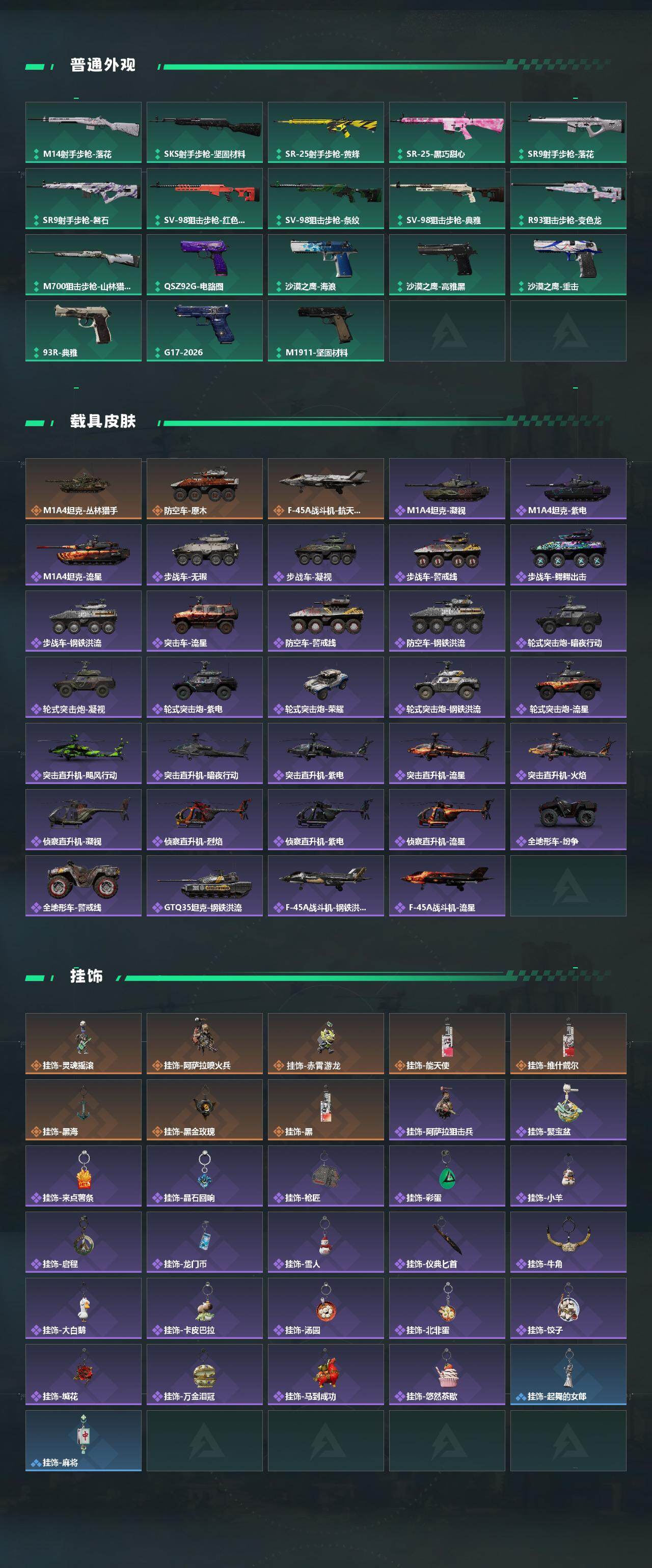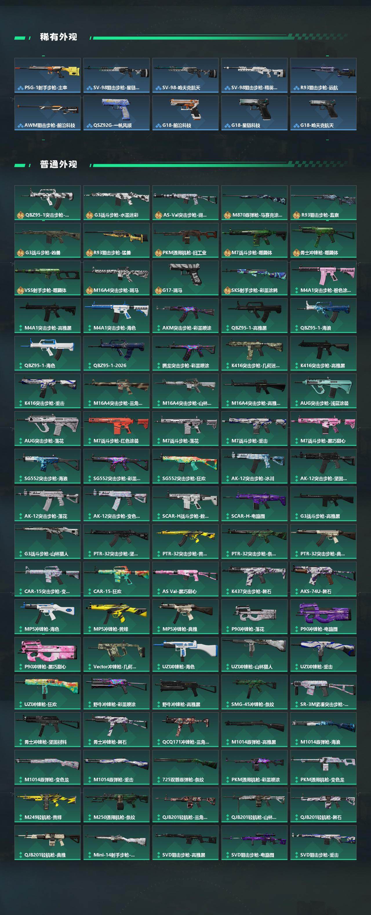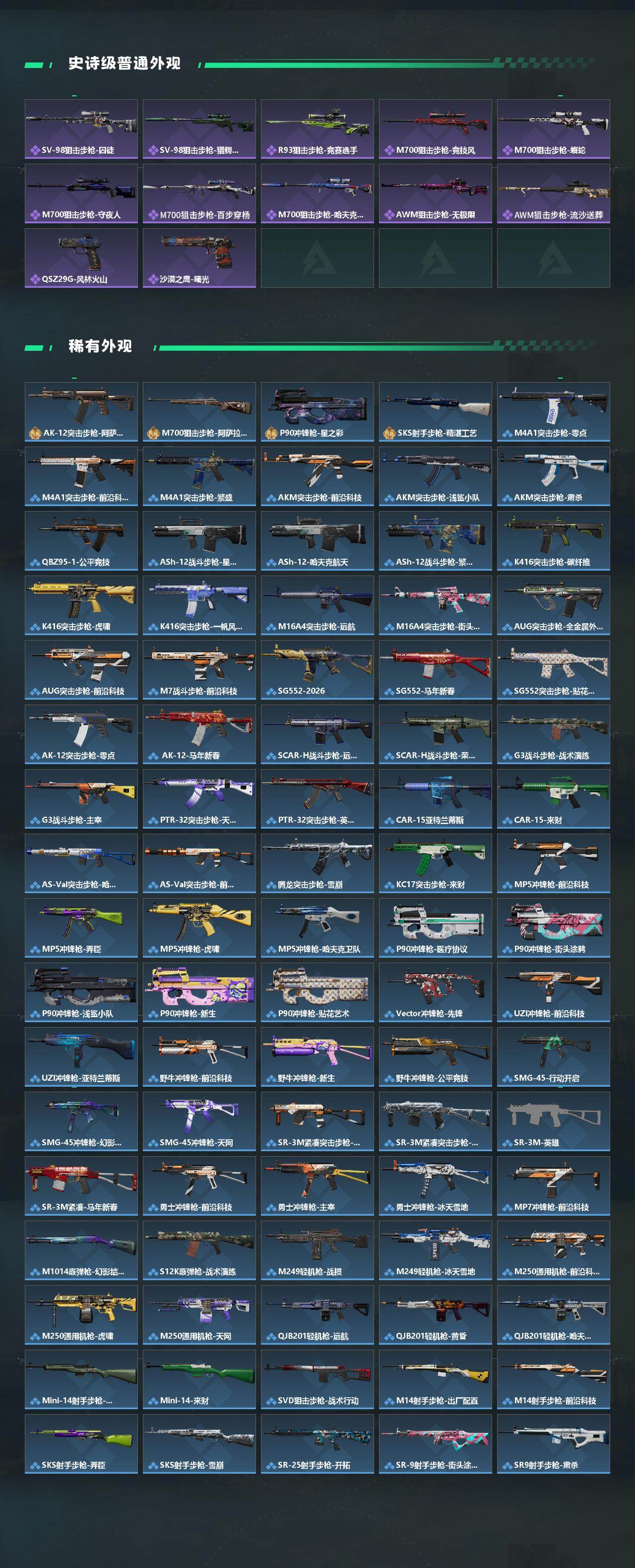 【传说外观】:M4A1突击步枪-蚀金玫瑰,M4A1突击步枪-阿米娅,QBZ95-1突击步枪-凌霄戍卫,ASh-12战斗步枪-鹅鸭杀,AUG突击步枪-悠然茶歇,SG552突击步枪