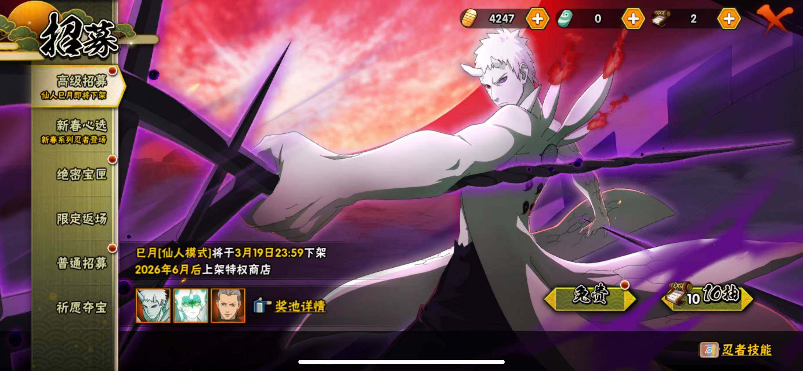 【S级忍者】:宇智波斑「秽土转生·解」(3星),艾「忍界大战」(3星),宇智波鼬「须佐能乎」(3星),宇智波止水「须佐能乎」(3星),旗木卡卡西「须佐能乎」(3星),千手柱间「木叶创立」(3星),自来也「舞之豪杰」(3星),波风水门(3星),佩恩「天道」(3星),宇智波佐助「永恒万花筒」(3星),宇智波斑 「白面具」(3星宇智波斑「白面具」),大