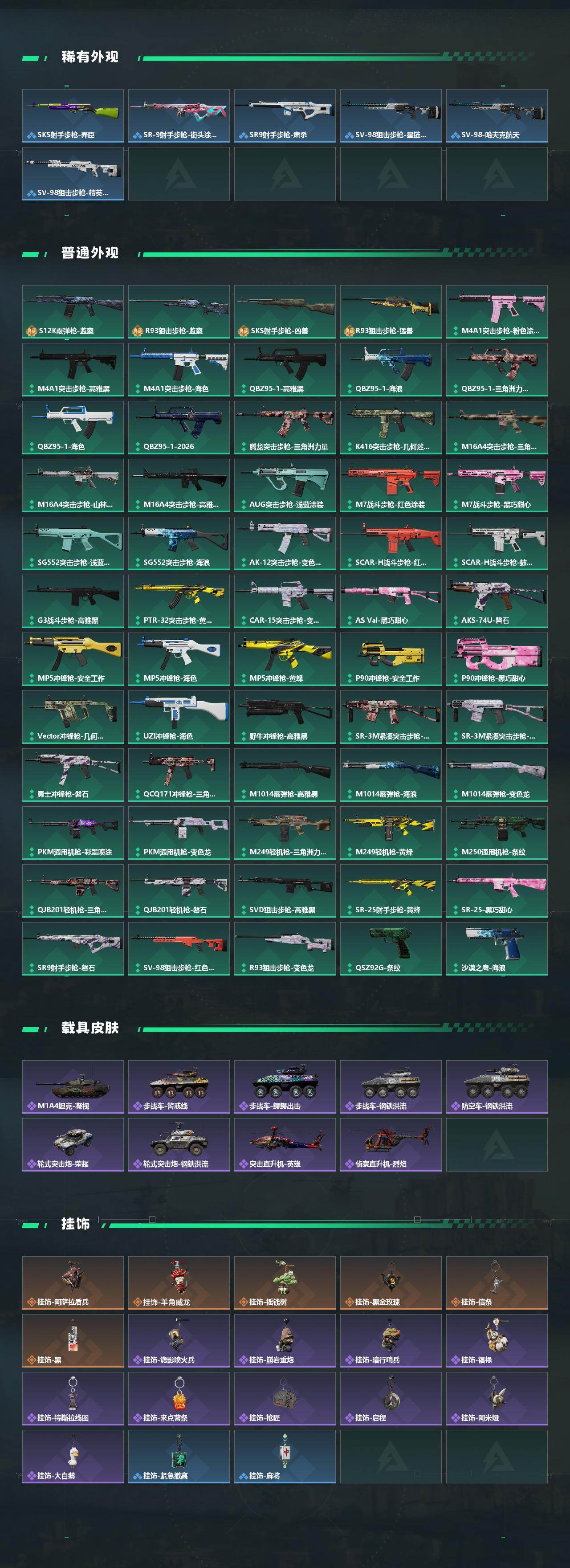 【传说外观】:M4A1突击步枪-蚀金玫瑰,M4A1突击步枪-阿米娅,ASh-12战斗步枪-鹅鸭杀,M7战斗步枪-怜悯,SG552突击步枪-运动员,AK-12突击步枪-特斯拉线圈,SCAR-H战斗步枪-启航,CAR-15突击步枪-阿米娅,腾龙突